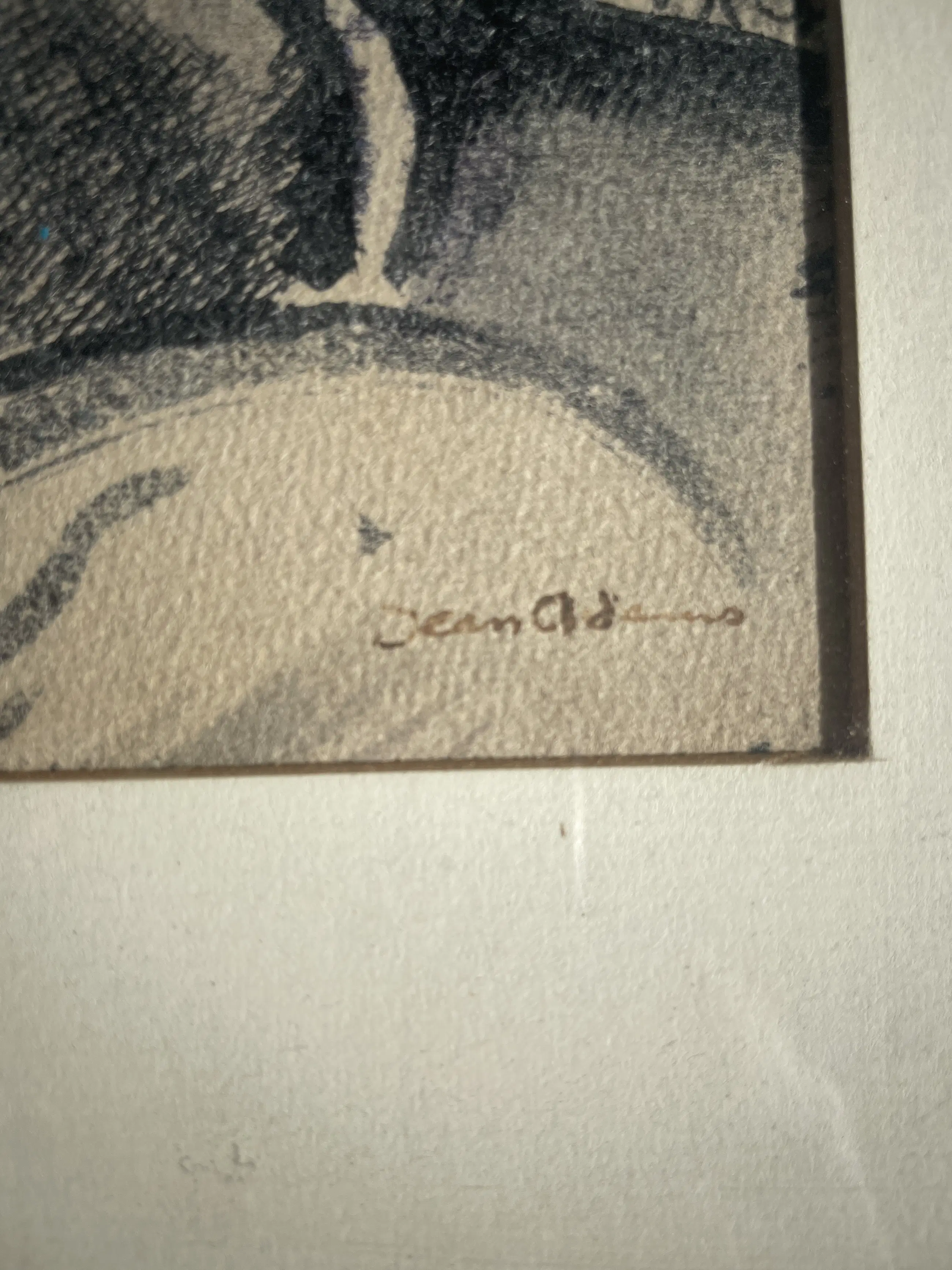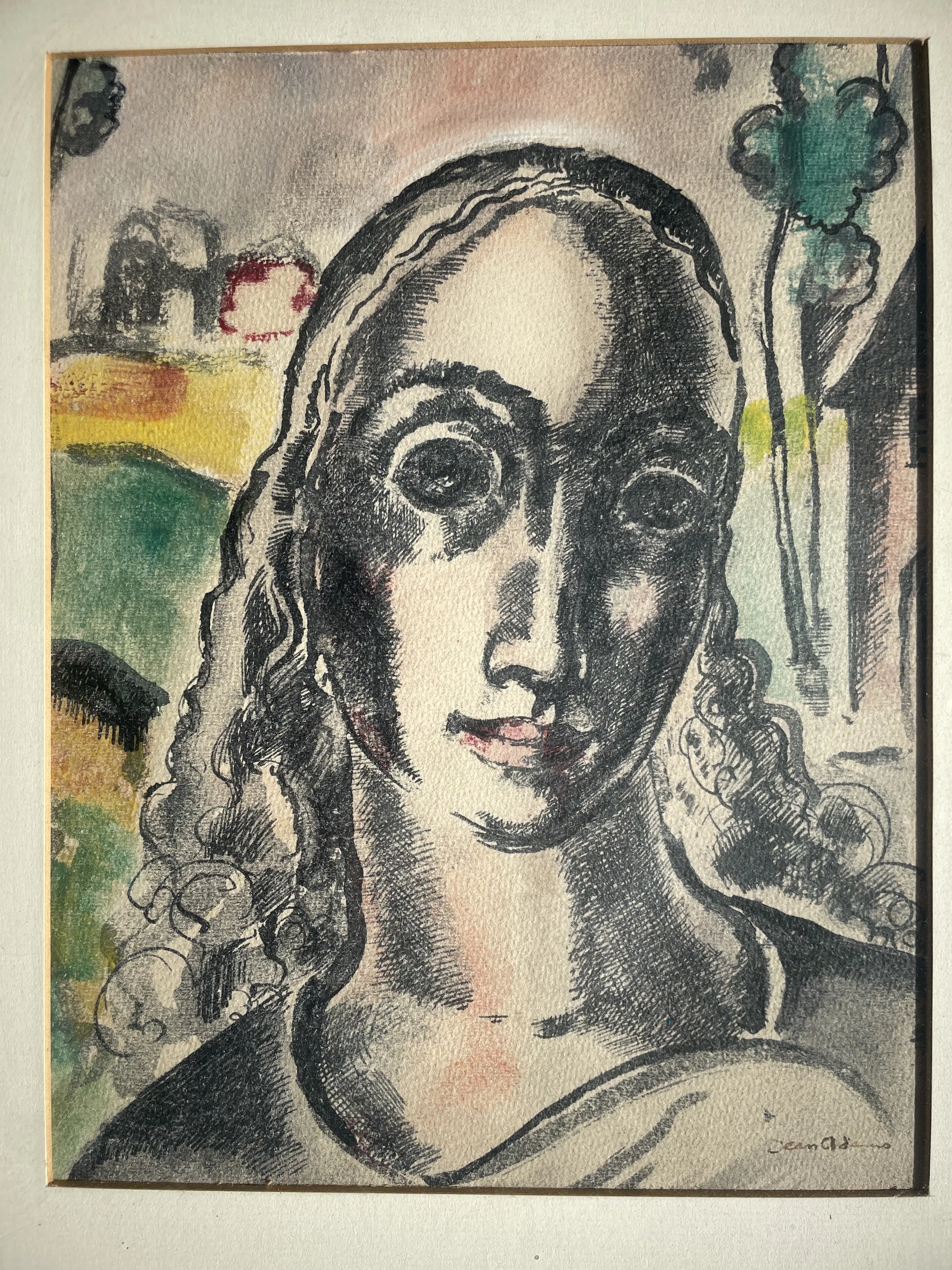 Titel: Portret van een jonge vrouw Kunstenaar: Jean Adams (1899–1970) Techniek: Kleurenlithografie op papier Gesigneerd: Rechtsonder met potlood of pen “Jean Adams” Datering: ca. 1940–1955 Afmetingen werk: ca. 22 × 28 cm (zichtmaat) Afmetingen lijst: ca. 35 × 43 cm Inlijsting: Origineel ingelijst in houten lijst met passe-partout