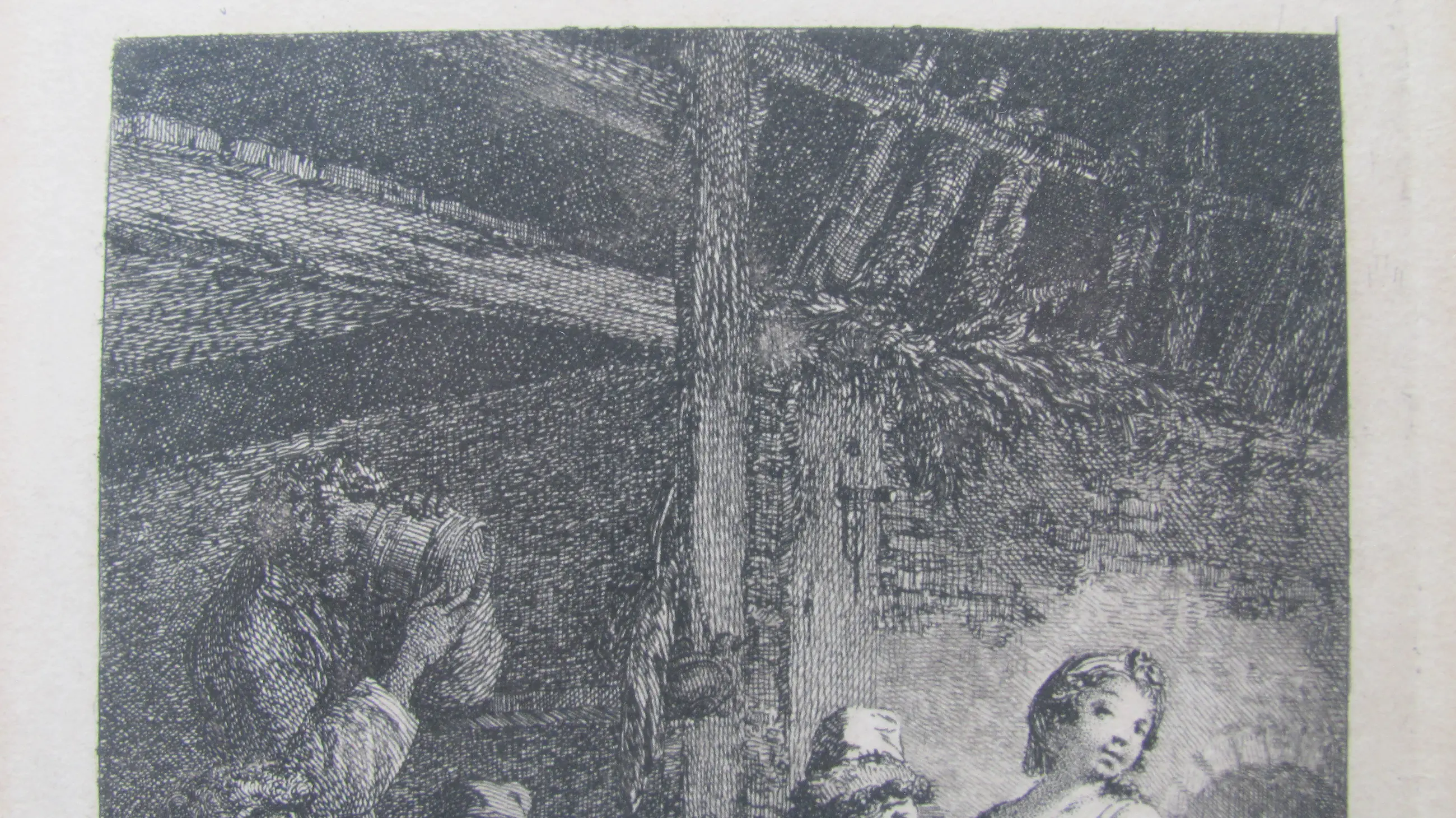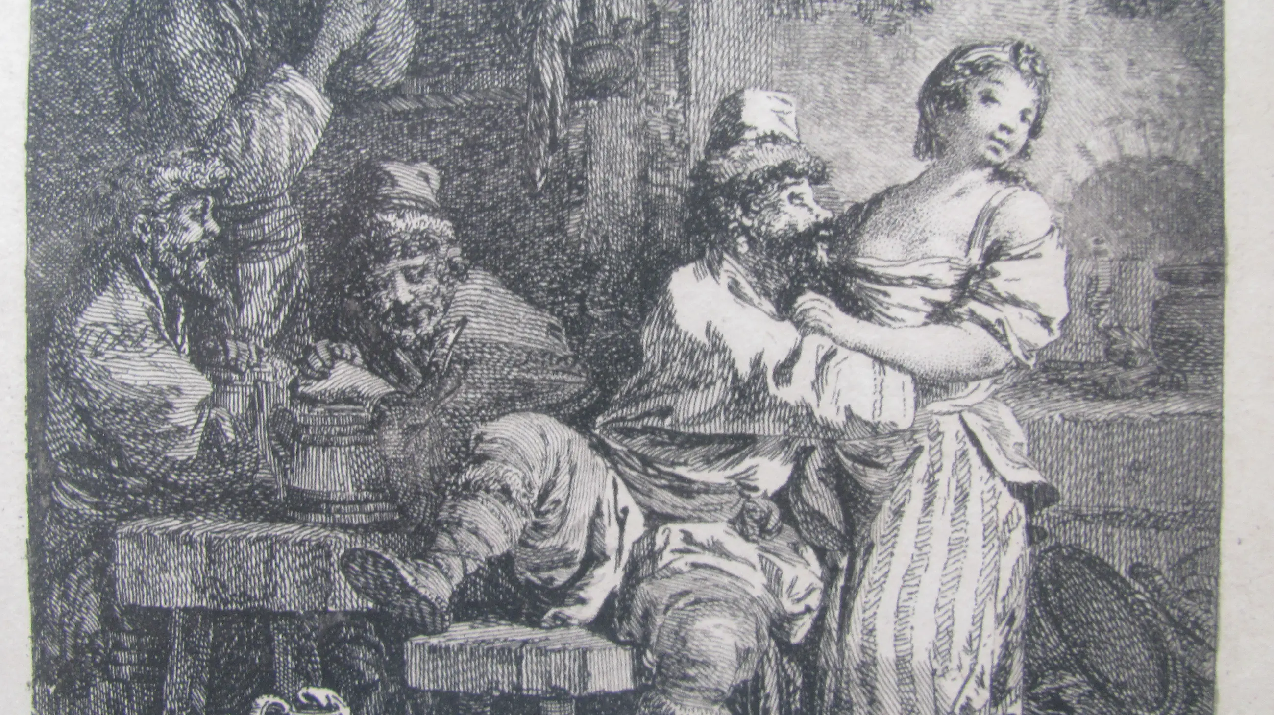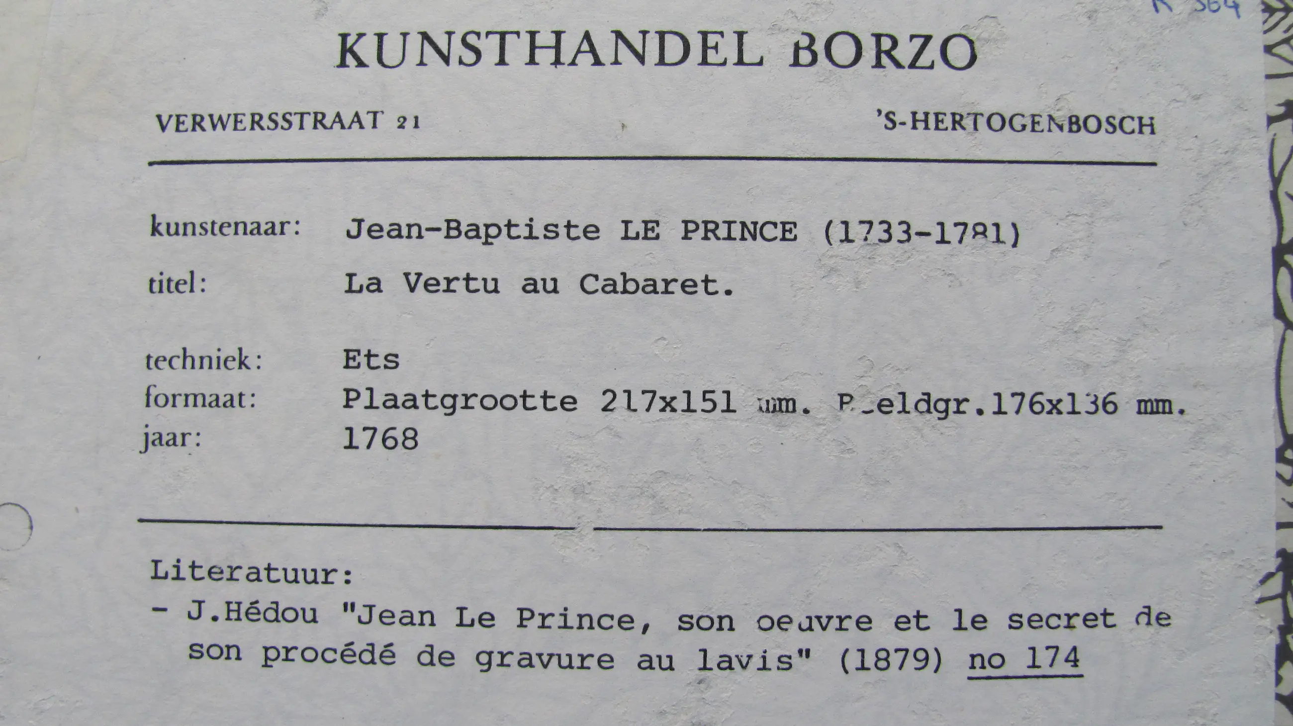 Licht erotische kroegscene van Jean-Baptiste le Prince. Ets, lijst, passepartout en ontspiegelend glas in prima staat.