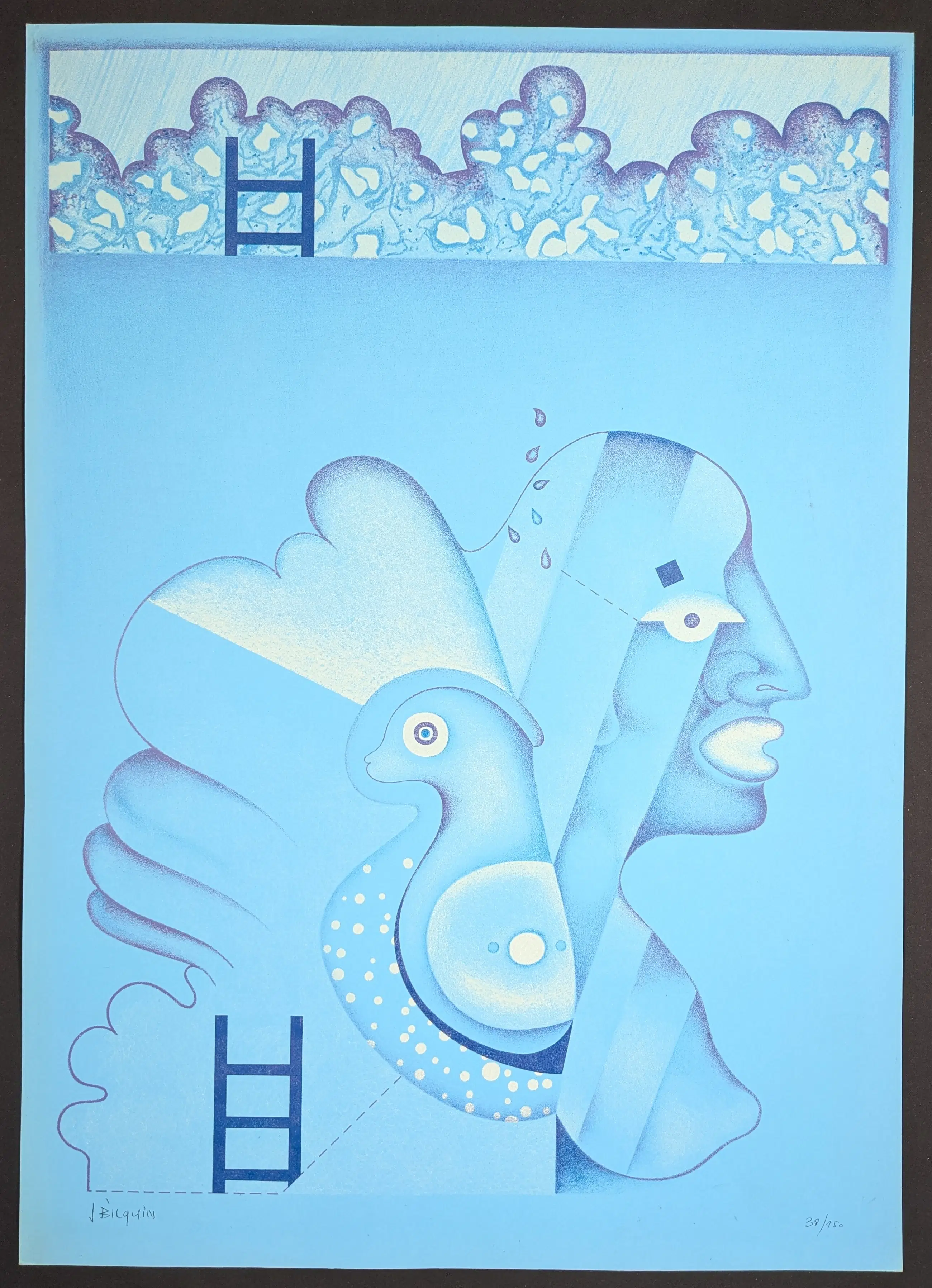 Een prachtige, typische compositie door Jean Bilquin, vooral uitgevoerd in witte en blauwe inkt op een blauwgekleurd papier. Het werk is gesigneerd en genummerd 38/150 in inkt.