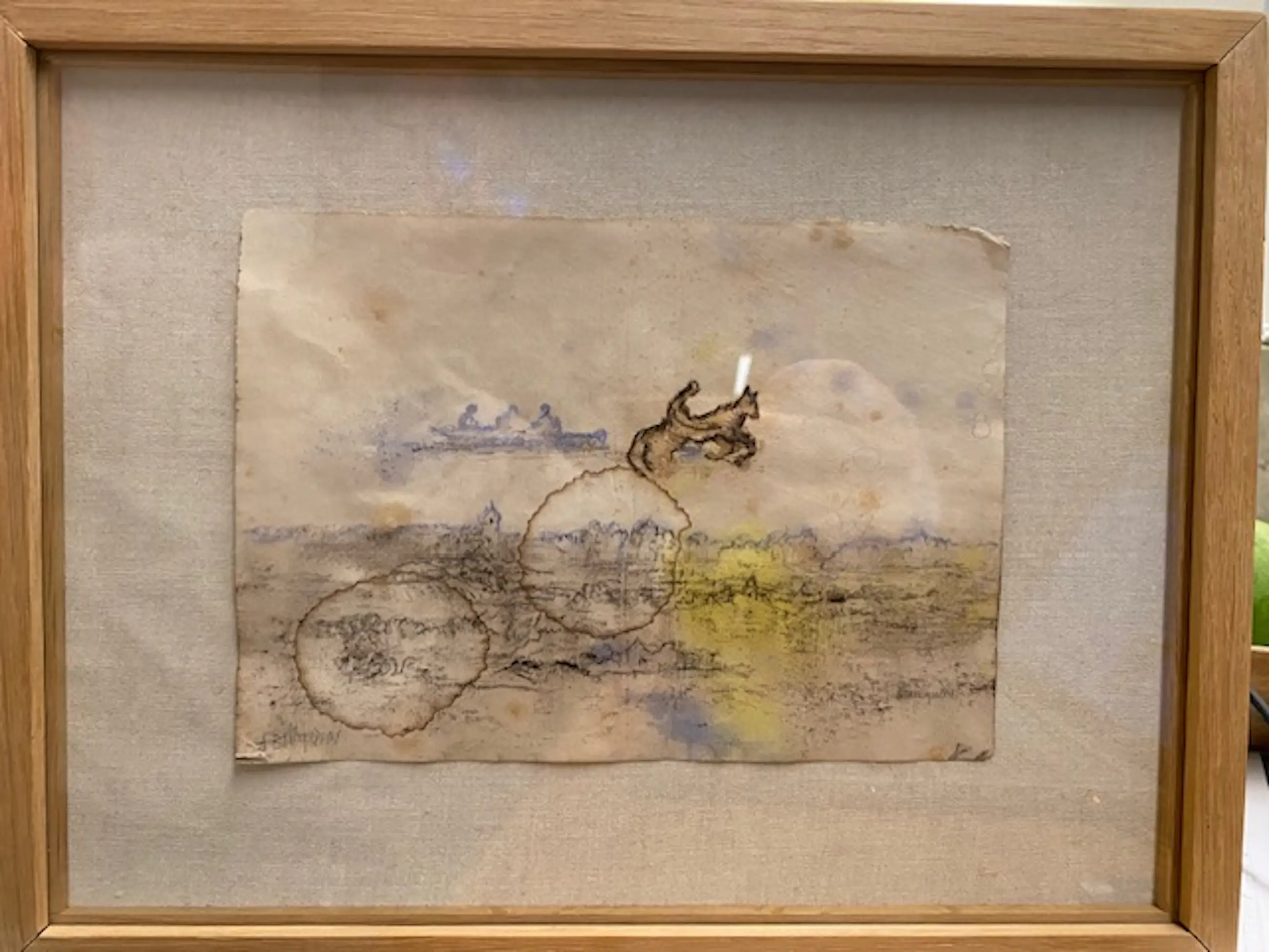 Thema van het werk is 'mens en dier' in een metafysische benadering. Stijlvol ingekaderd in een fijn blank-houten kader. Heel decoratief.