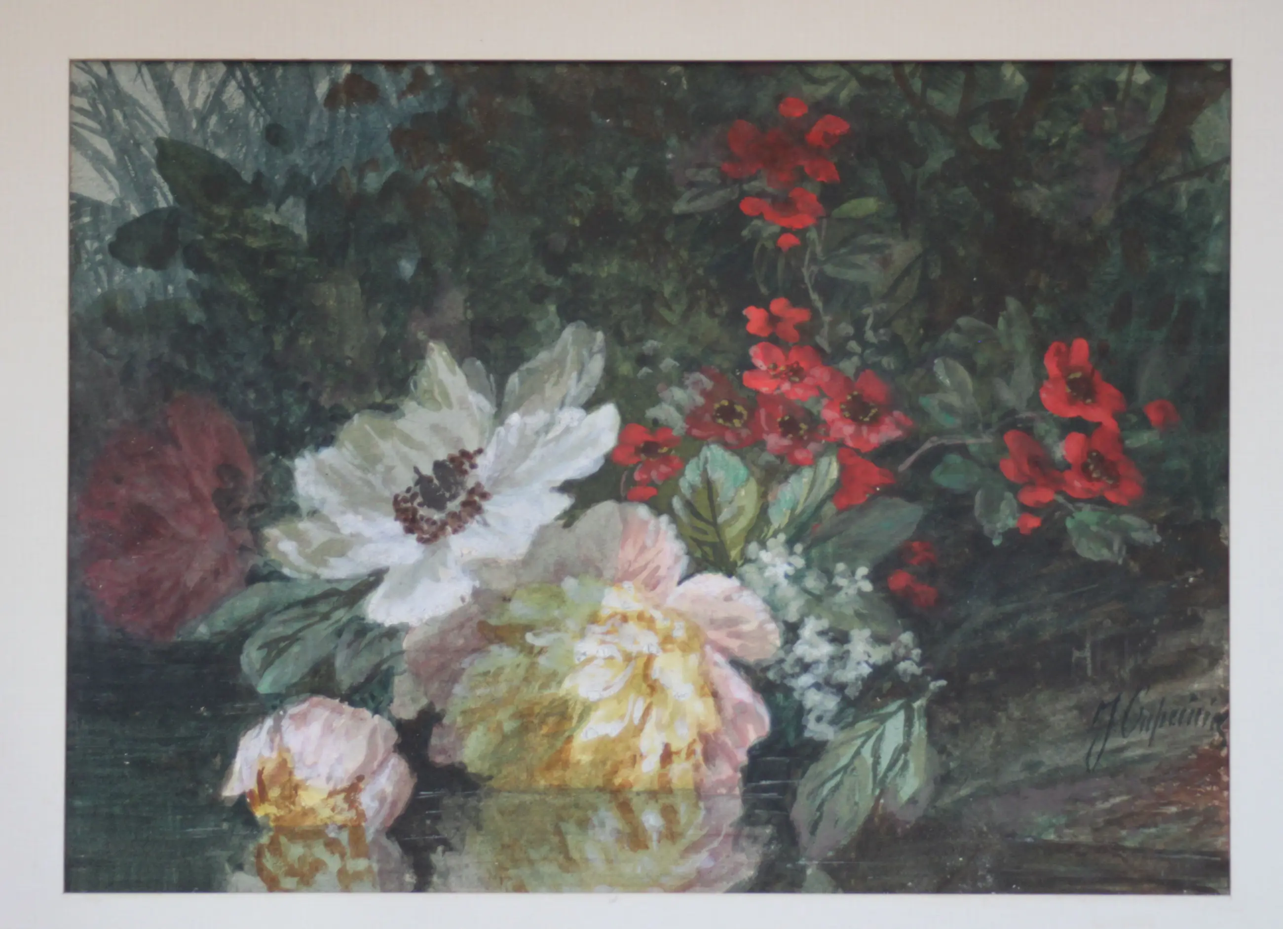 Bloem stilleven. Capeinick is bekend om zijn bloemen-schilderijen. Hier worden de bloemen weerspiegeld in het water. De stijl is laat romantisch en neigt naar het " fin de siecle".