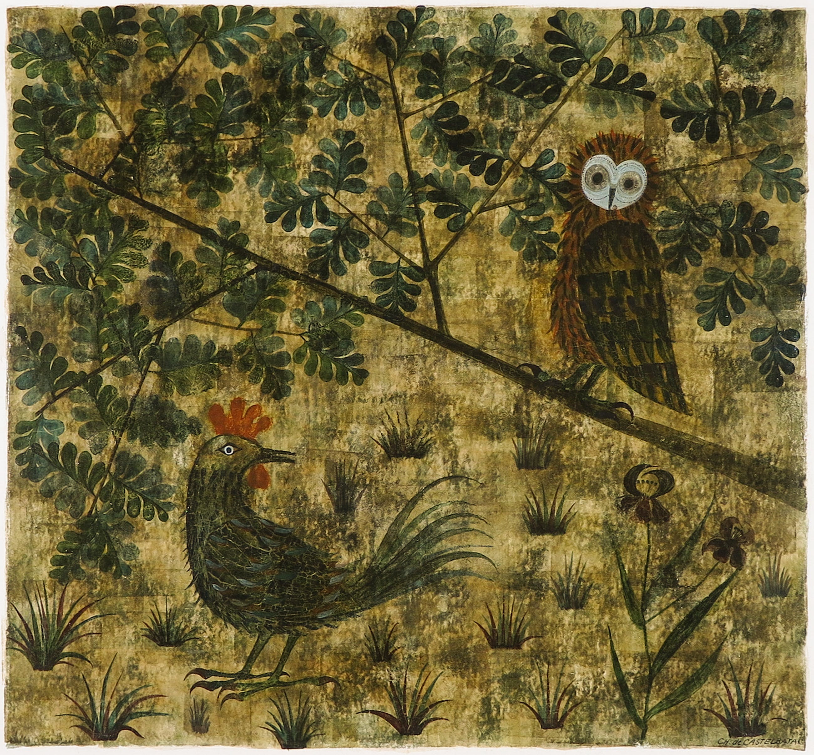 Schildering in gouache, achter een dikke (glimmende) laag vernis.