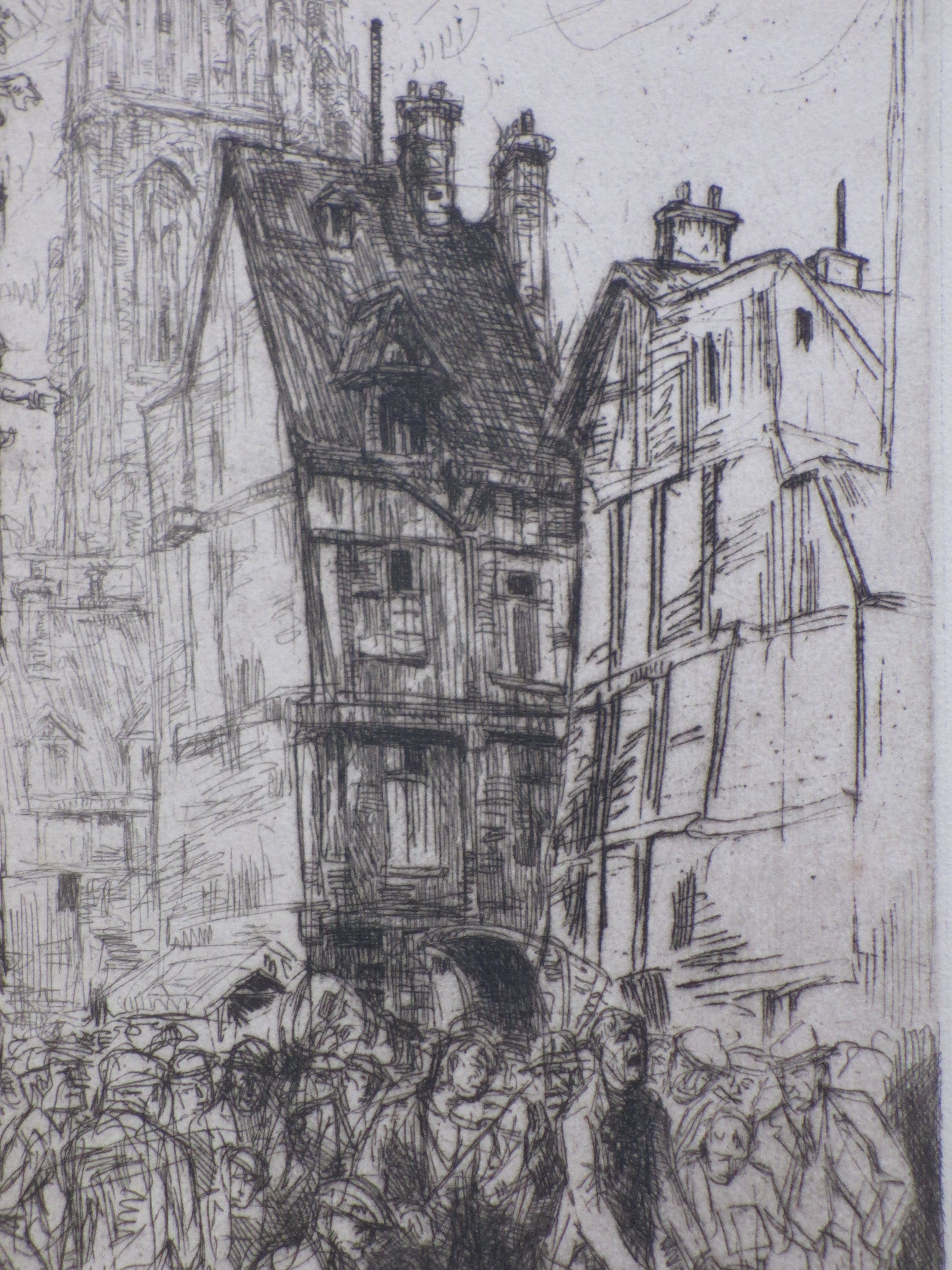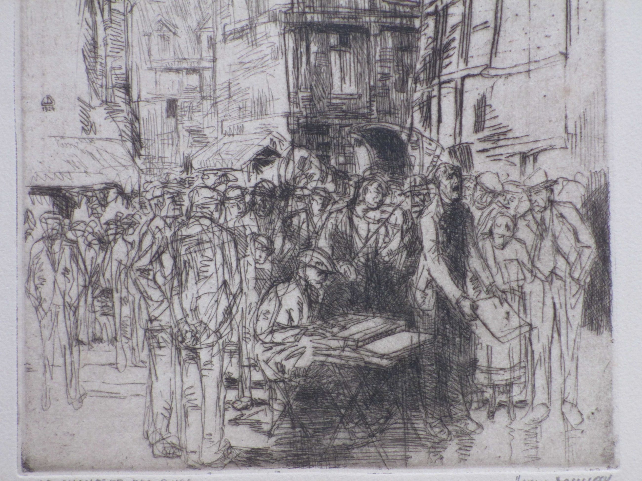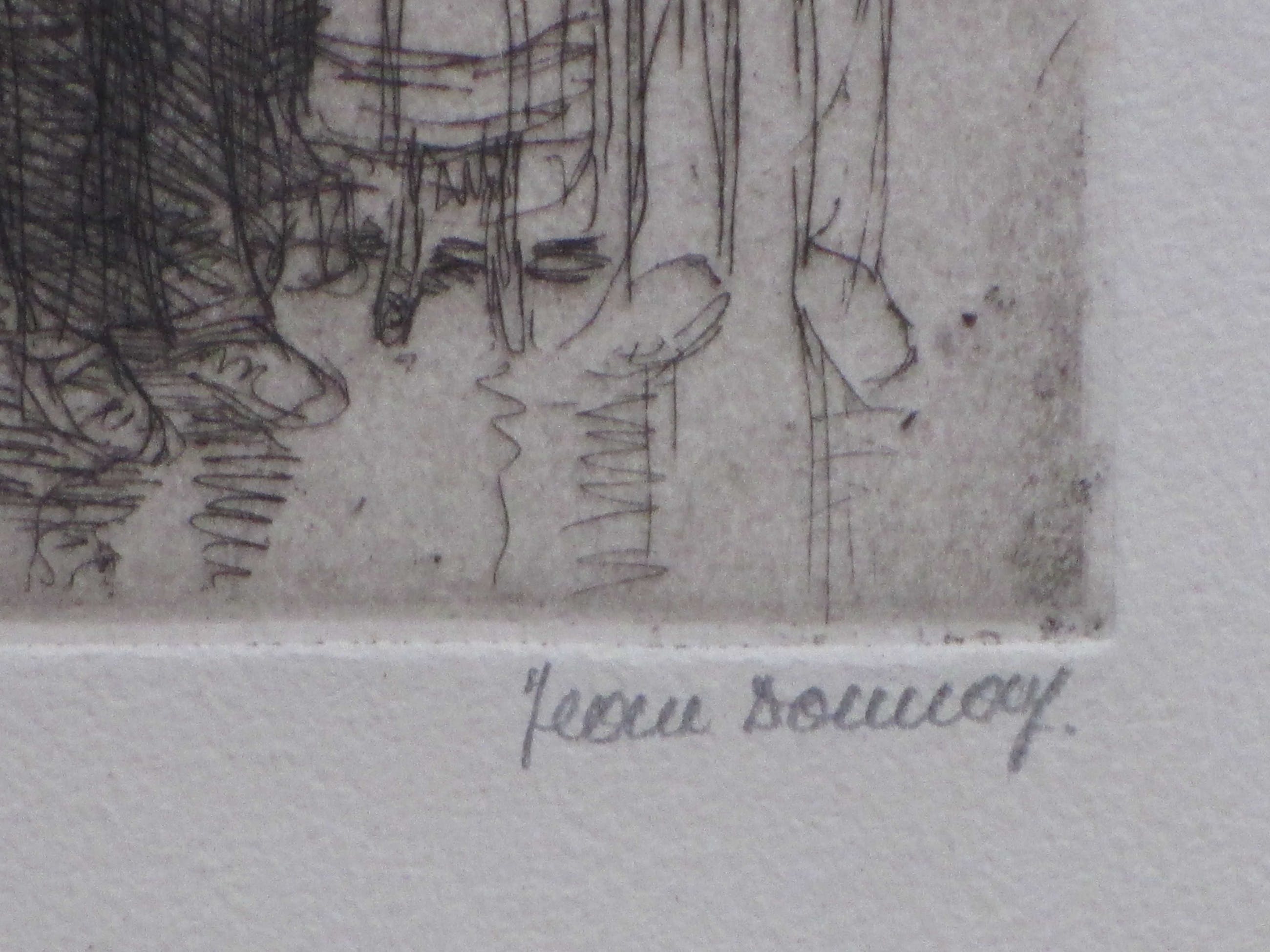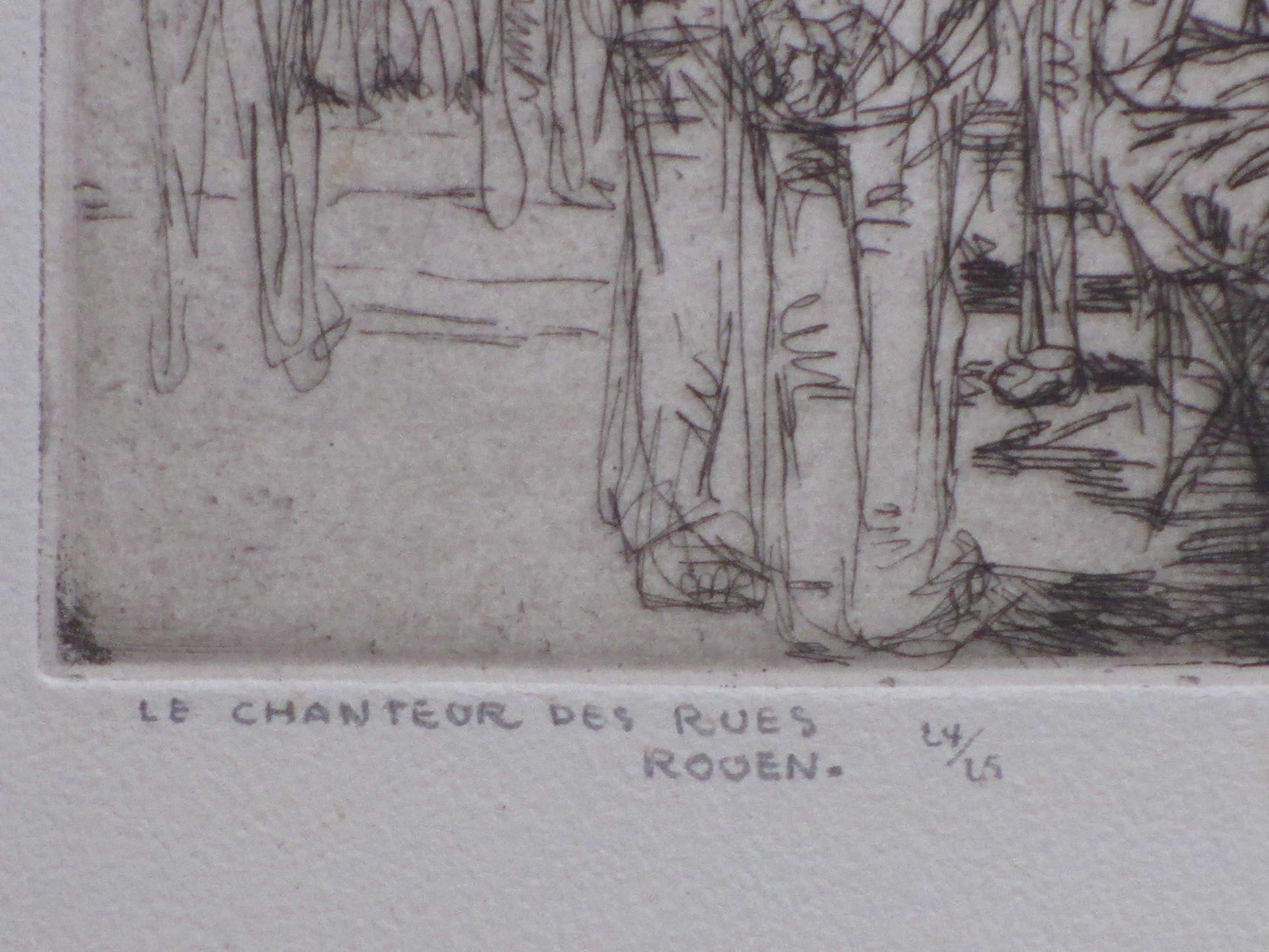 Ets door Jean Donnay. Voorstelling van een straatzanger in Rouen. Losbladig, beeldmaat 40x20, bladmaat 50x33 Gesigneerd in potlood r.o.: 'Jean Donnay' Tevens gemonogrammeerd en gedateerd l.o.: 'Le chanteur des rues Rouen 24/25' Authenticiteit volledig gegarandeerd.