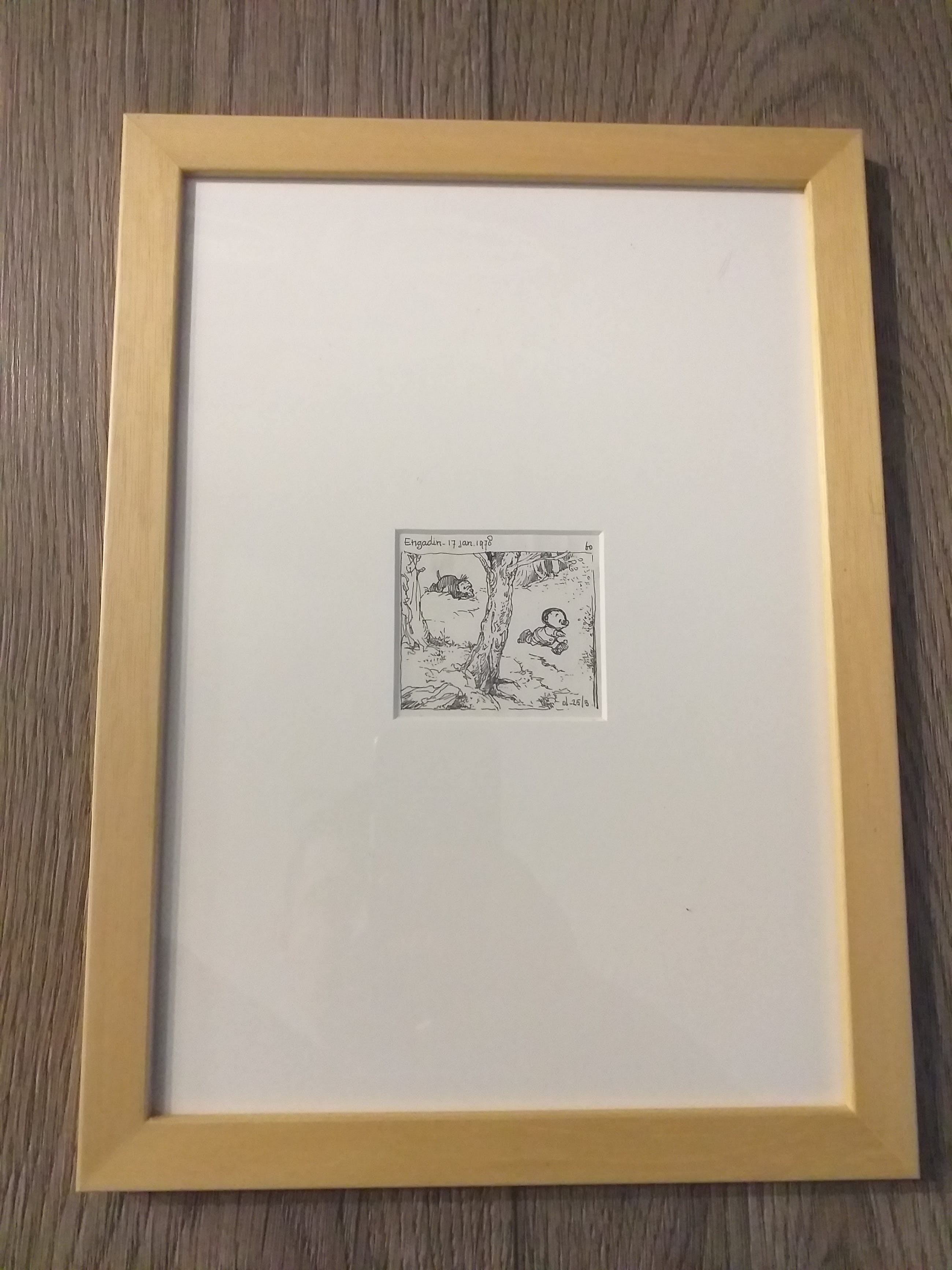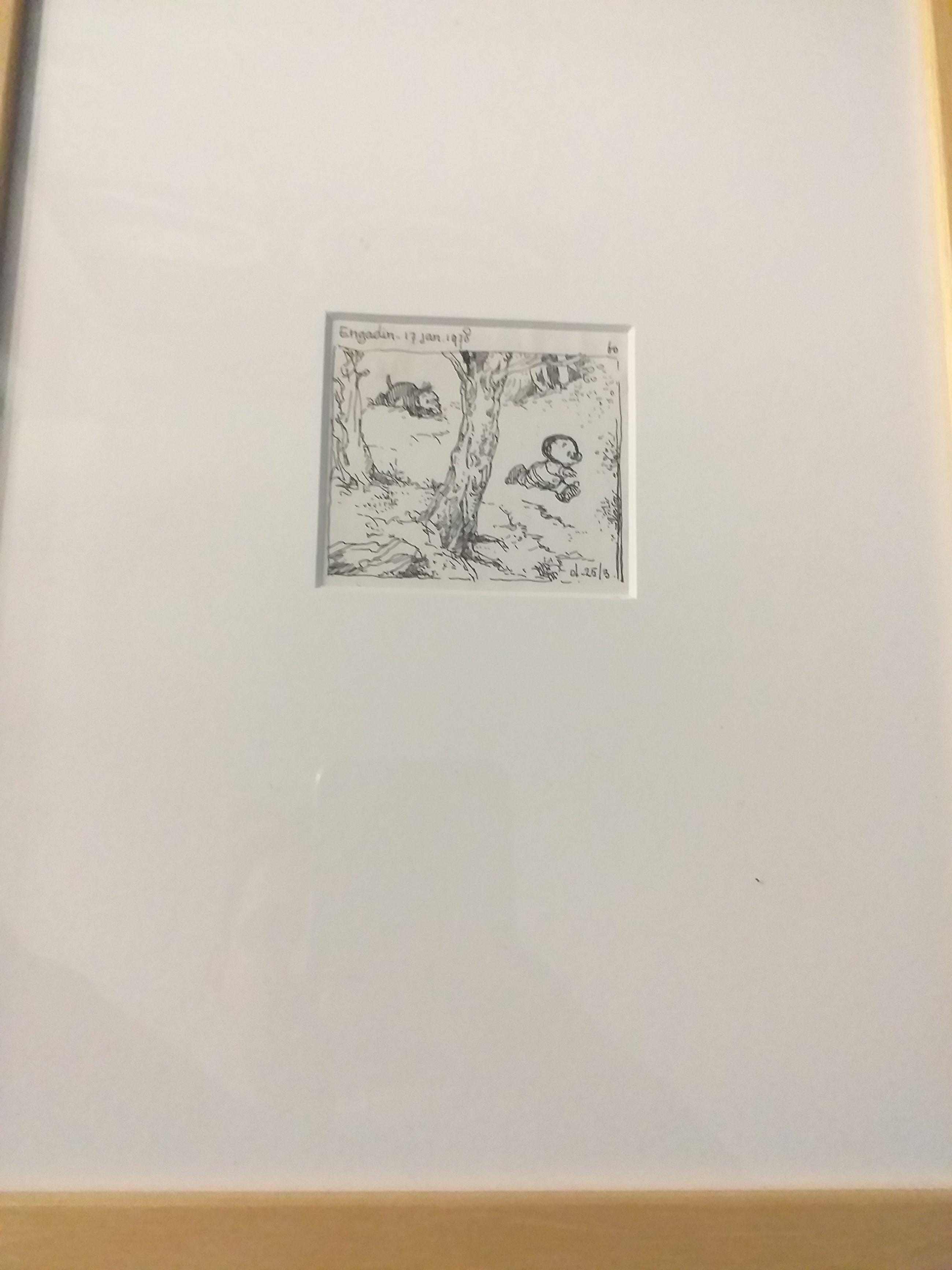 Tekeningetje van Paulus, rennend door het bos, Gregorius op de achtergrond. Bovenaan de tekening staat: Engadin 17 jan. 1978. Bijzondere mooie kwaliteit met rohtring (Oost Indische inkt). Heel mooi en fragiel getekend zonder enige correctie!