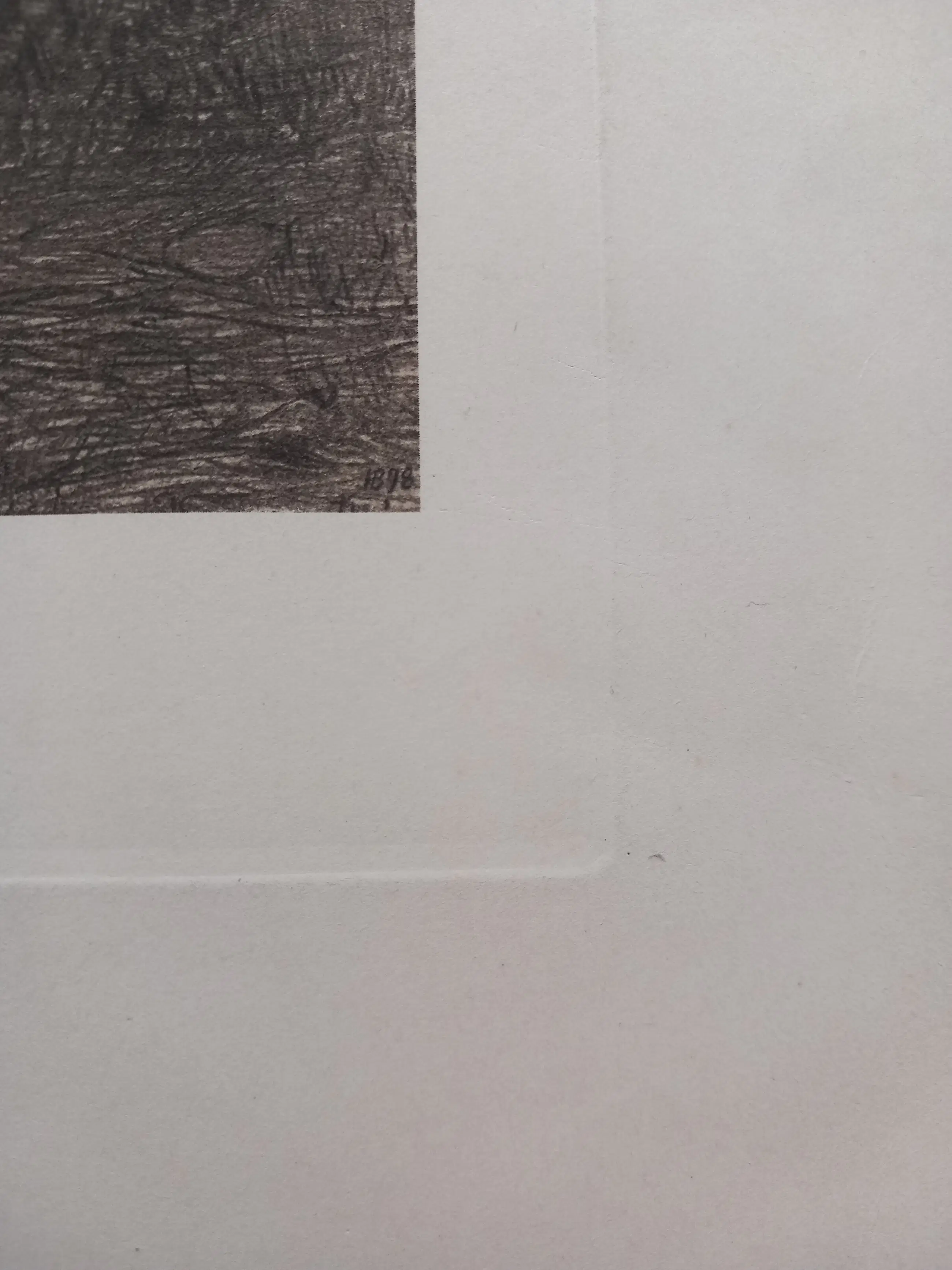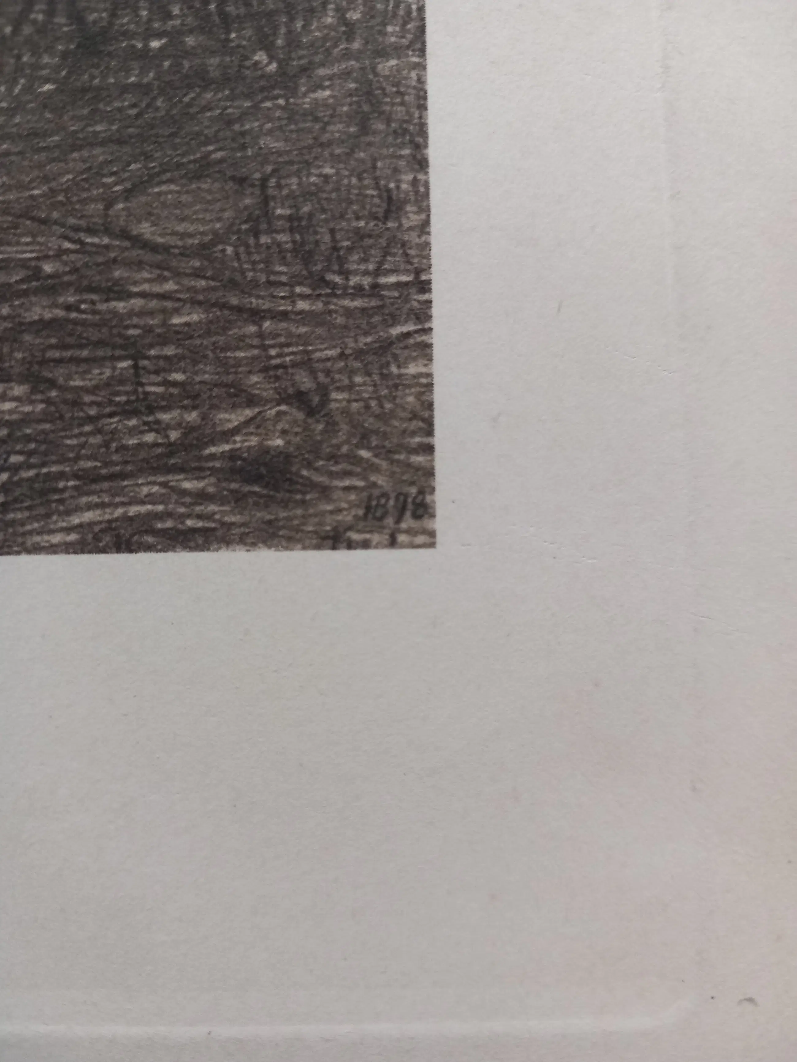 Het werk is duidelijk een originele afdruk van de koperen plaat – te herkennen aan de scherpe, diepe plaatindruk rondom de voorstelling, de rijke lijnenstructuur van ets en droge naald, en de kwaliteit van het papier. Dit is géén reproductie of tijdschriftplaat, maar een authentieke handmatige afdruk uit of kort na 1898.