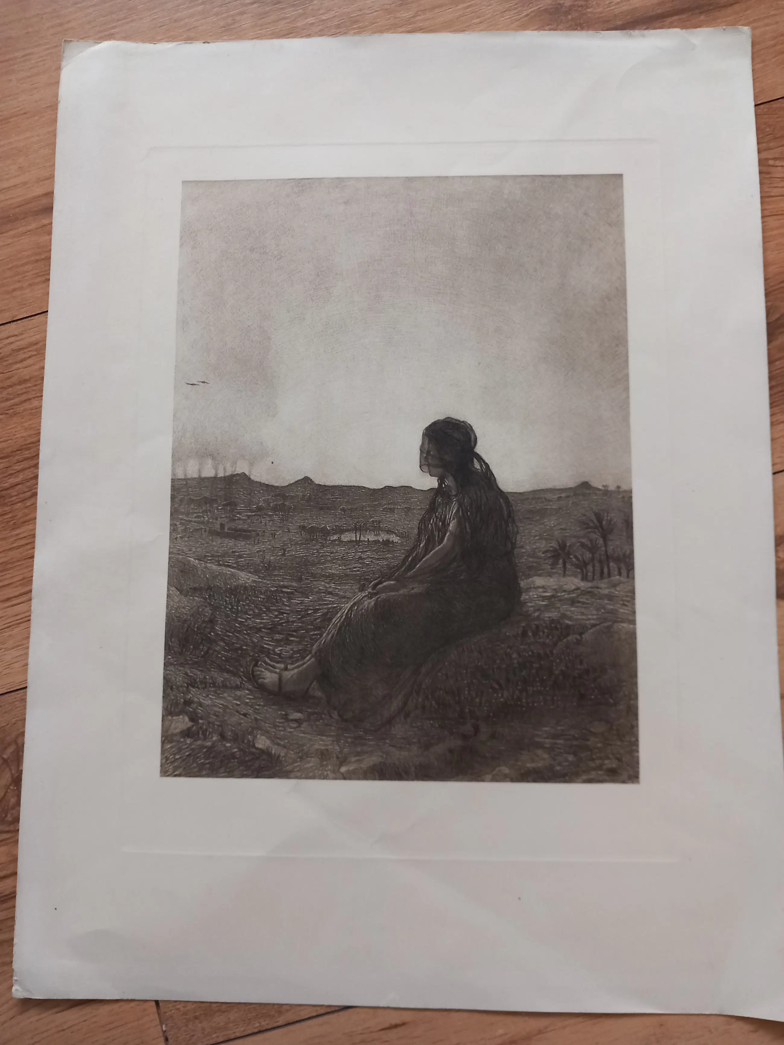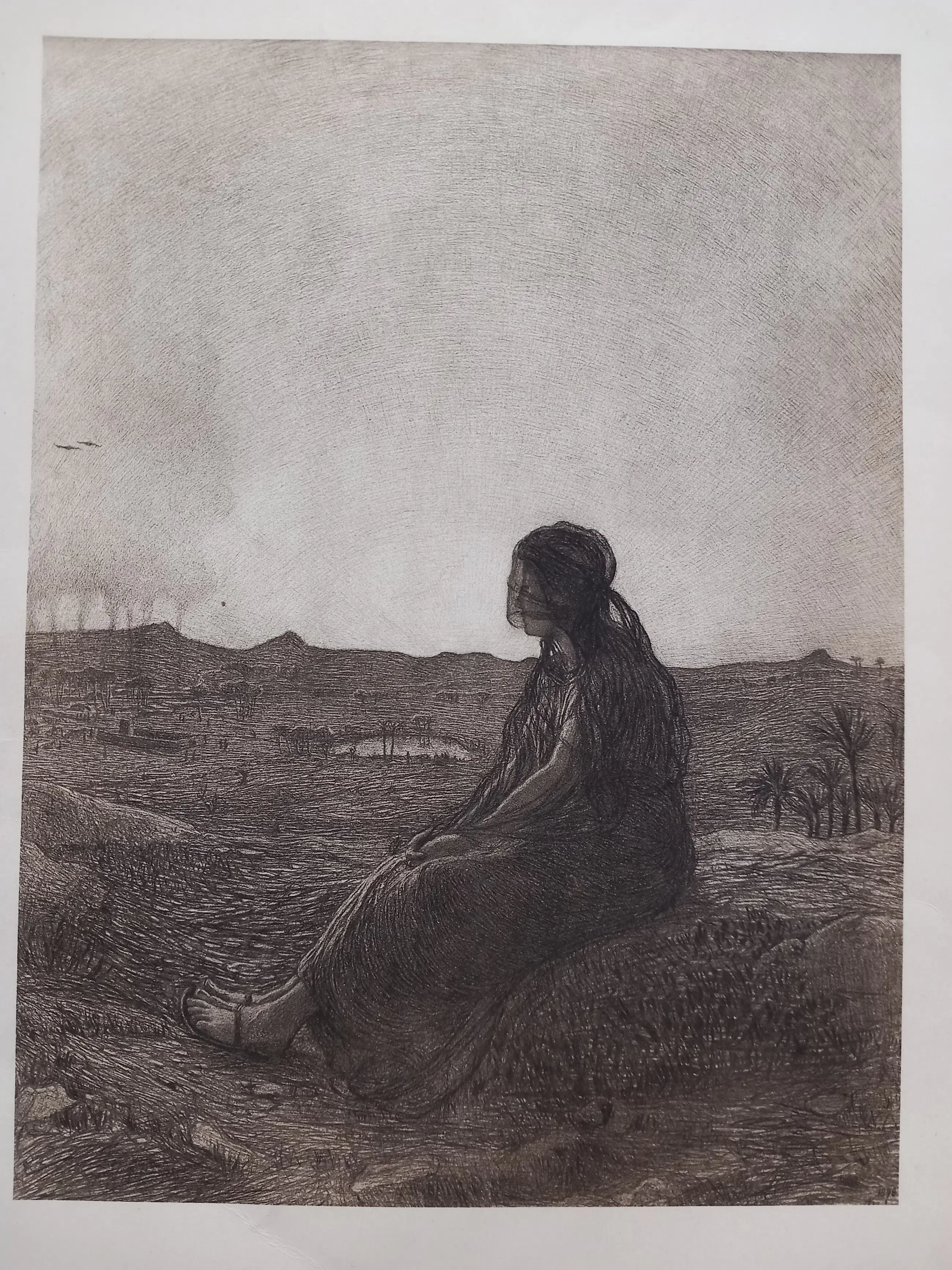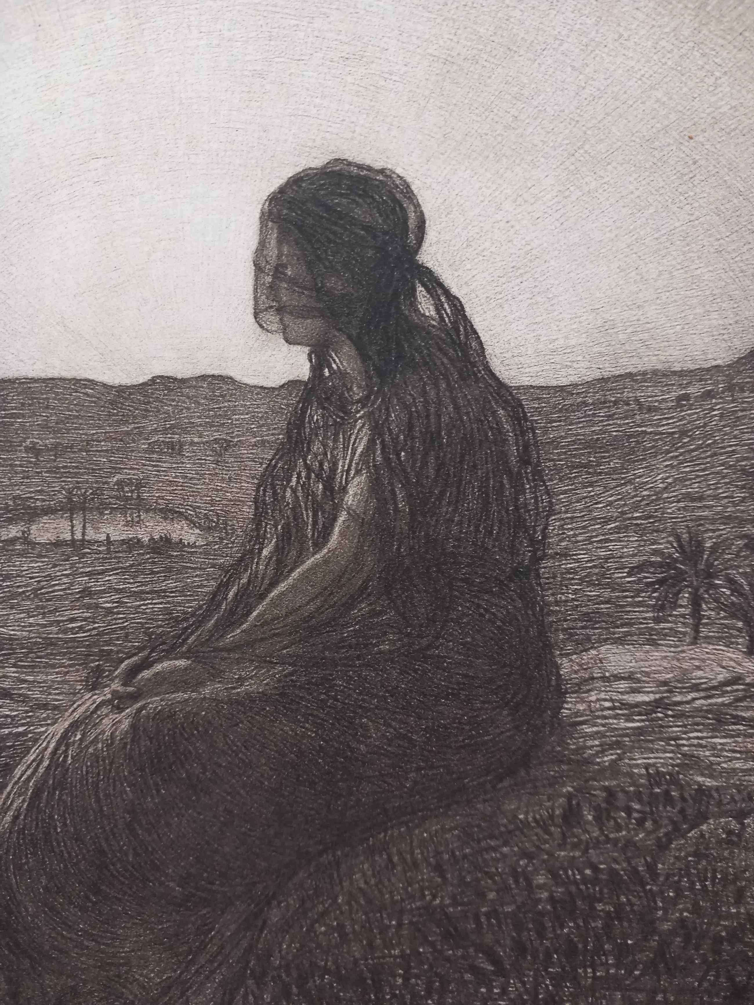 Prachtige originele ets van de Franse schilder-graficus Jean-François Raffaëlli, een belangrijk vertegenwoordiger van het laat-19e-eeuwse realisme. La Lépreuse is een van zijn bekendste sociaal-realistische prenten en toont een jonge vrouw, zittend in een leeg landschap, een verwijzing naar de historische afzondering van melaatsen.