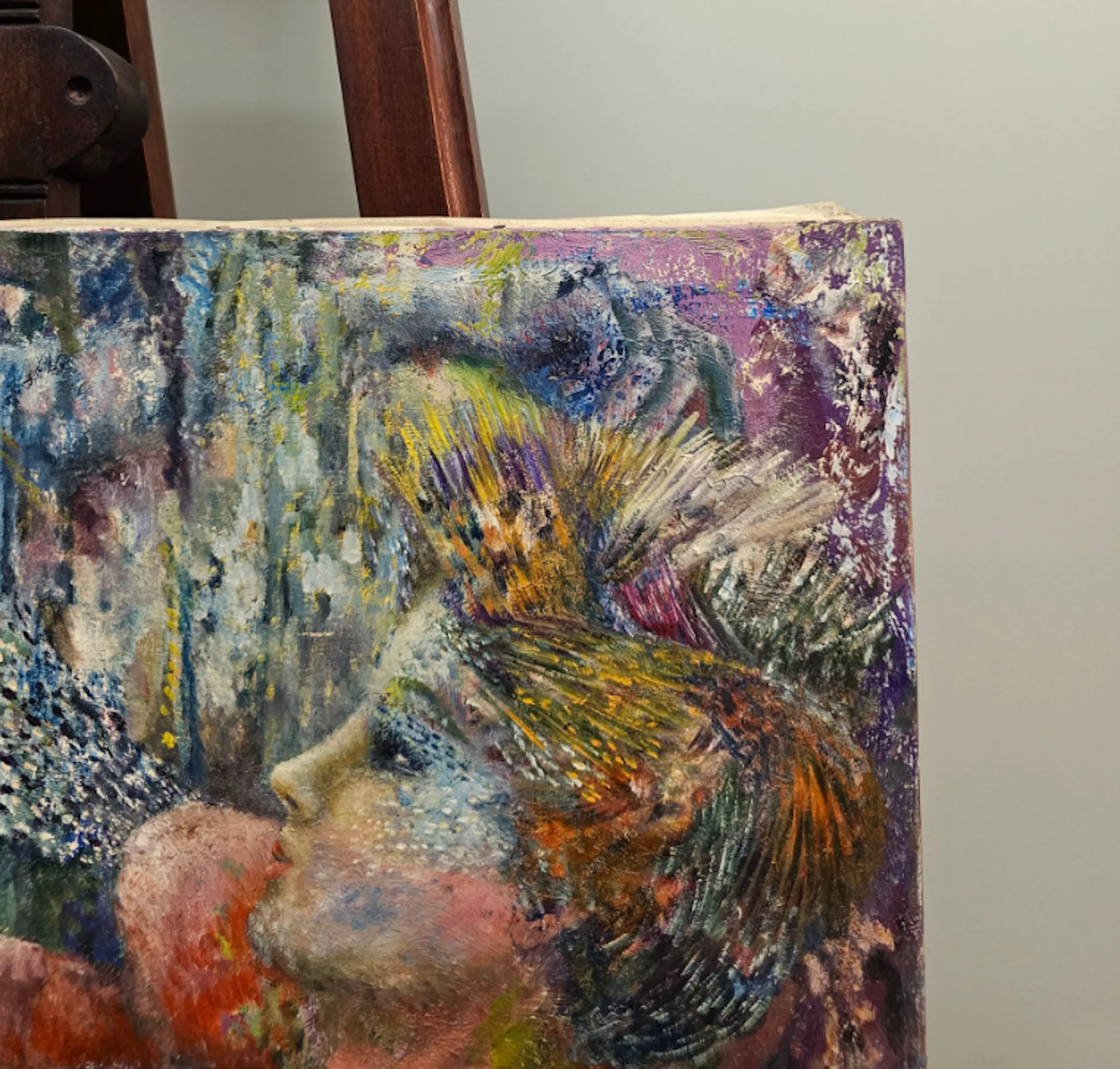 Schilderoppervlak: de verflaag is intact en vertoont geen zichtbare verfverlies of beschadigingen. De aanwezige structuur in de verf (impasto) maakt deel uit van de originele schildertechniek en is geen beschadiging.