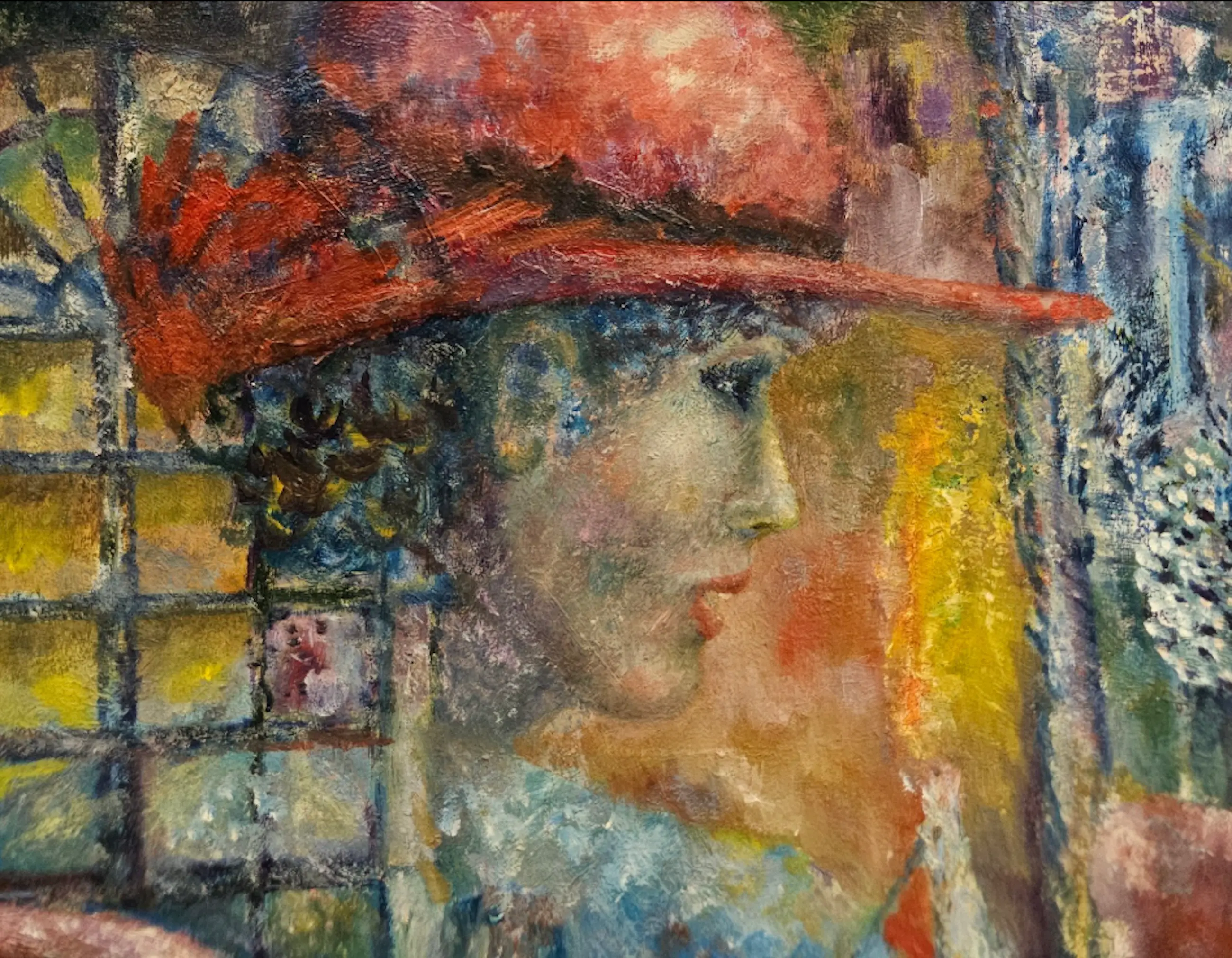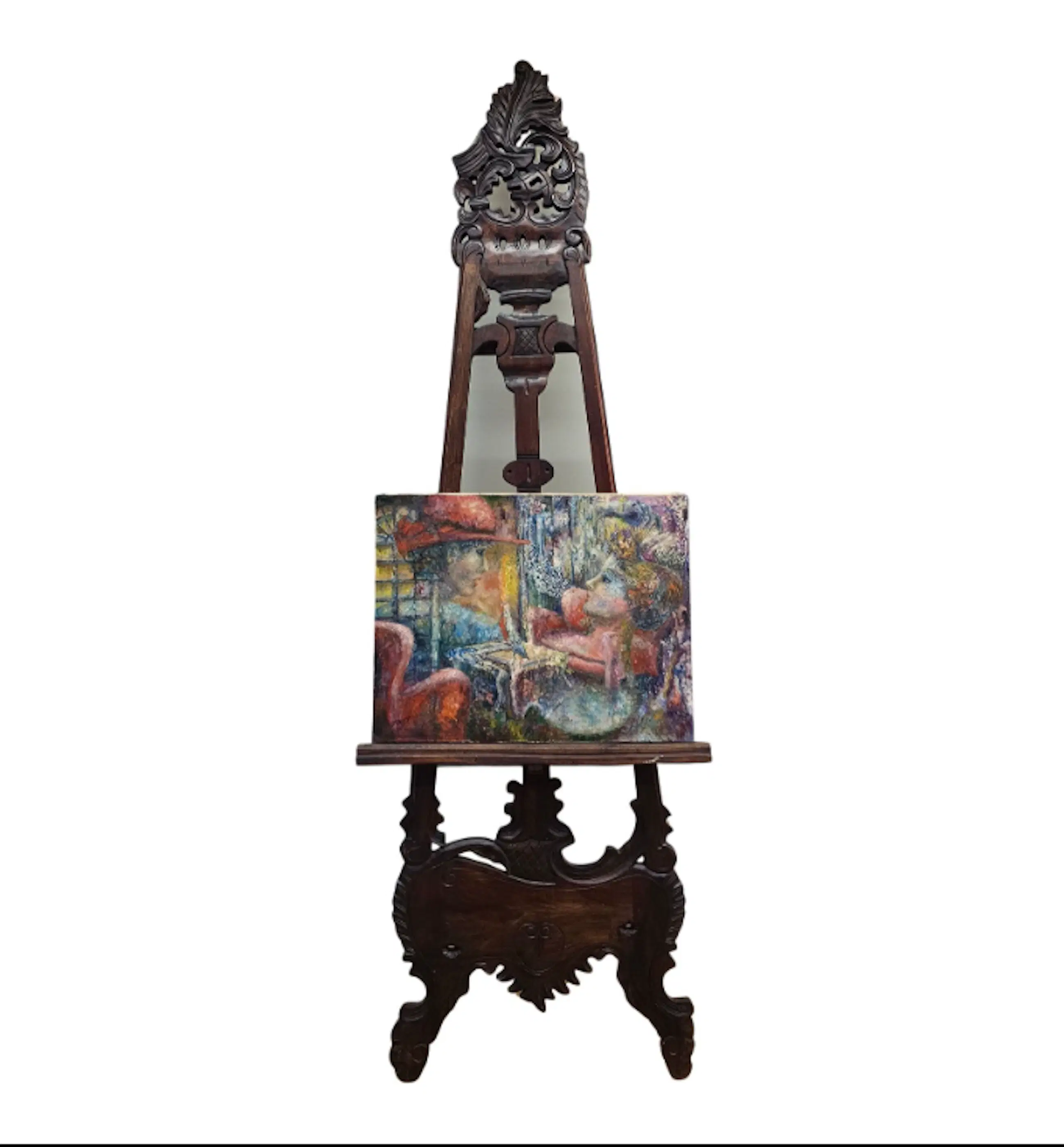 Een krachtige en expressieve compositie waarin twee figuren elkaar ontmoeten in een intieme interieurscène. Het werk wordt gekenmerkt door een levendige verfstructuur en een dynamisch kleurgebruik, waardoor een sterke sfeer van menselijke interactie ontstaat.