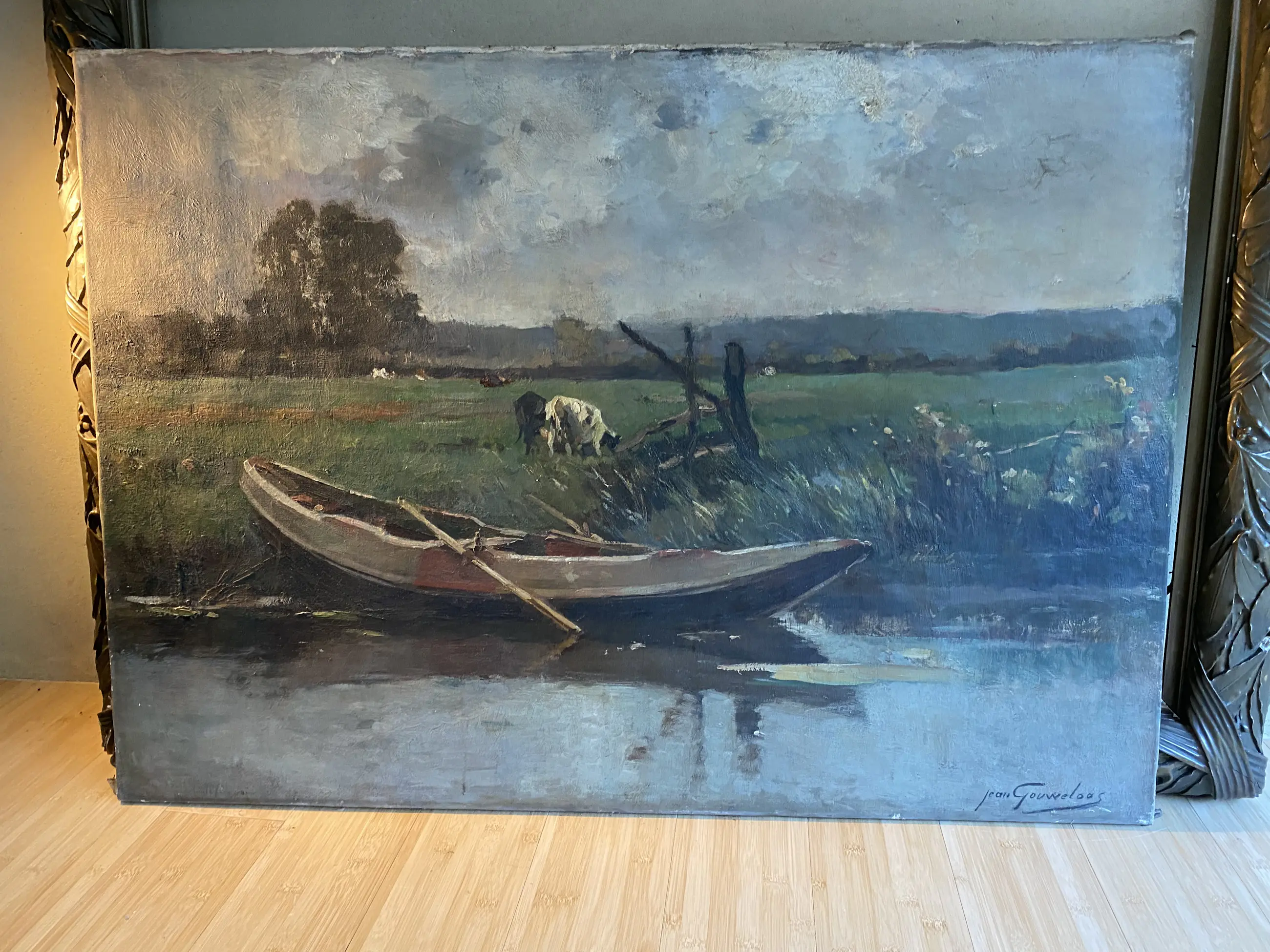Olieverfschilderij van Jean Gouweloos met een landschap van het platteland met een boot op een beekje.