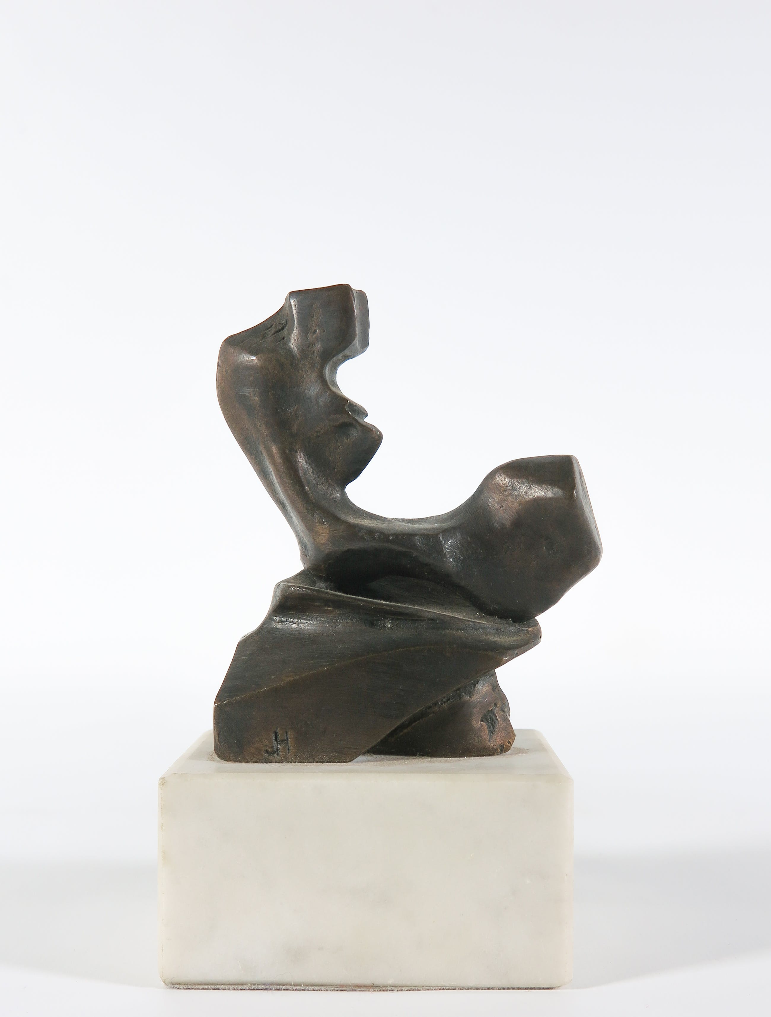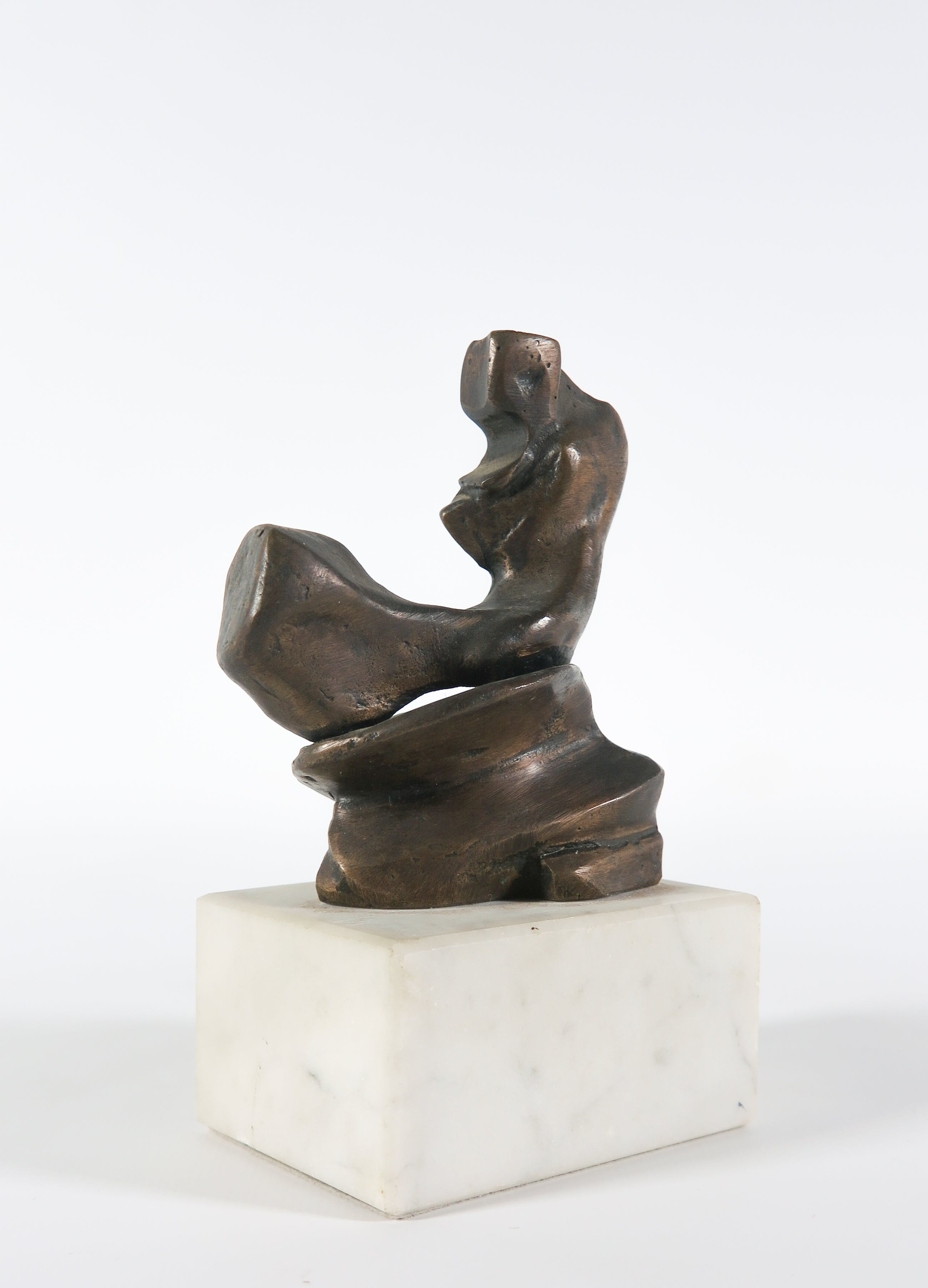Abstracte bronzen figuur op een wit marmeren voet. Gesigneerd langs de onderste rand.