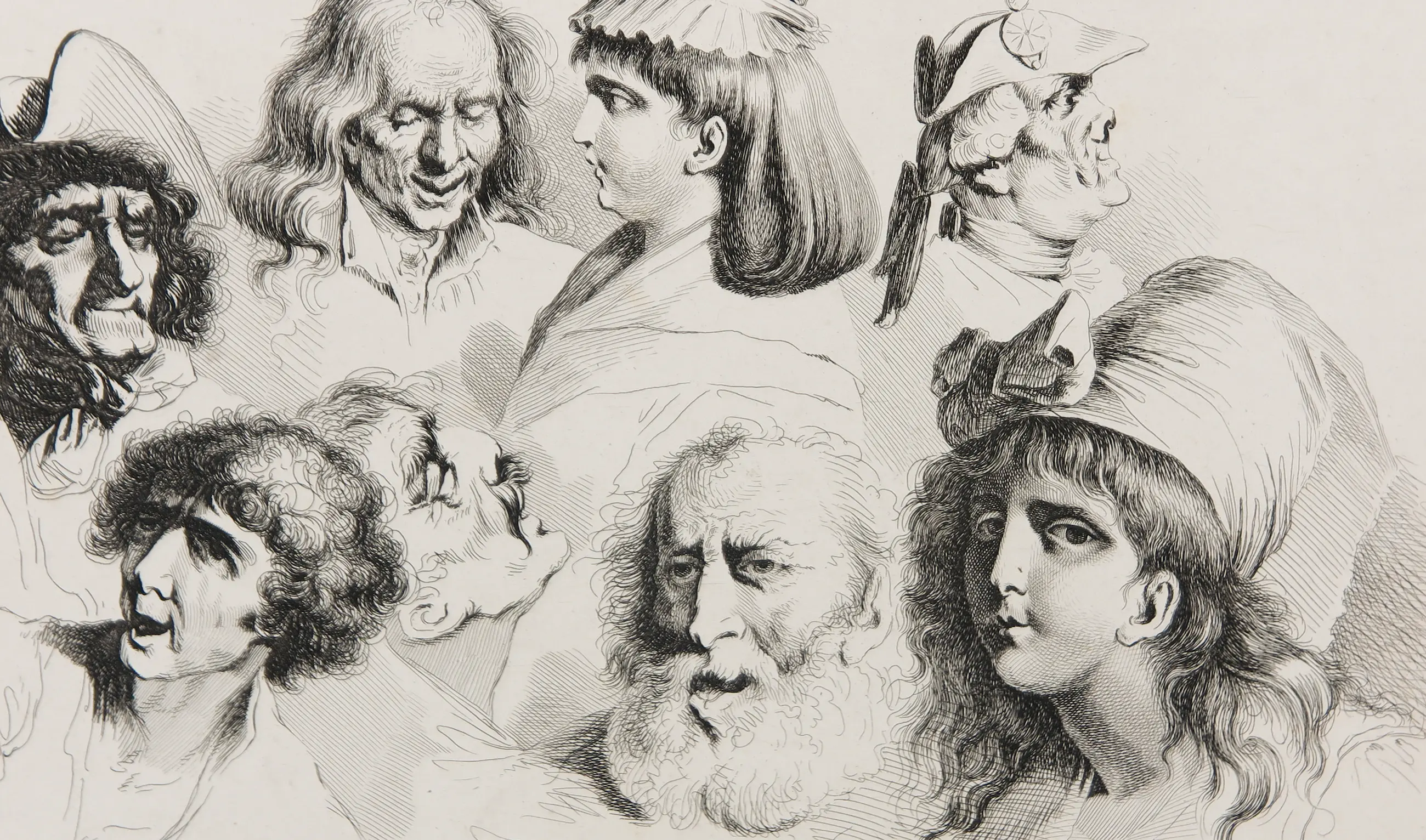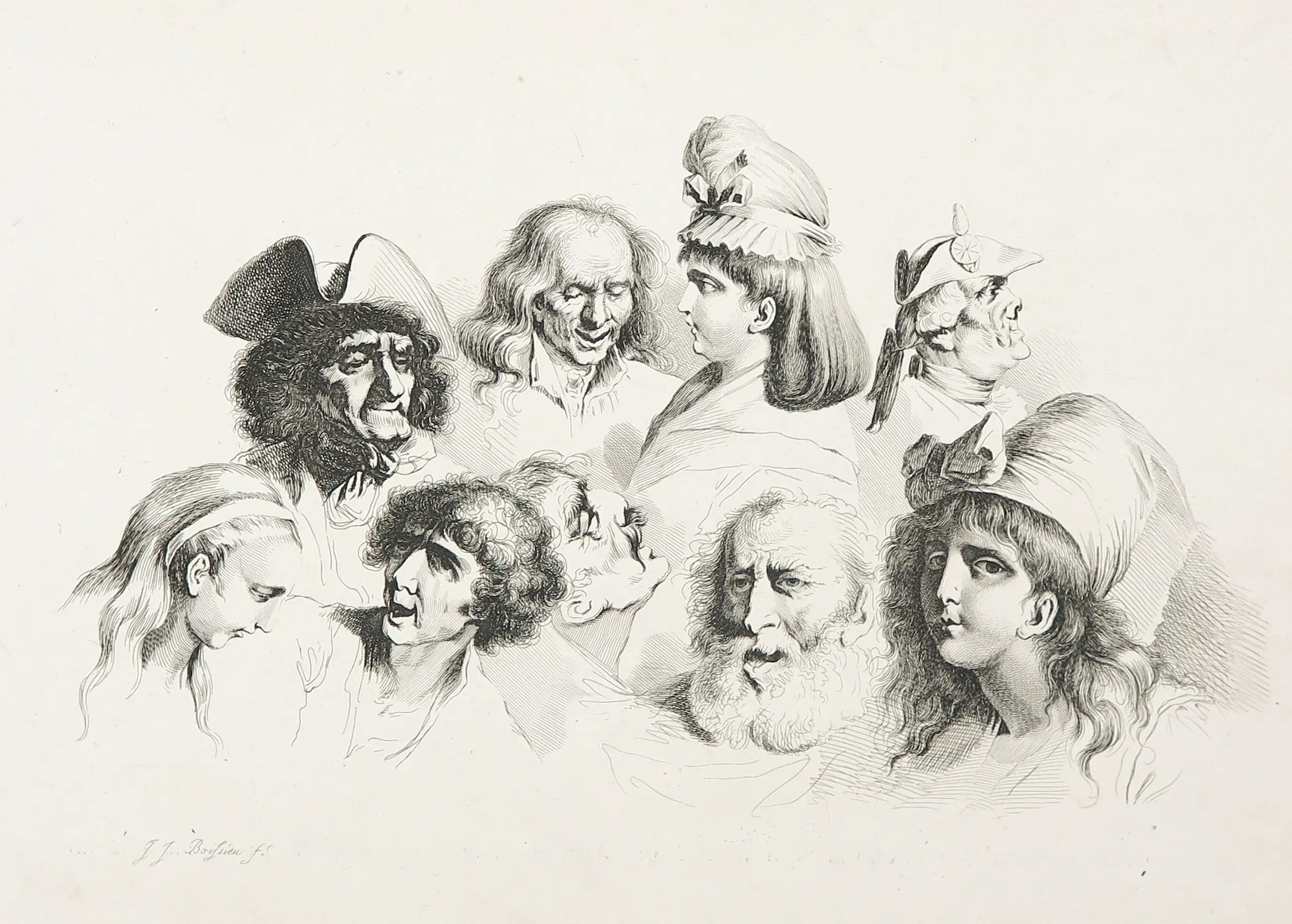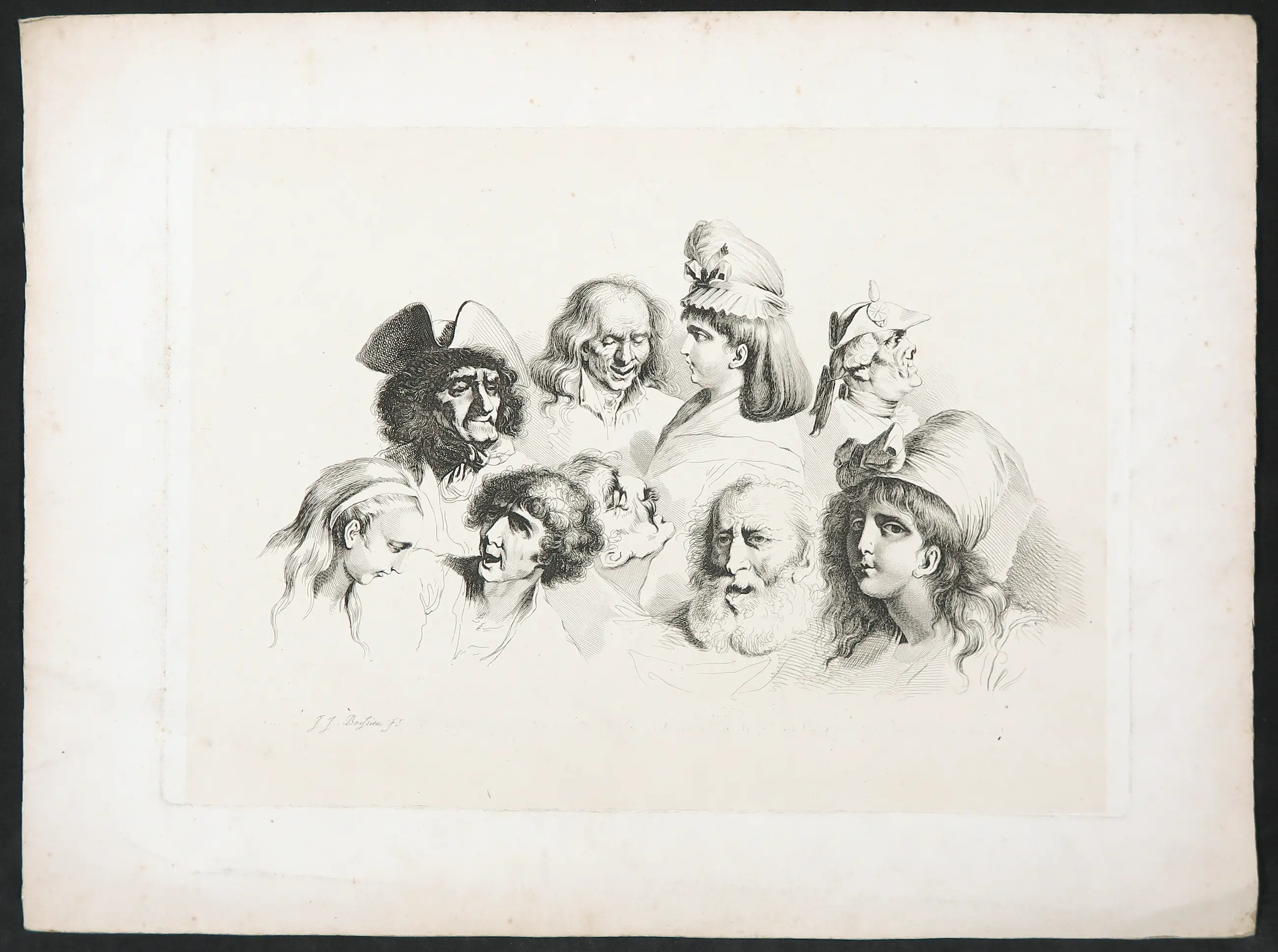 Studie van 9 hoofden/personages. In de hoek linksonder in de plaat gesigneerd.
