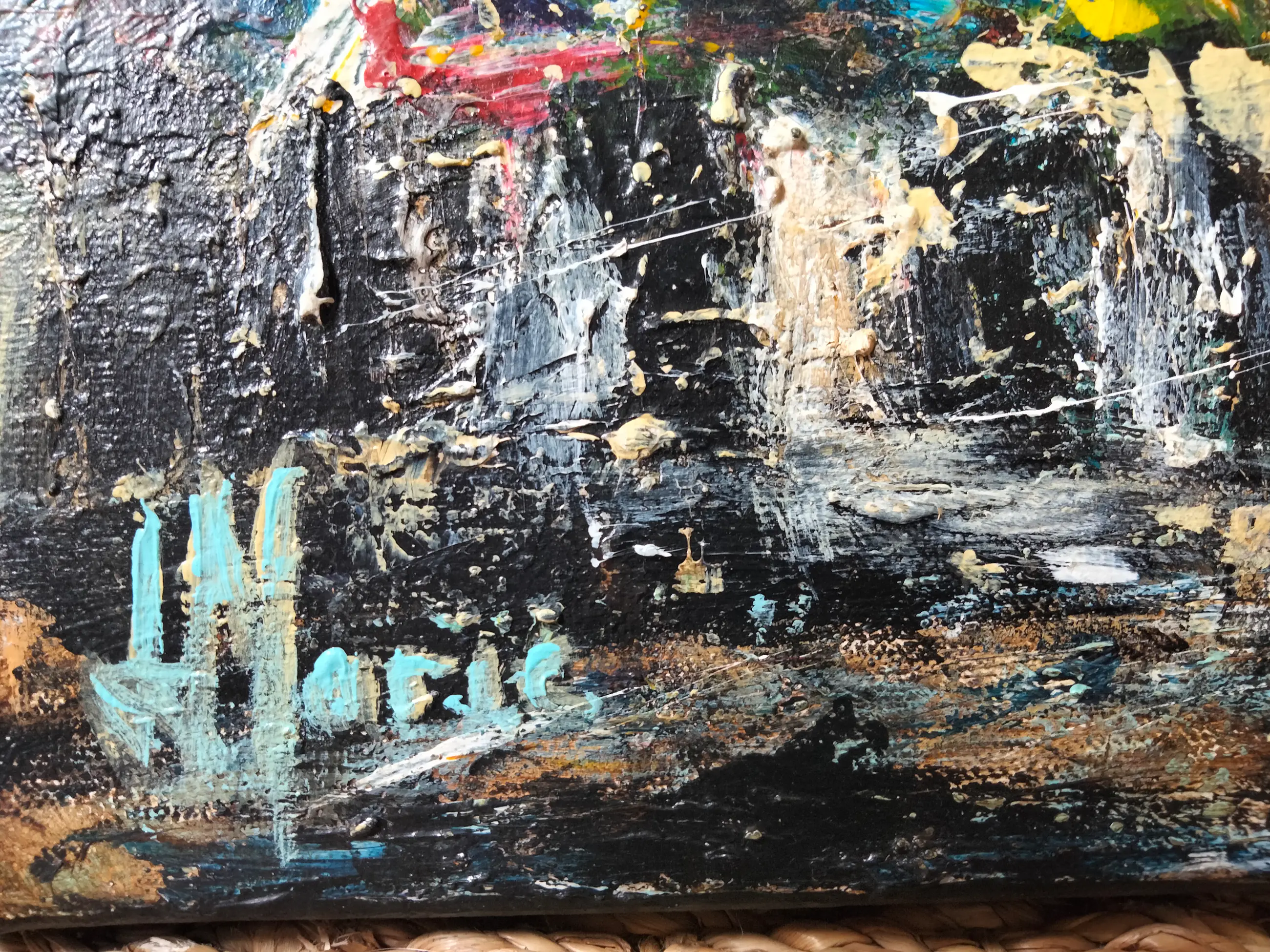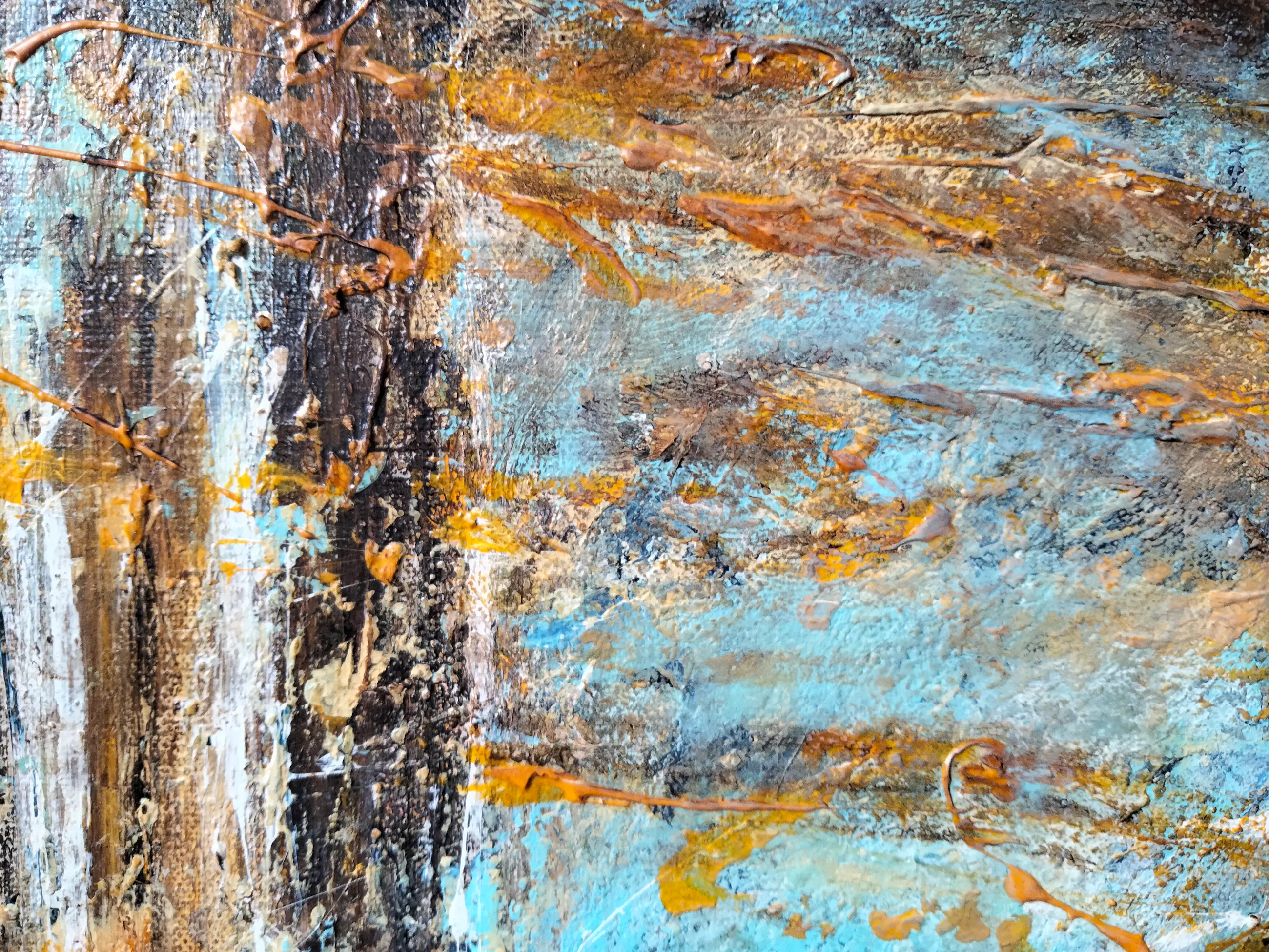 Het werk met acrylverf, in dikke en expressieve materialen, geeft reliëf en diepte, met uitstulpingen en overlappingen die het oppervlak tot leven brengen en het licht vangen.