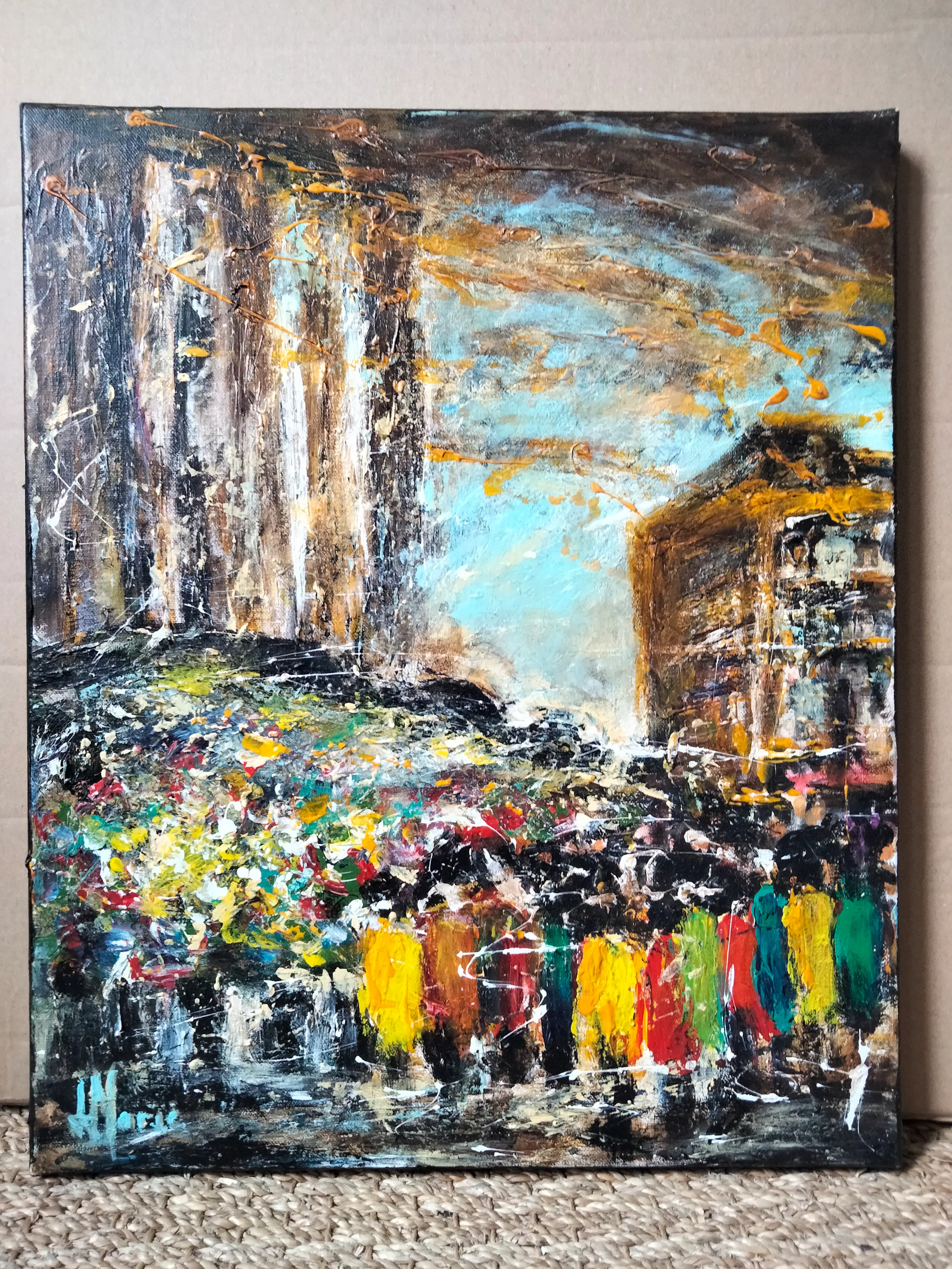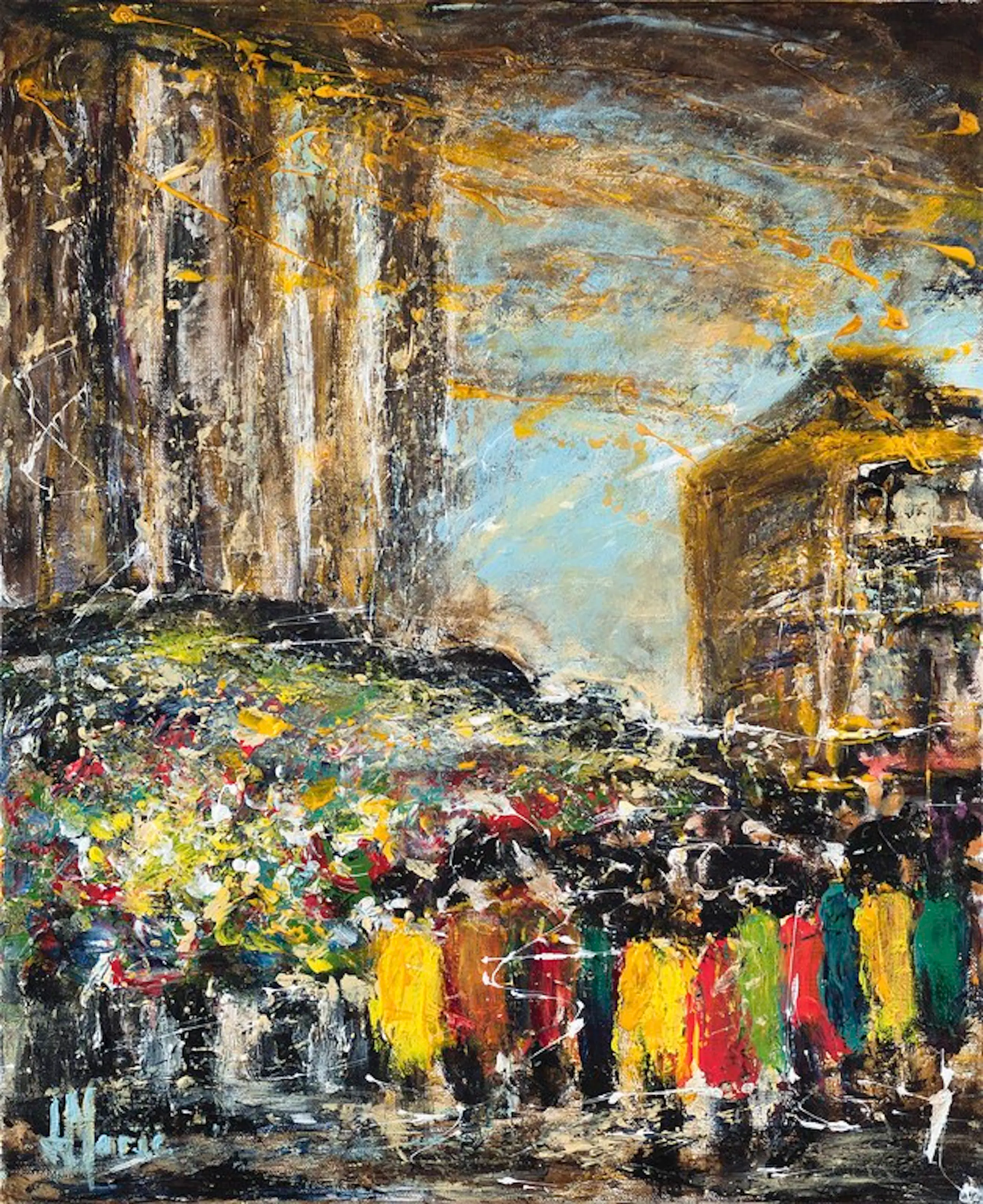 Dit werk legt de bruisende energie van een iconische Parijse markt vast in een eigentijdse en zeer expressieve interpretatie. De kleurrijke silhouetten van voorbijgangers vermengen zich met de overvloed aan bloemen op de voorgrond, waardoor een levendige en dynamische scène ontstaat die direct herkenbaar is.
