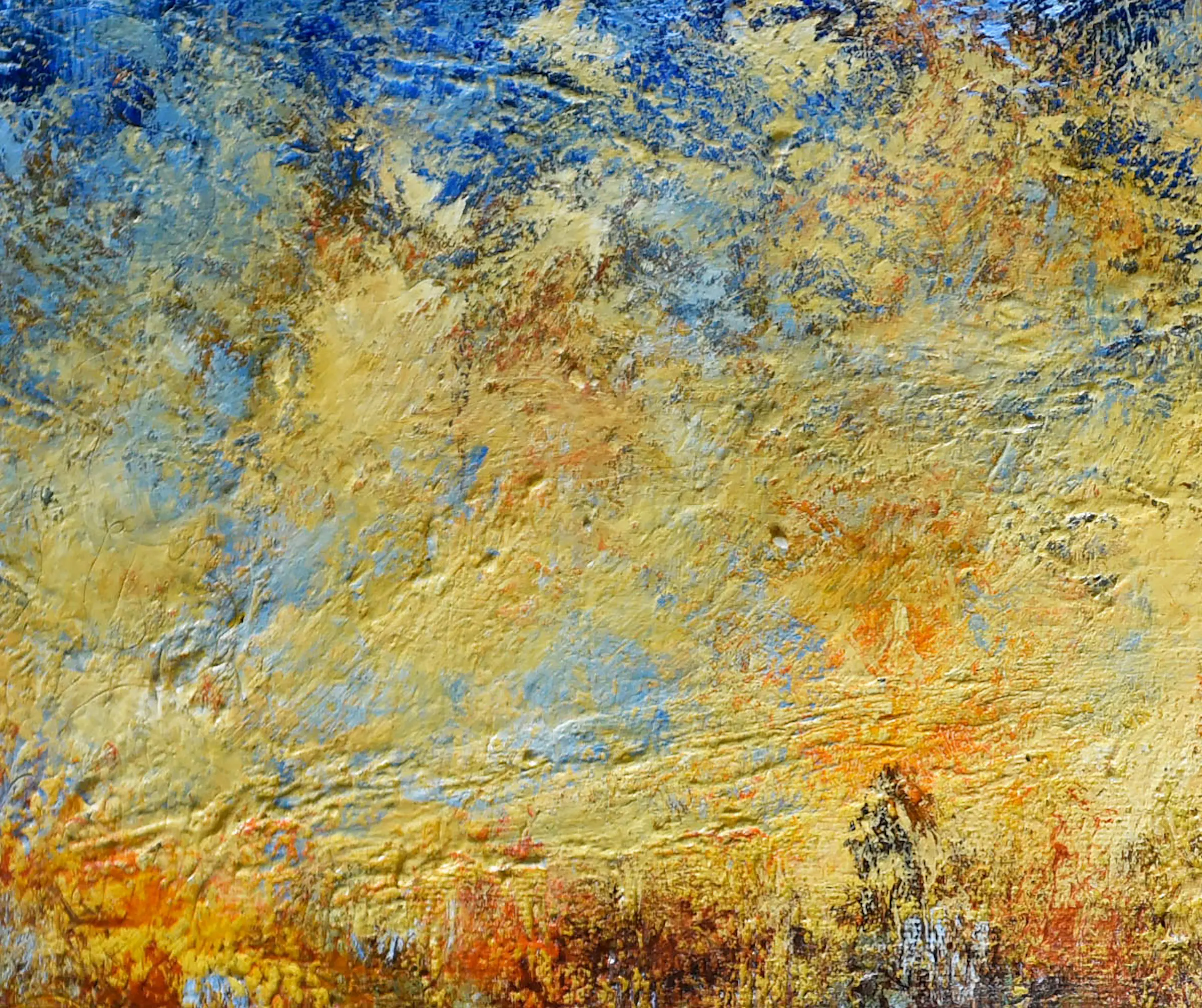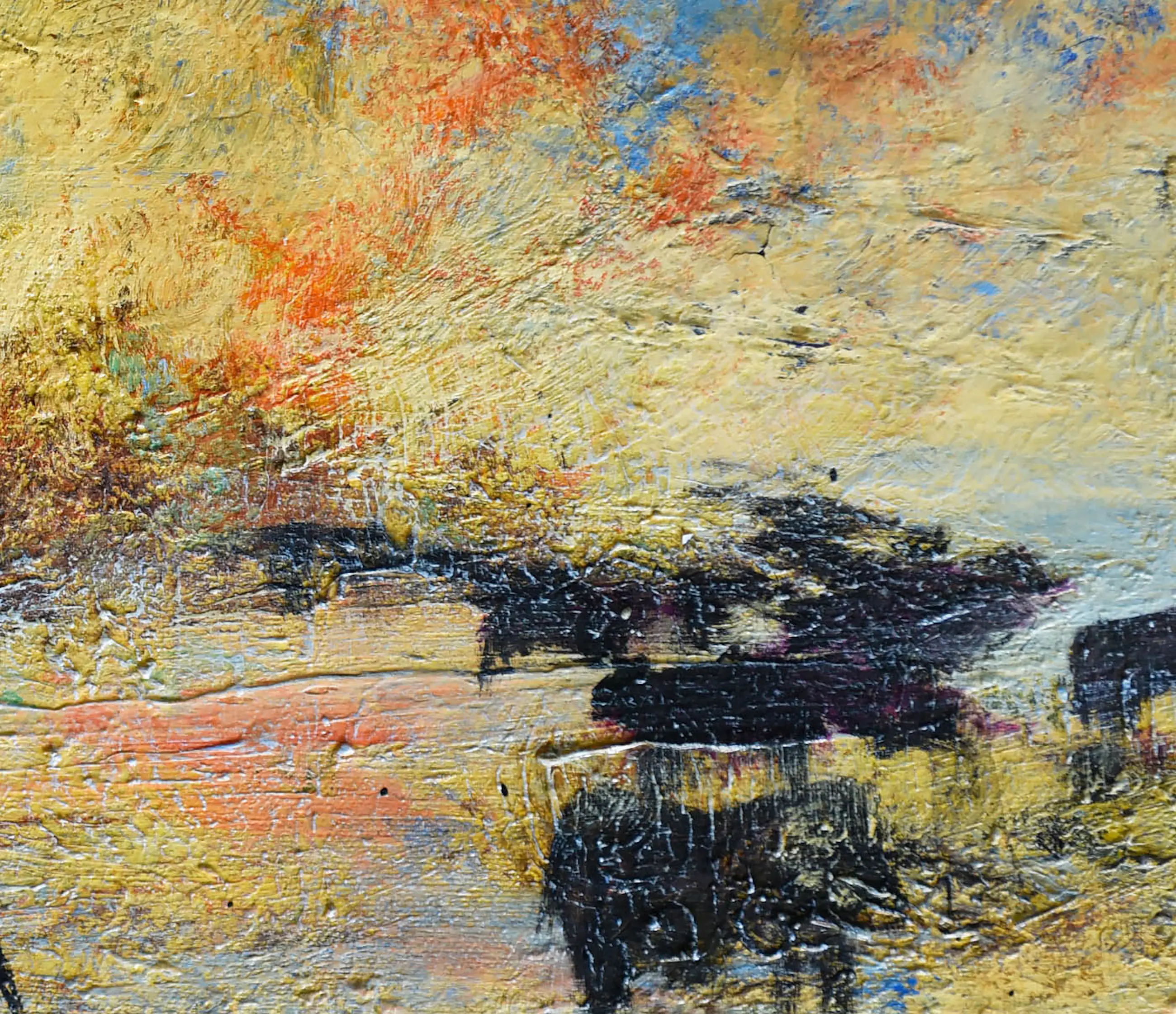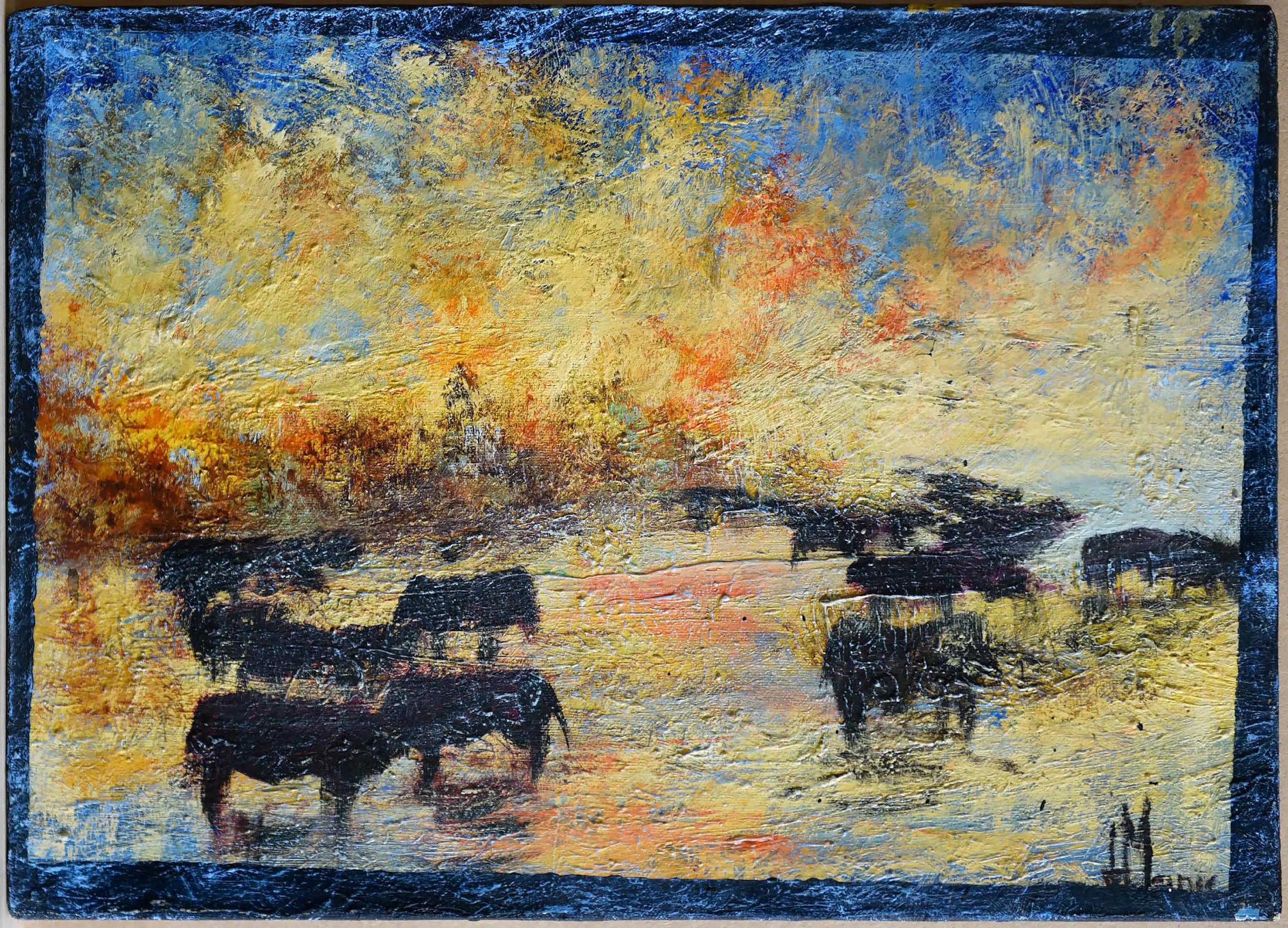 De compositie roept een Camargue-landschap op, verlevendigd door een groep stieren, weergegeven op een vrije en expressieve manier. De dominante tinten geel, oker en blauw creëren een lichtgevende atmosfeer, met een rijk gedetailleerde lucht en een sterke nadruk op textuur.