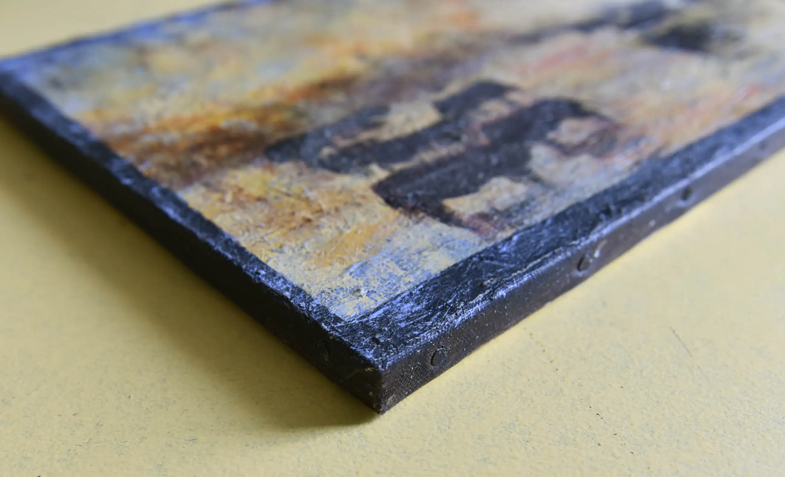 De bewerking van het materiaal is duidelijk zichtbaar, met dikke streken en een rijk gestructureerd oppervlak.