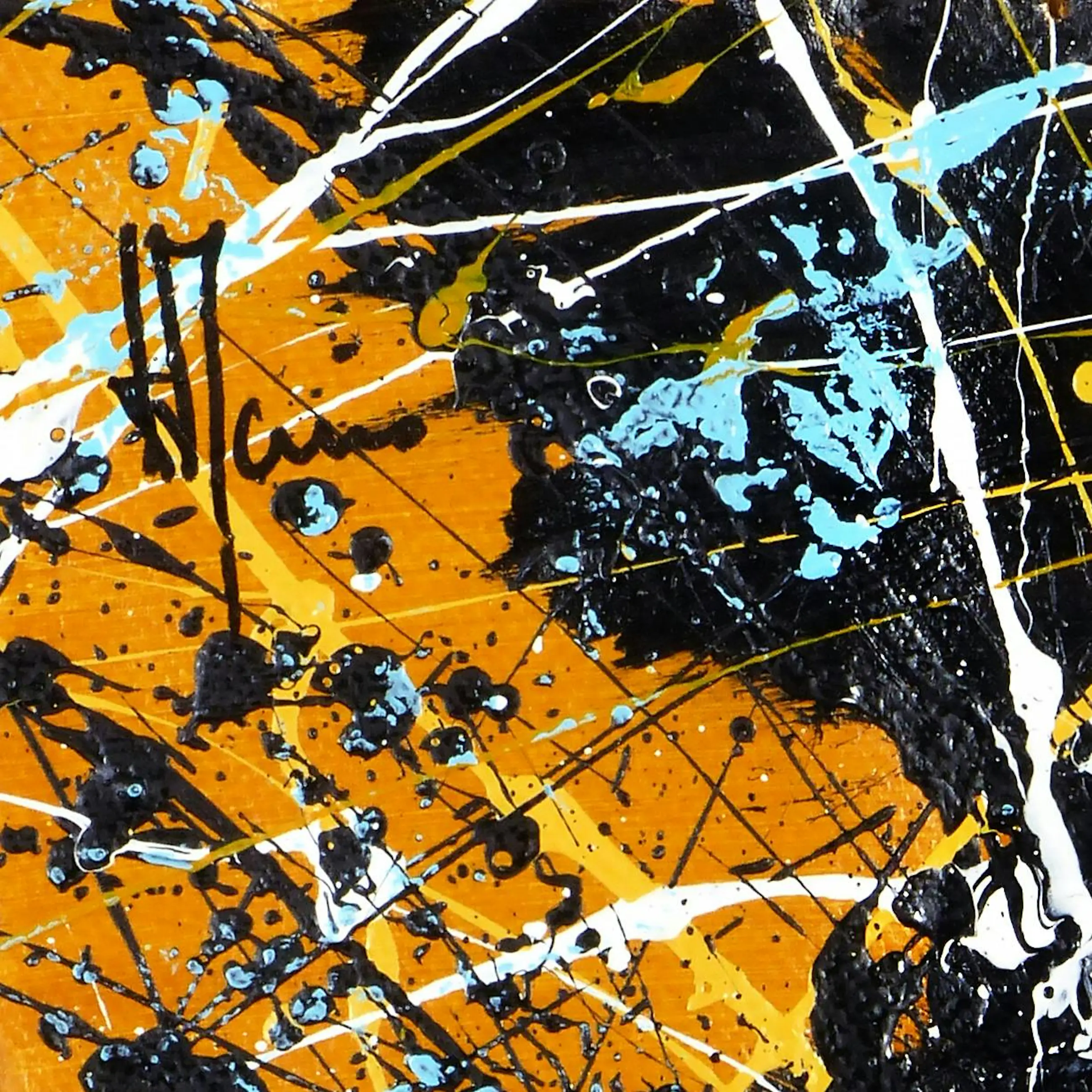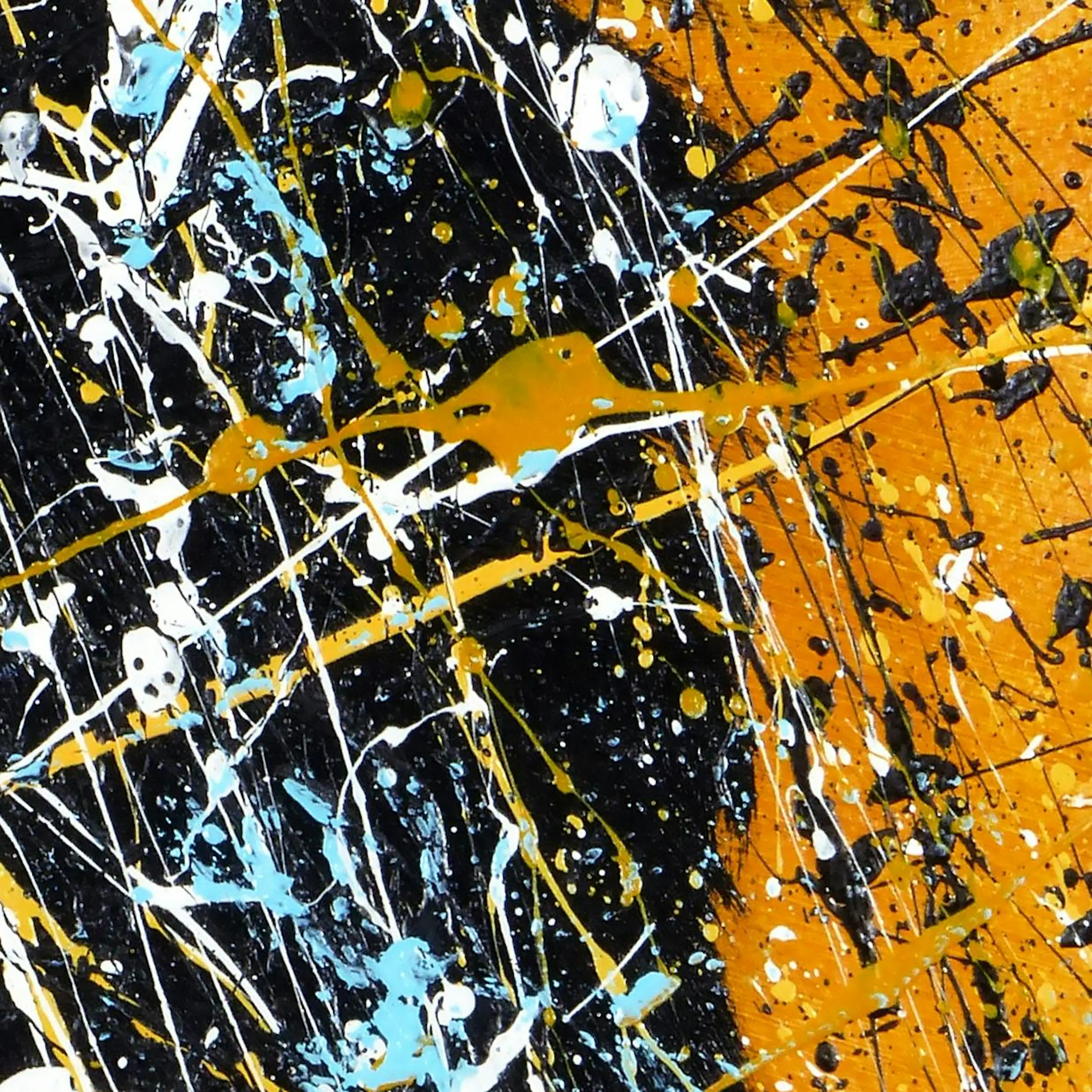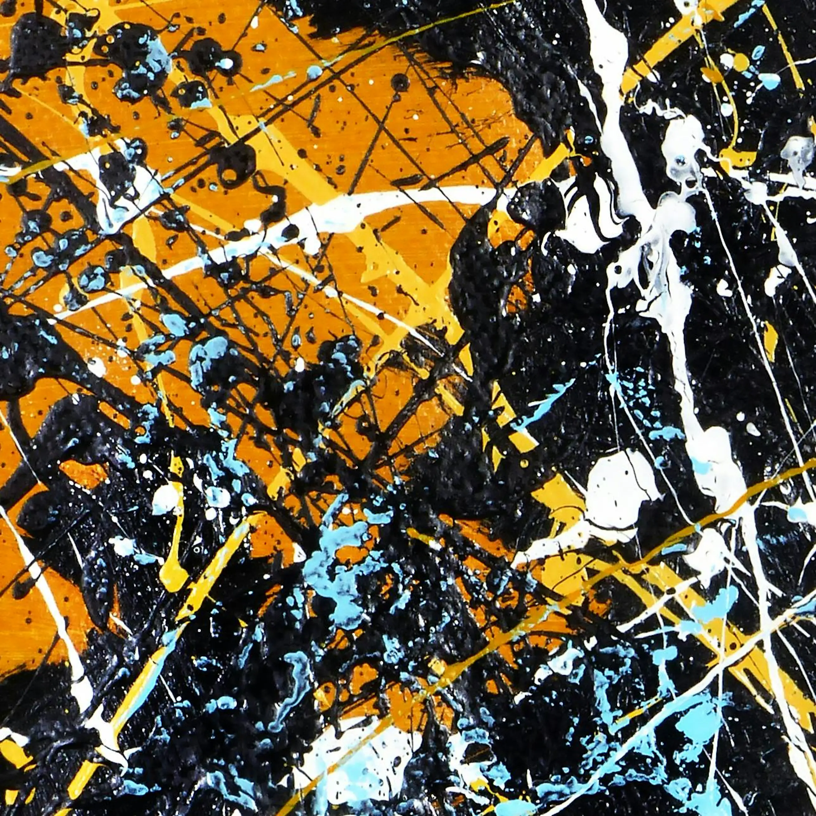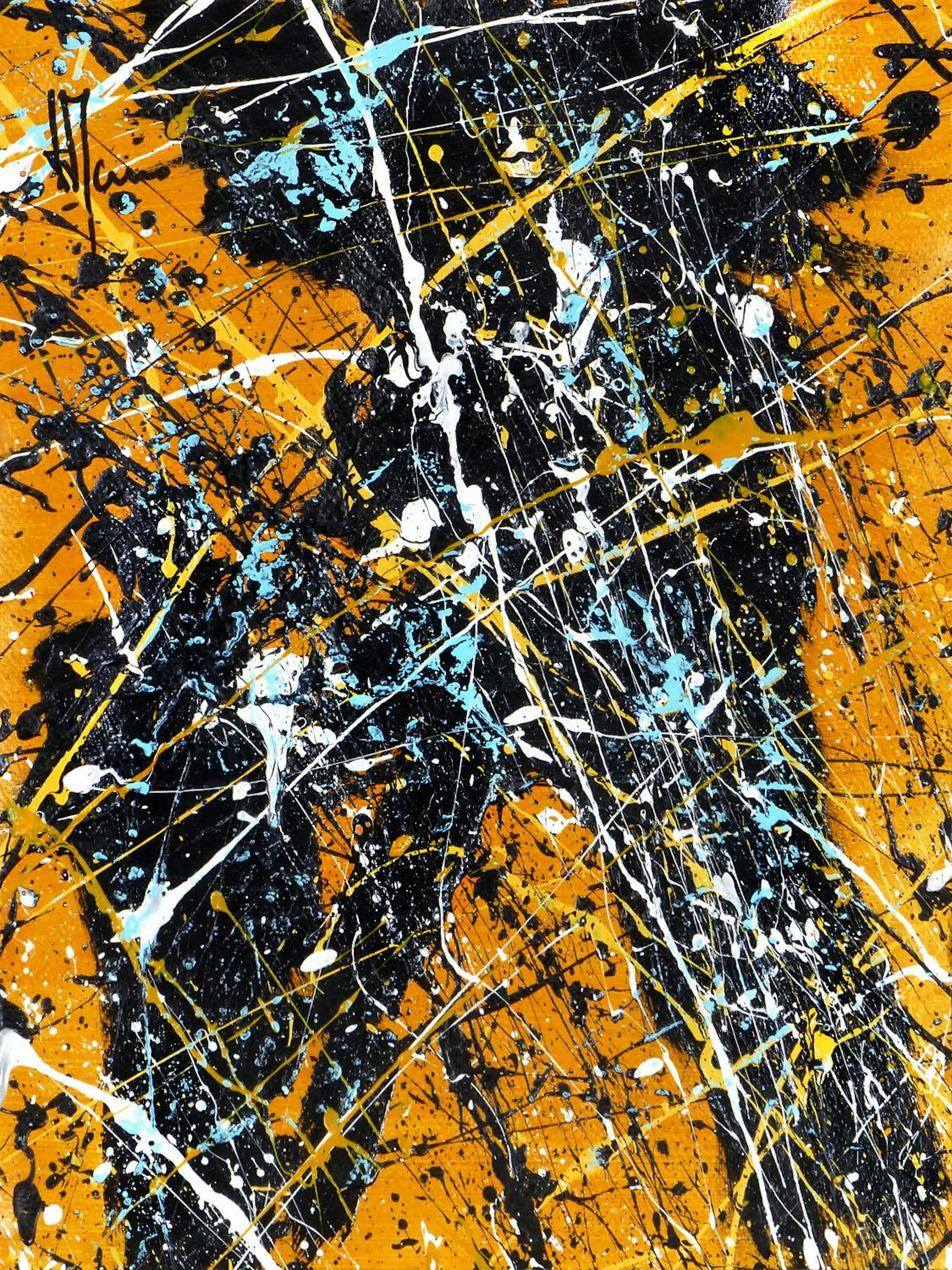 De compositie, rijk aan kleuren en texturen, wordt afgerond met verfspatten die het geheel energie geven en een levendig ritme.