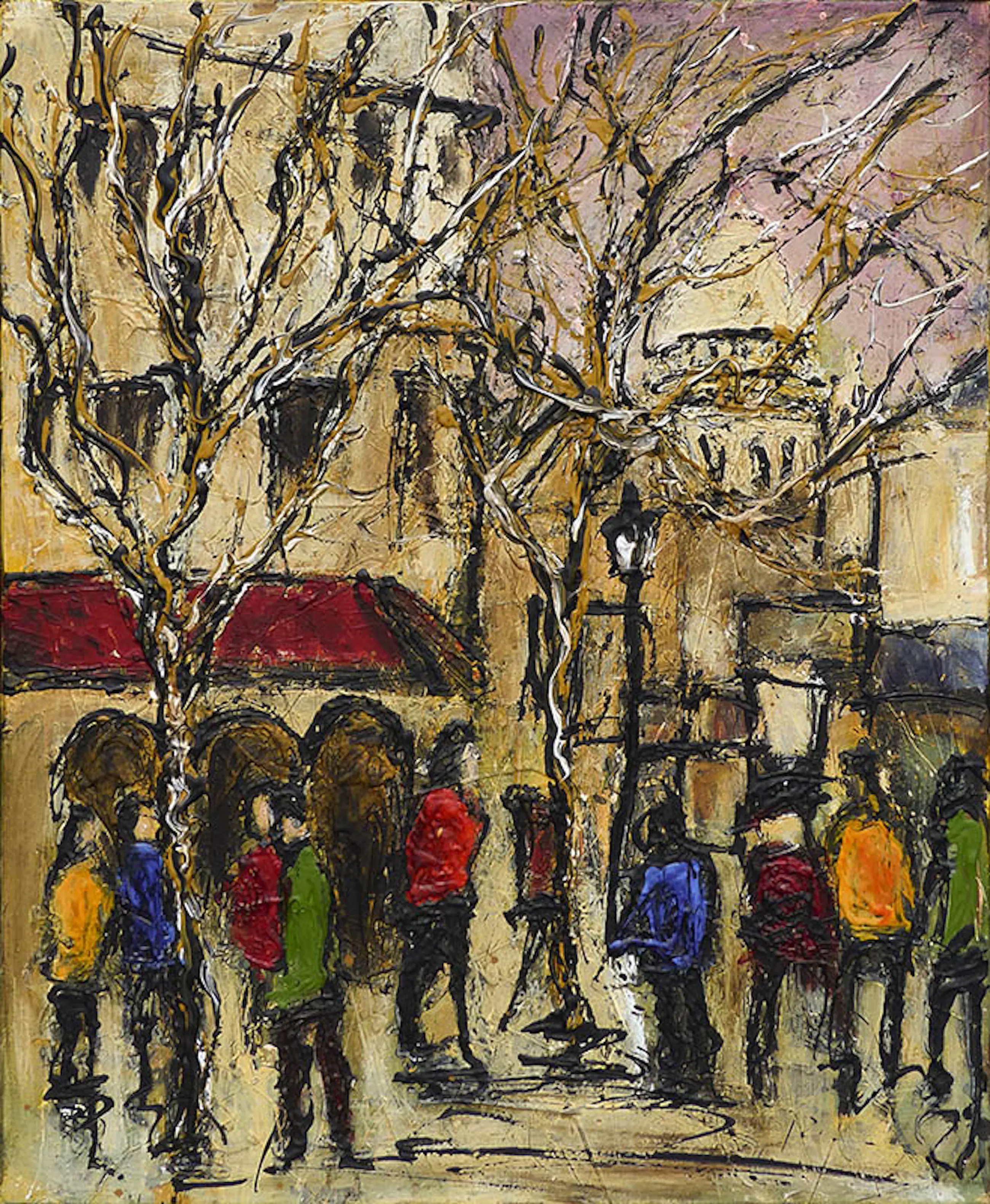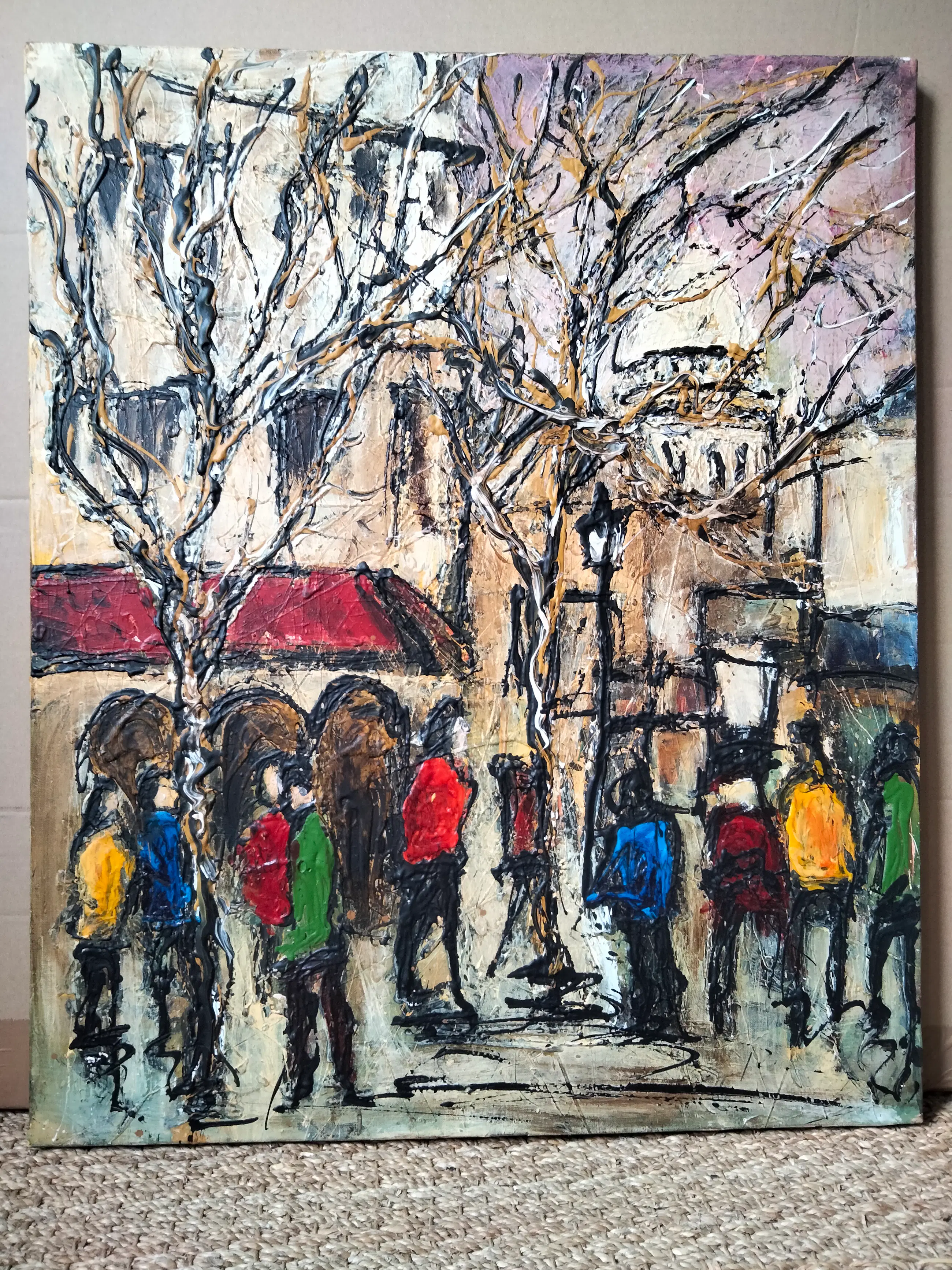 Dit kunstwerk legt de typische sfeer vast van Place du Tertre, in het hart van Montmartre, met zijn kunstenaars, voorbijgangers en constante bedrijvigheid. De kleurrijke silhouetten steken af tegen een herkenbare Parijse architectuur, gekenmerkt door lichtrijke gevels en bomen met grafische lijnen.