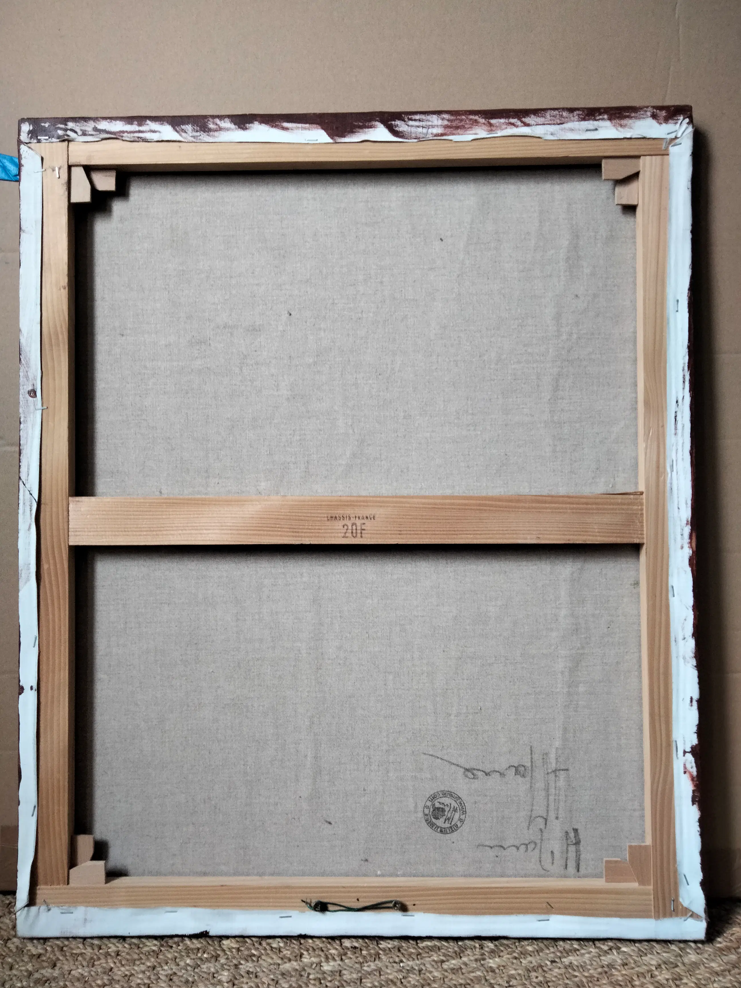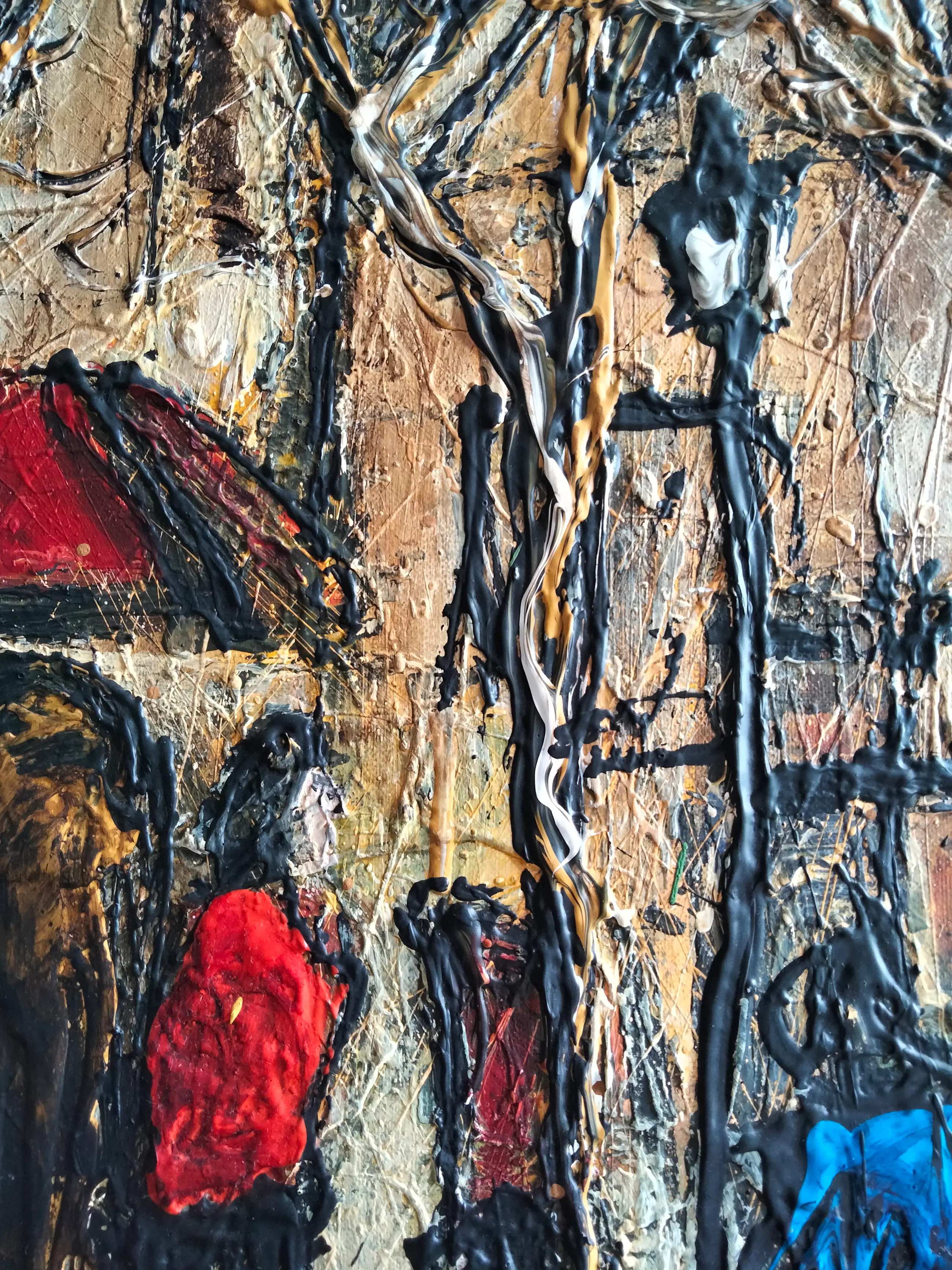 De compositie speelt met het contrast tussen warme tinten (rood, oker, beige) en accenten van levendige kleuren die de scène verlevendigen. De dikke, expressieve acrylverf voegt reliëf en textuur toe, waardoor de indruk van beweging en leven wordt versterkt.