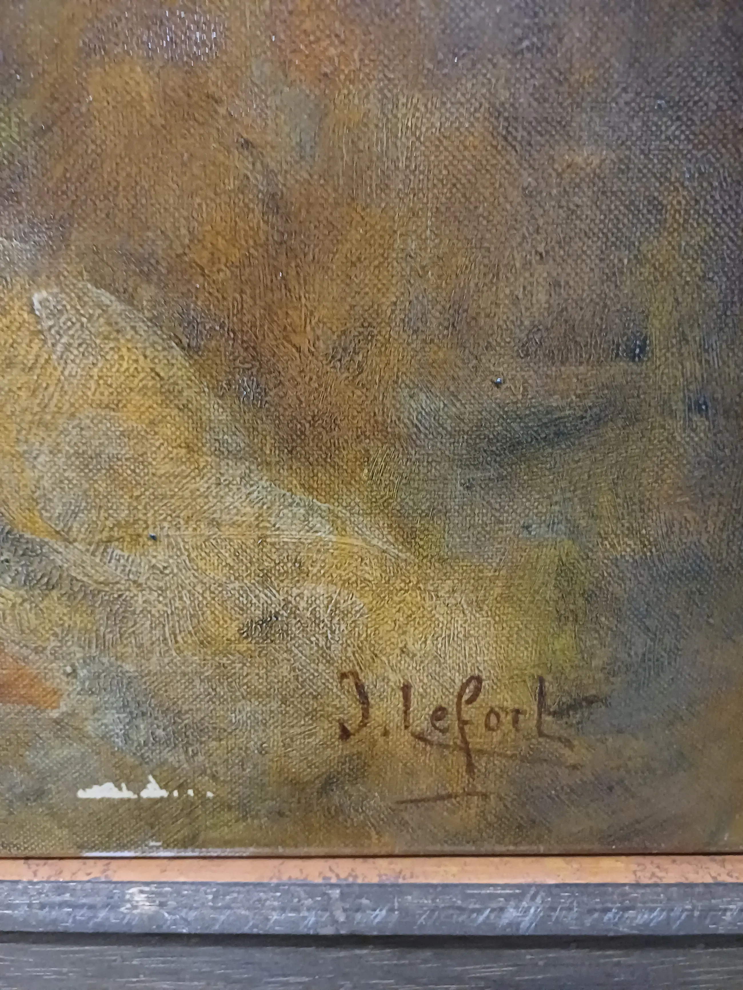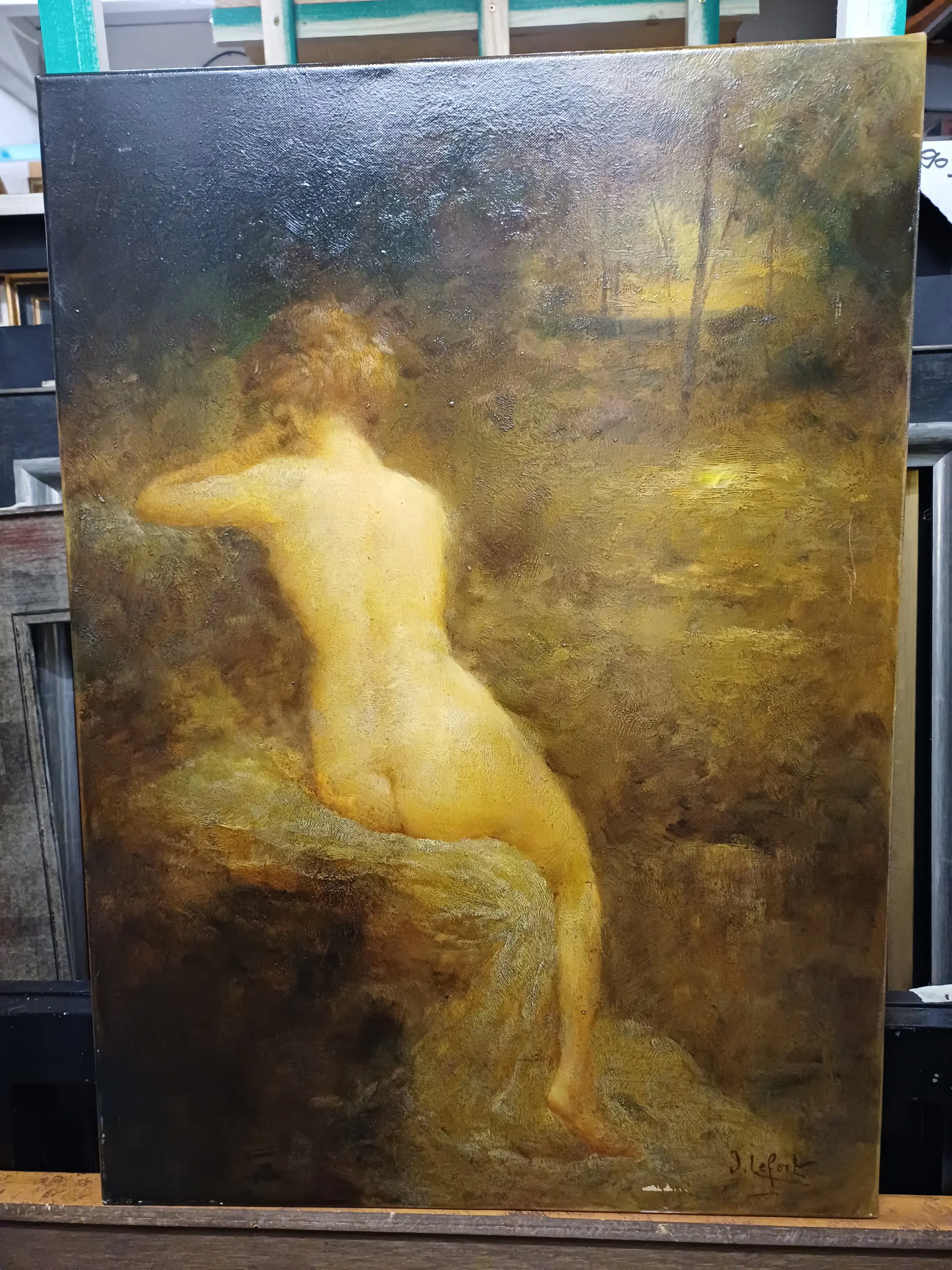 Schilderij van Jean Lefort, een naakte vrouw in een bos landschap . De foto's maken deel uit van de beschrijving.