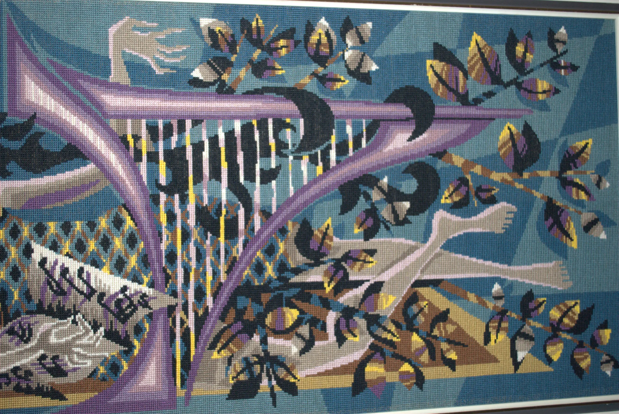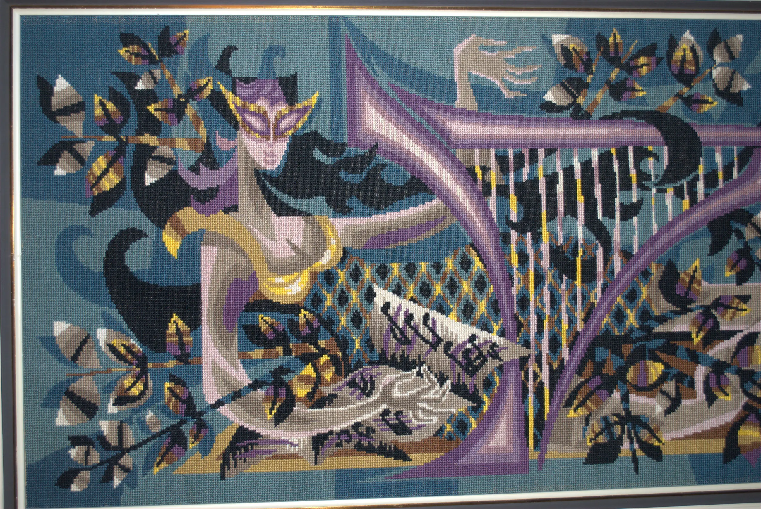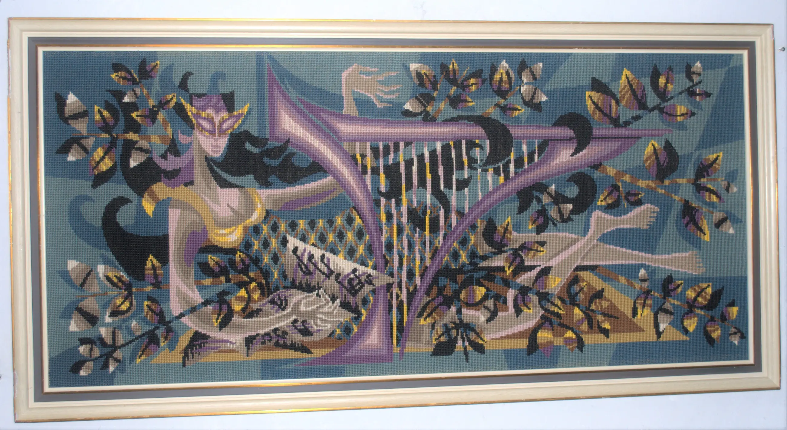 Euterpe, een van de 9 Griekse muzen. Ontwerp mogelijk door Jean Lurcat: hand-borduurwerk (ca. jaren 50) van topklasse.Bevestigd op een spaanplaat, 51x113 cm. De lijst heeft enige randschade, 61x123 cm. NO FOREIGN SHIPMENT/GEEN VERZENDING BUITENLAND