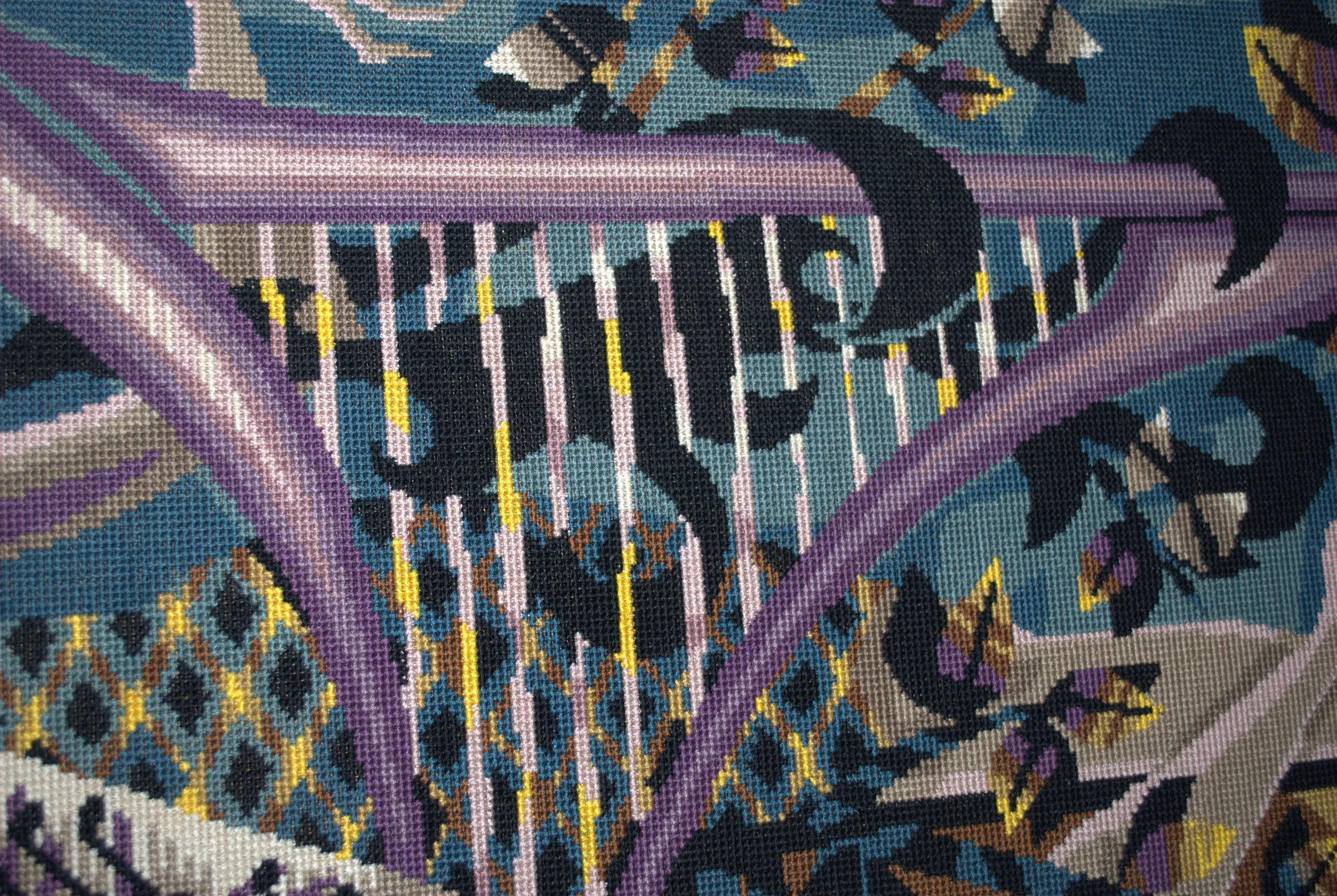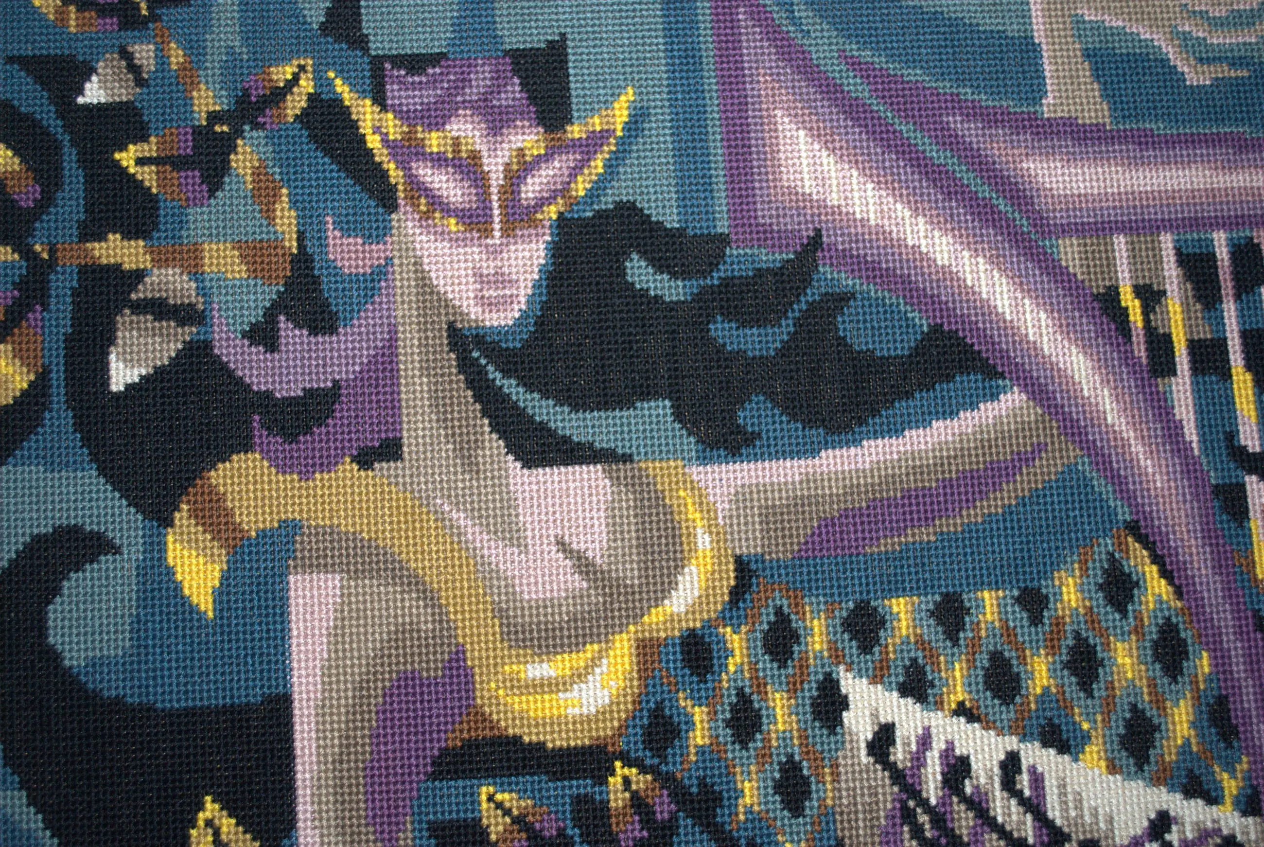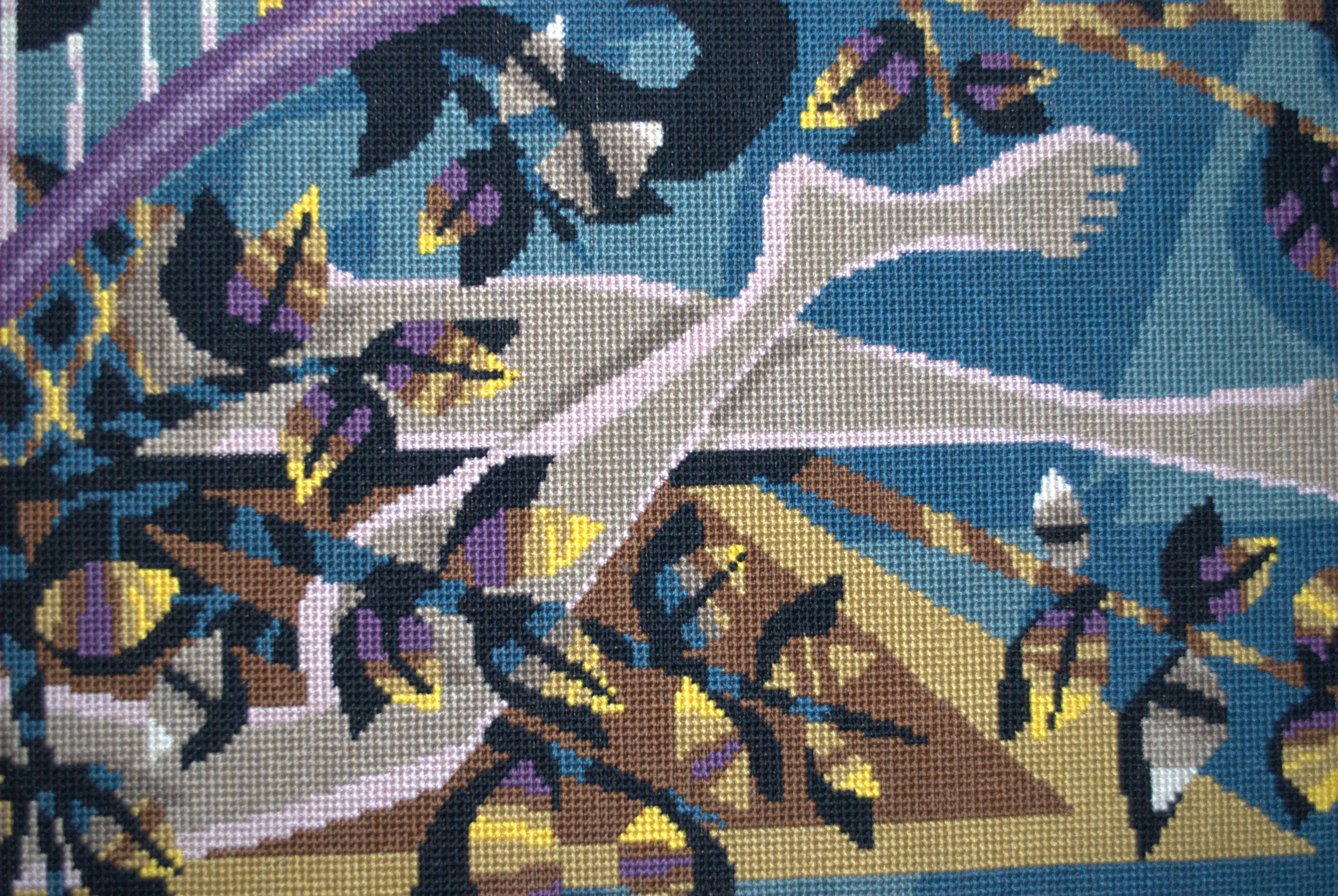 Euterpe, een van de 9 Griekse muzen. Ontwerp mogelijk door Jean Lurcat: hand-borduurwerk (ca. jaren 50) van topklasse.Bevestigd op een spaanplaat, 51x113 cm. De lijst heeft enige randschade, 61x123 cm. NO FOREIGN SHIPMENT/GEEN VERZENDING BUITENLAND