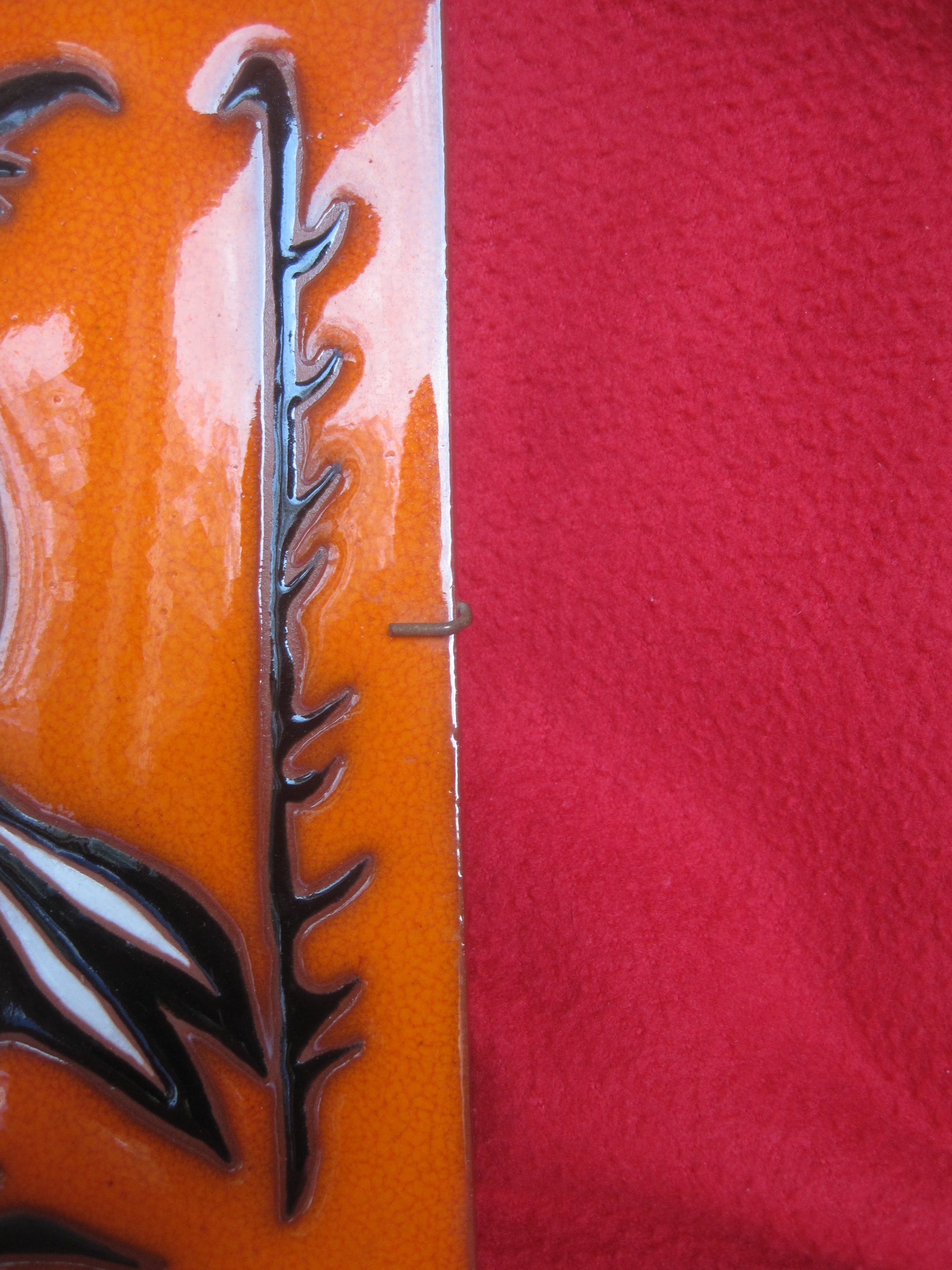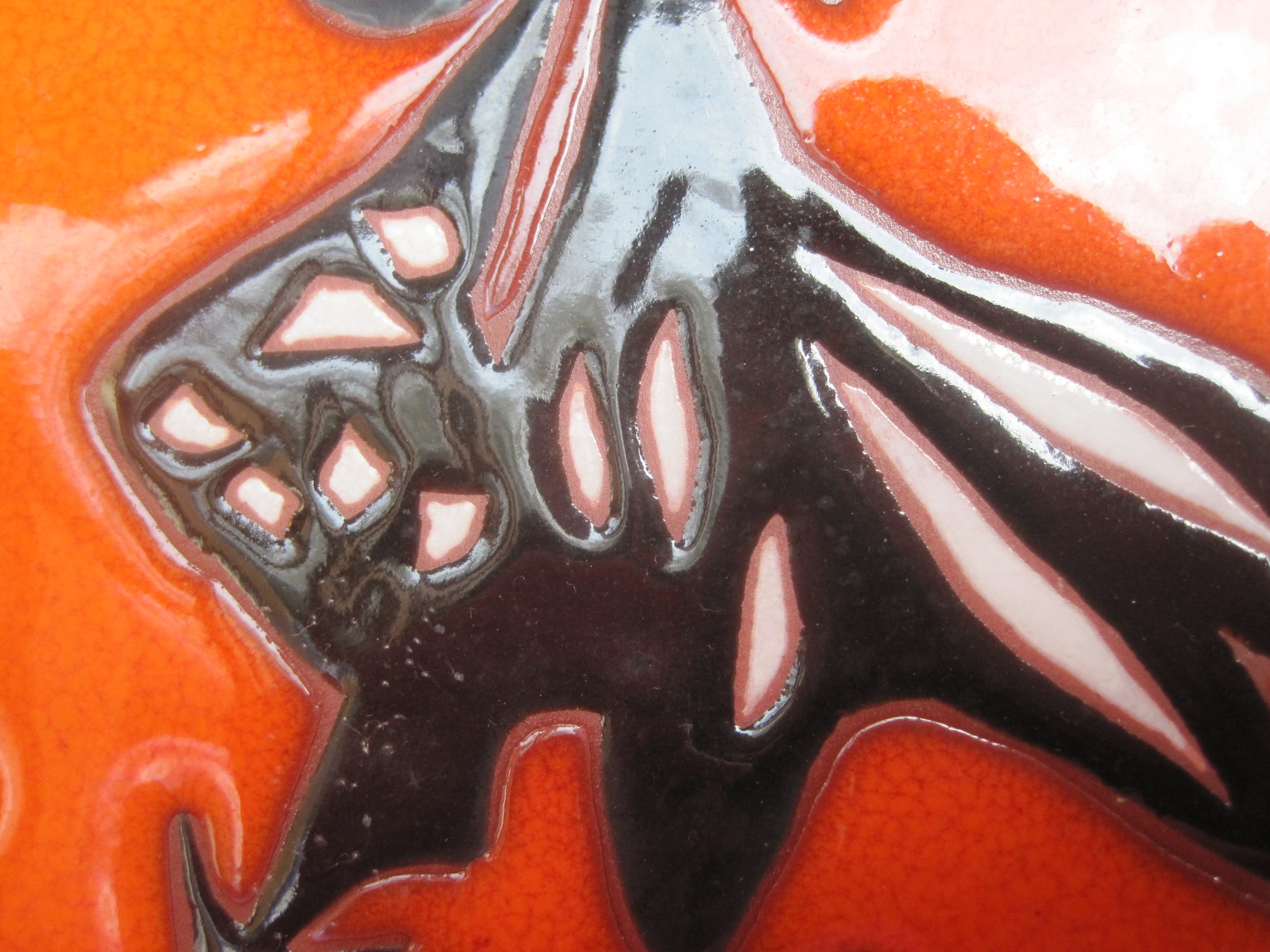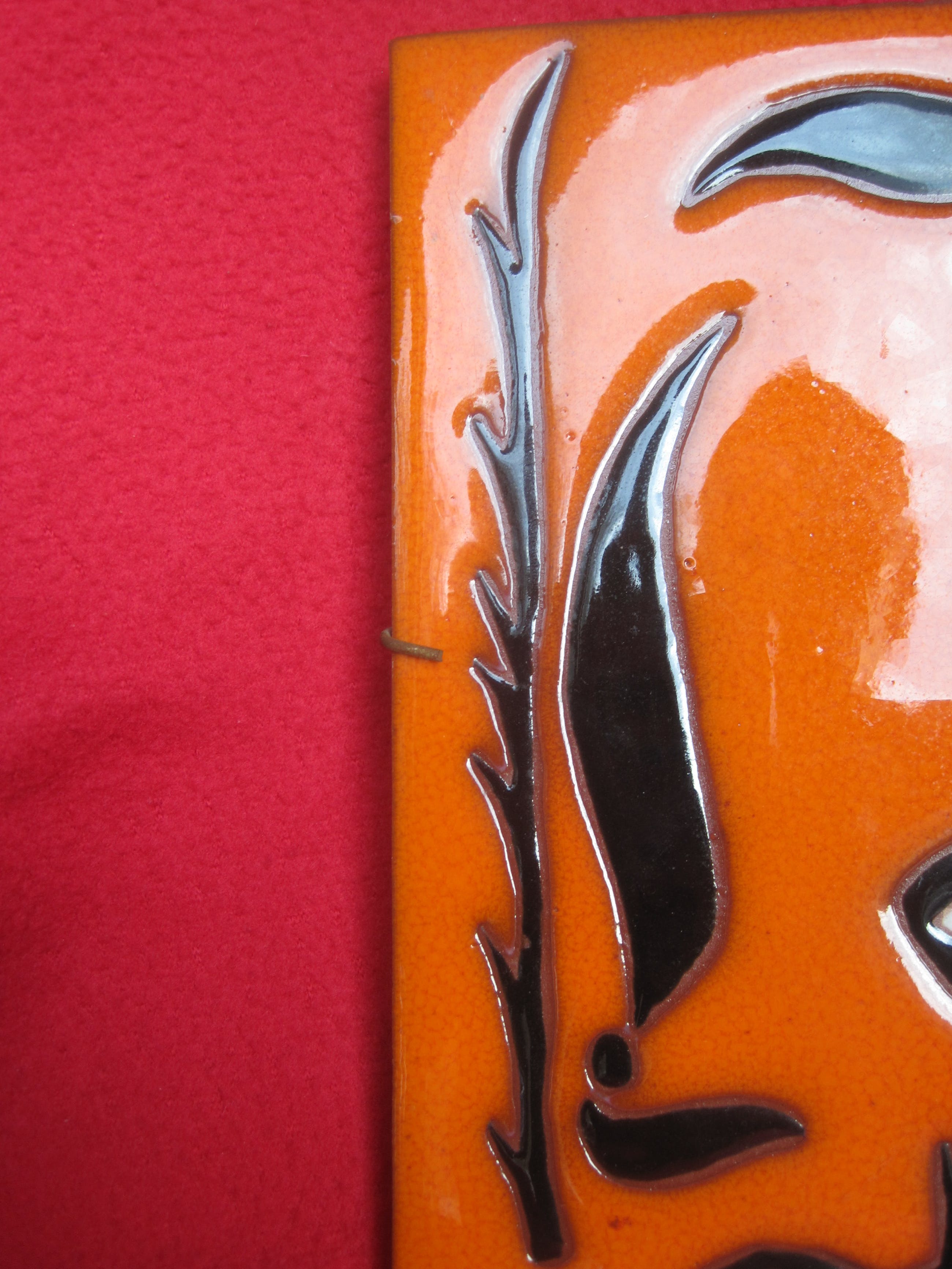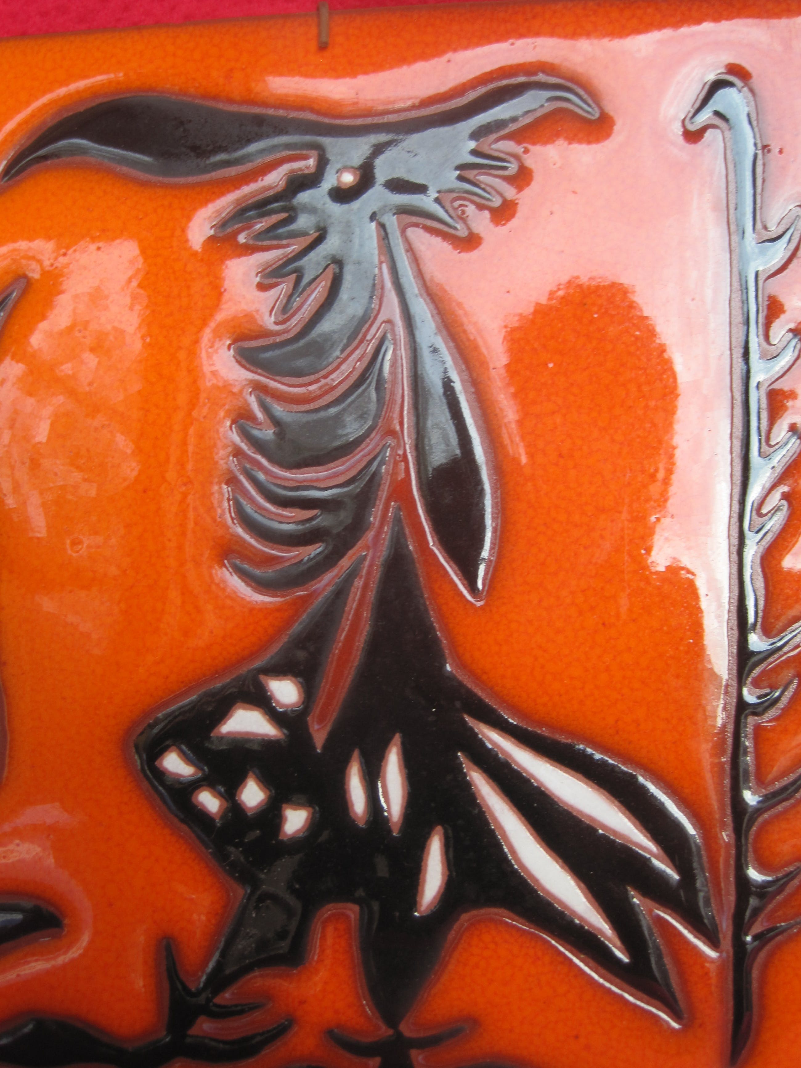 Mooie en gave geglazuurde tegel van een abstracte haan door Jean Lurcat ( 1892-1966 ). De tegel is gesigneerd op de achterkant. Bij de tegel zit een ophangsysteem.