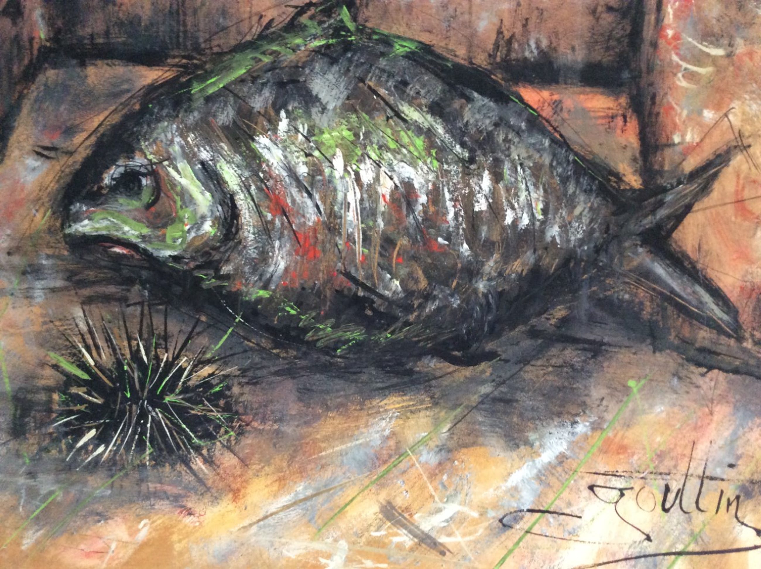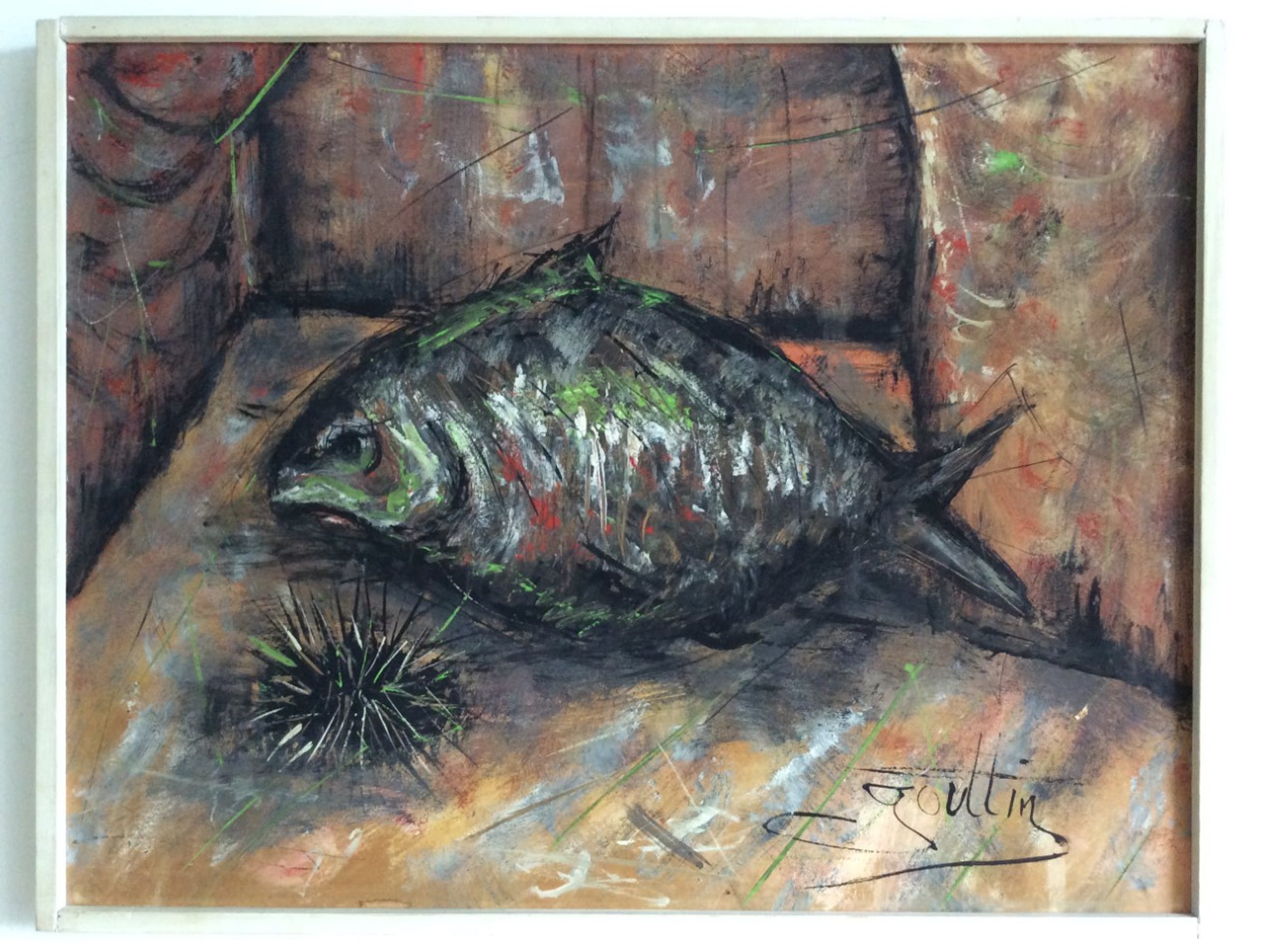 Kenmerkend stilleven van de uit Nice afkomstige kunstenaar Jean Marie Gouttin (1922-1987). Stilleven met vis en zee egel. Olieverf op karton, in eenvoudige houten lijst. Formaat incl. 52 x 66 cm, ca. 1975 Rechts onderin hand gesigneerd.
