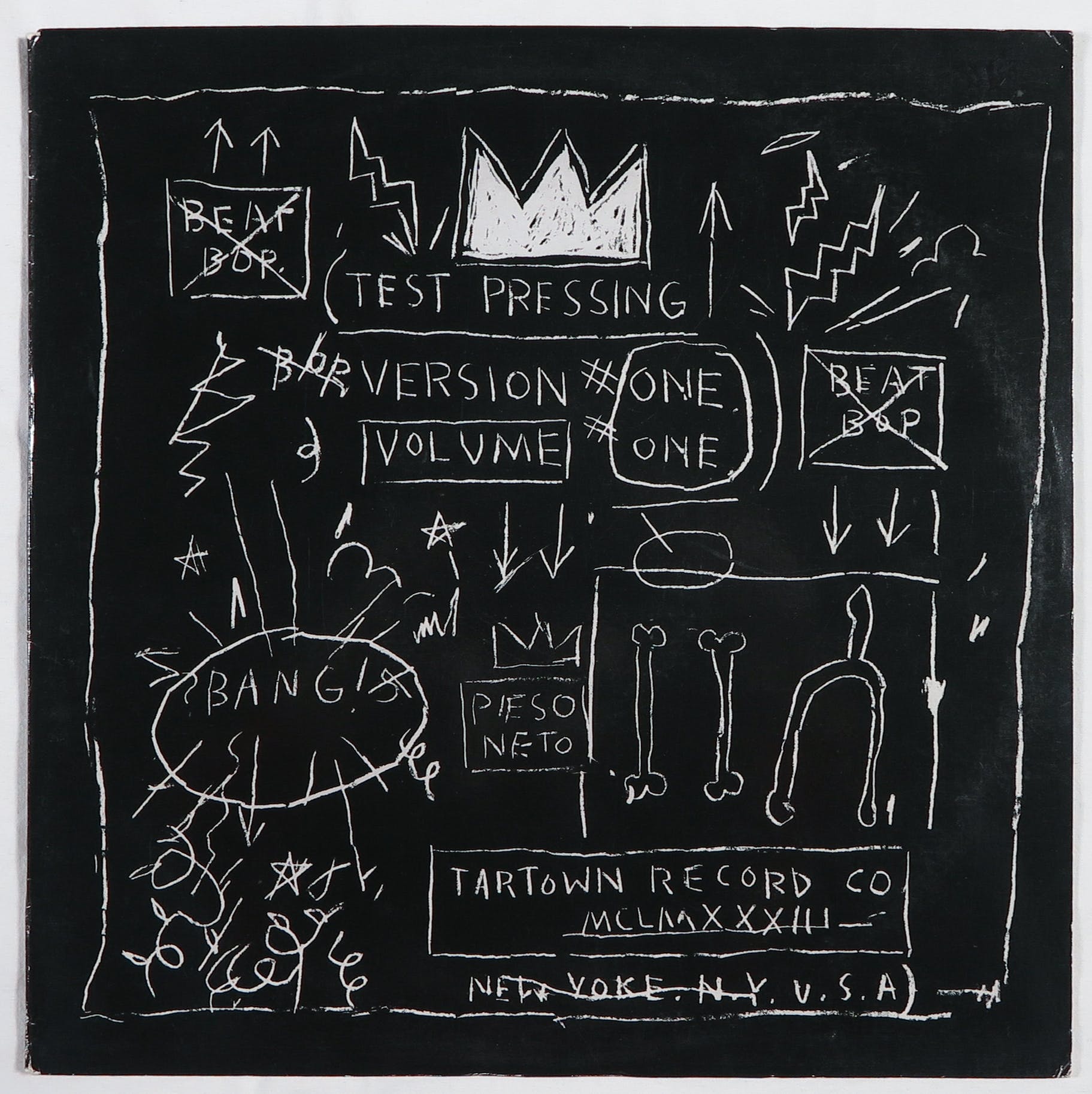 Toen Jean-Michel Basquiat 19 was, verhuisde hij met zijn toenmalige vriendin, Alexis Adler, naar een afbrokkelend appartement in Manhattan. Daar, herinnert ze zich, "speelde de hele tijd muziek." Muziek was een bron van creatieve inspiratie voor Basquiat, wiens werk vaak muzikale motieven zoals jazzartiesten en koperblazers verbeeldde. Voor zijn vroege dood op 27-jarige leeftijd ontwierp de straatartiest ook de albumhoezen voor twee vinylplaten. Dit item, het eerste ontwerp, was voor Beat Bop, een rapstrijd uit 1983 tussen de door graffiti-artiesten omgedraaide MC's KRoband Rammellzee. Basquiat financierde en produceerde de track op zijn eigen muzieklabel, Tartown Inc. Zoals de legende luidt, stormde Basquiat zelf de opnamecabine binnen tijdens de verhitte sessie - hoewel zijn songtekst de laatste plaat niet haalde. Basquiat's tweede ontwerp; een cover uit 1984 voor de San Francisco punkband The Offs, toont een enkele figuur in Basquiat's traditionele cartoonachtige stijl en kinderachtig schrift.