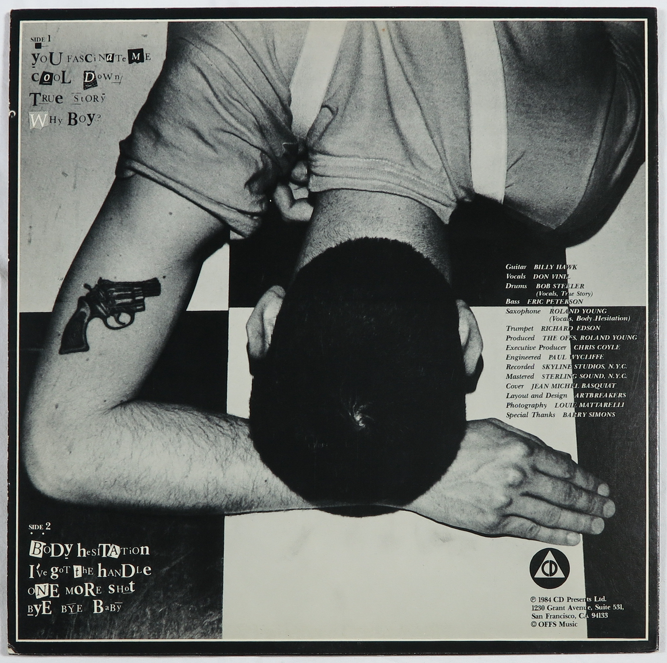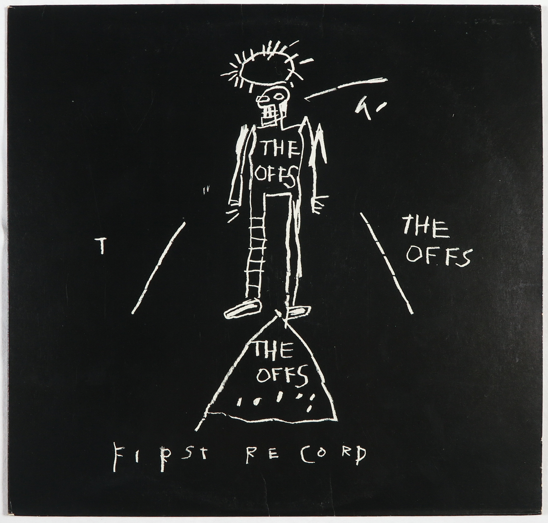 Toen Jean-Michel Basquiat 19 was, verhuisde hij met zijn toenmalige vriendin, Alexis Adler, naar een afbrokkelend appartement in Manhattan. Daar, herinnert ze zich, "speelde de hele tijd muziek." Muziek was een bron van creatieve inspiratie voor Basquiat, wiens werk vaak muzikale motieven zoals jazzartiesten en koperblazers verbeeldde. Voor zijn vroege dood op 27-jarige leeftijd ontwierp de straatartiest ook de albumhoezen voor twee vinylplaten. Het eerste ontwerp was voor Beat Bop, een rapstrijd uit 1983 tussen de door graffiti-artiesten omgedraaide MC's KRoband Rammellzee. Basquiat financierde en produceerde de track op zijn eigen muzieklabel, Tartown Inc. Zoals de legende luidt, stormde Basquiat zelf de opnamecabine binnen tijdens de verhitte sessie - hoewel zijn songtekst de laatste plaat niet haalde. Dit item betreft Basquiat's tweede ontwerp; een cover uit 1984 voor de San Francisco punkband The Offs, toont een enkele figuur in Basquiat's traditionele cartoonachtige stijl en kinderachtig schrift.