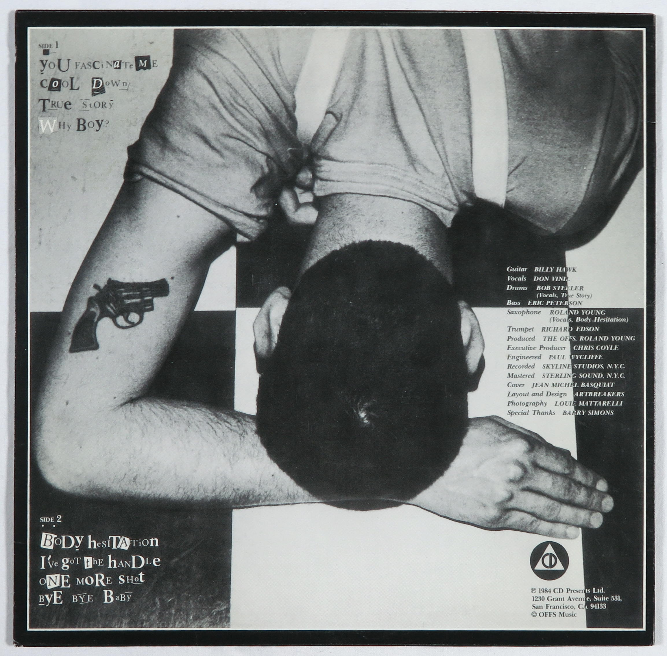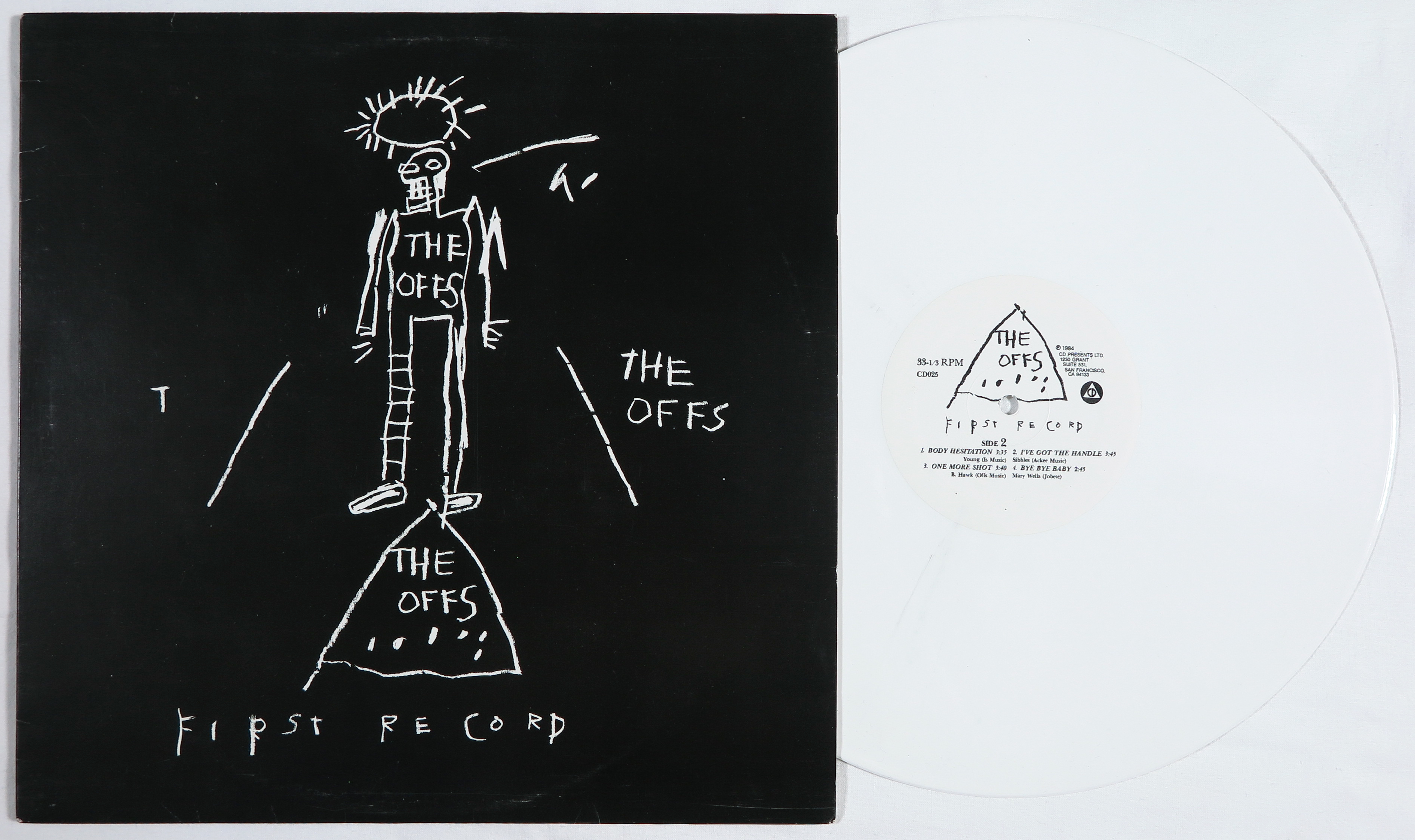 Toen Jean-Michel Basquiat 19 was, verhuisde hij met zijn toenmalige vriendin, Alexis Adler, naar een afbrokkelend appartement in Manhattan. Daar, herinnert ze zich, "speelde de hele tijd muziek." Muziek was een bron van creatieve inspiratie voor Basquiat, wiens werk vaak muzikale motieven zoals jazzartiesten en koperblazers verbeeldde. Voor zijn vroege dood op 27-jarige leeftijd ontwierp de straatartiest ook de albumhoezen voor twee vinylplaten. Het eerste ontwerp was voor Beat Bop, een rapstrijd uit 1983 tussen de door graffiti-artiesten omgedraaide MC's KRoband Rammellzee. Basquiat financierde en produceerde de track op zijn eigen muzieklabel, Tartown Inc. Zoals de legende luidt, stormde Basquiat zelf de opnamecabine binnen tijdens de verhitte sessie - hoewel zijn songtekst de laatste plaat niet haalde. Dit item betreft Basquiat's tweede ontwerp; een cover uit 1984 voor de San Francisco punkband The Offs, toont een enkele figuur in Basquiat's traditionele cartoonachtige stijl en kinderachtig schrift.