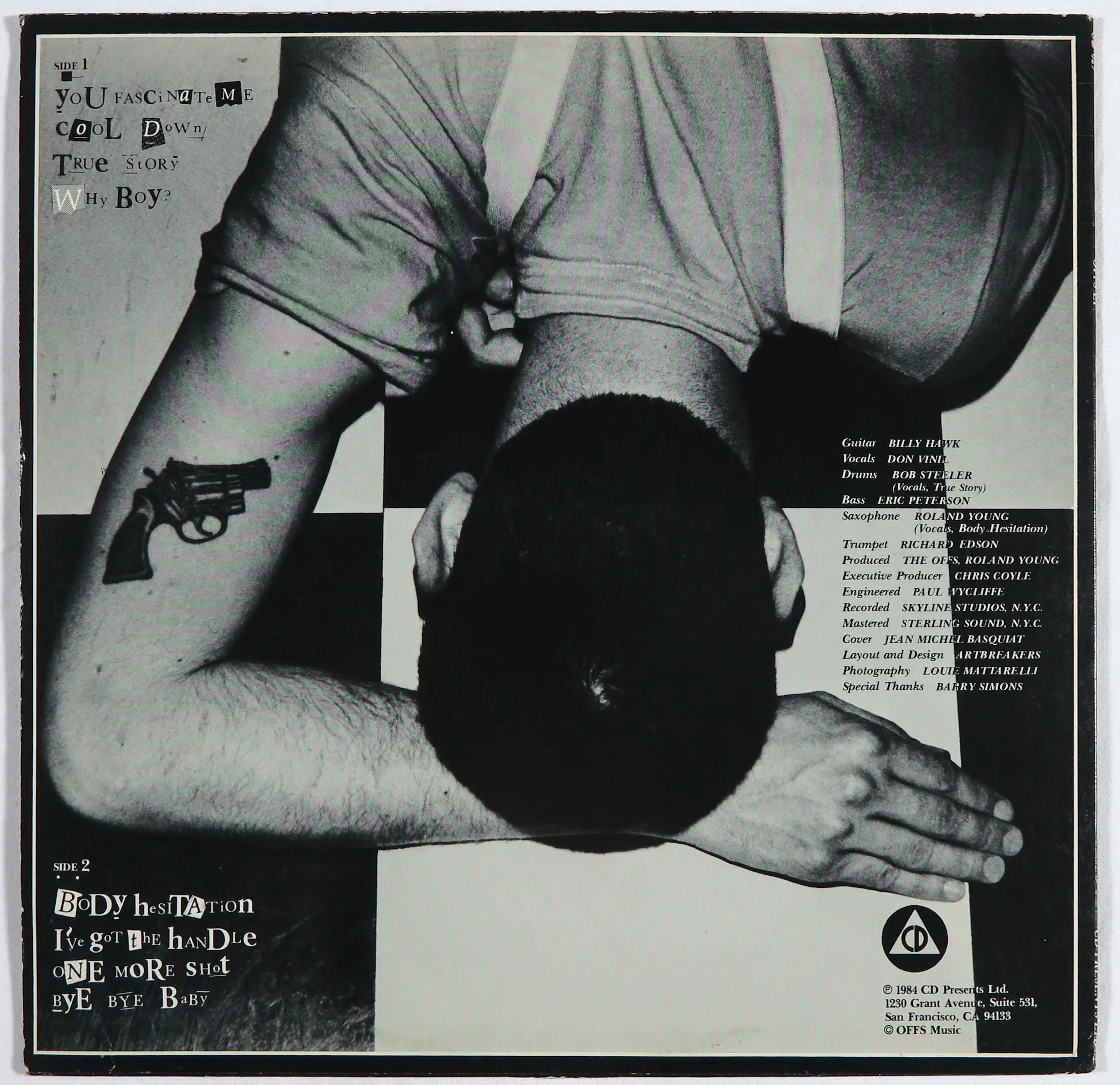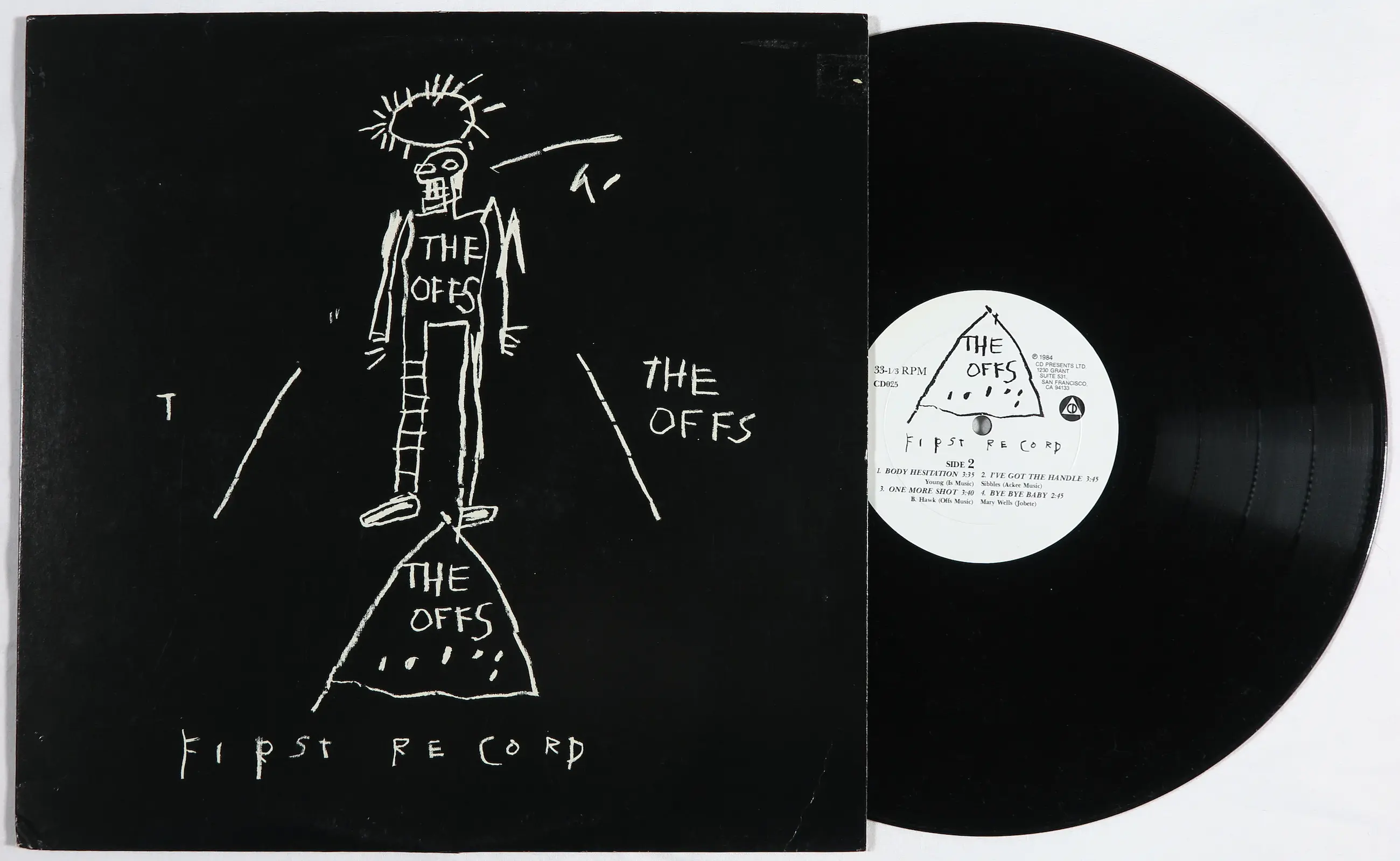 Toen Jean-Michel Basquiat negentien was, verhuisde hij met zijn toenmalige vriendin, Alexis Adler, naar een afbrokkelend appartement in Manhattan. Daar, herinnert ze zich, "speelde de hele tijd muziek." Muziek was een bron van creatieve inspiratie voor Basquiat, wiens werk vaak muzikale motieven zoals jazzartiesten en koperblazers verbeeldde. Voor zijn vroege dood op 27-jarige leeftijd ontwierp de straatartiest ook de albumhoezen voor twee vinylplaten. Het eerste ontwerp was voor Beat Bop, een rapstrijd uit 1983 tussen de door graffiti-artiesten omgedraaide MC's KRoband Rammellzee. Basquiat financierde en produceerde de track op zijn eigen muzieklabel, Tartown Inc. Zoals de legende luidt, stormde Basquiat zelf de opnamecabine binnen tijdens de verhitte sessie - hoewel zijn songtekst de laatste plaat niet haalde. Dit item betreft Basquiat's tweede ontwerp; een cover uit 1984 voor de San Francisco punkband The Offs, toont een enkele figuur in Basquiat's traditionele cartoonachtige stijl en kinderachtig schrift.