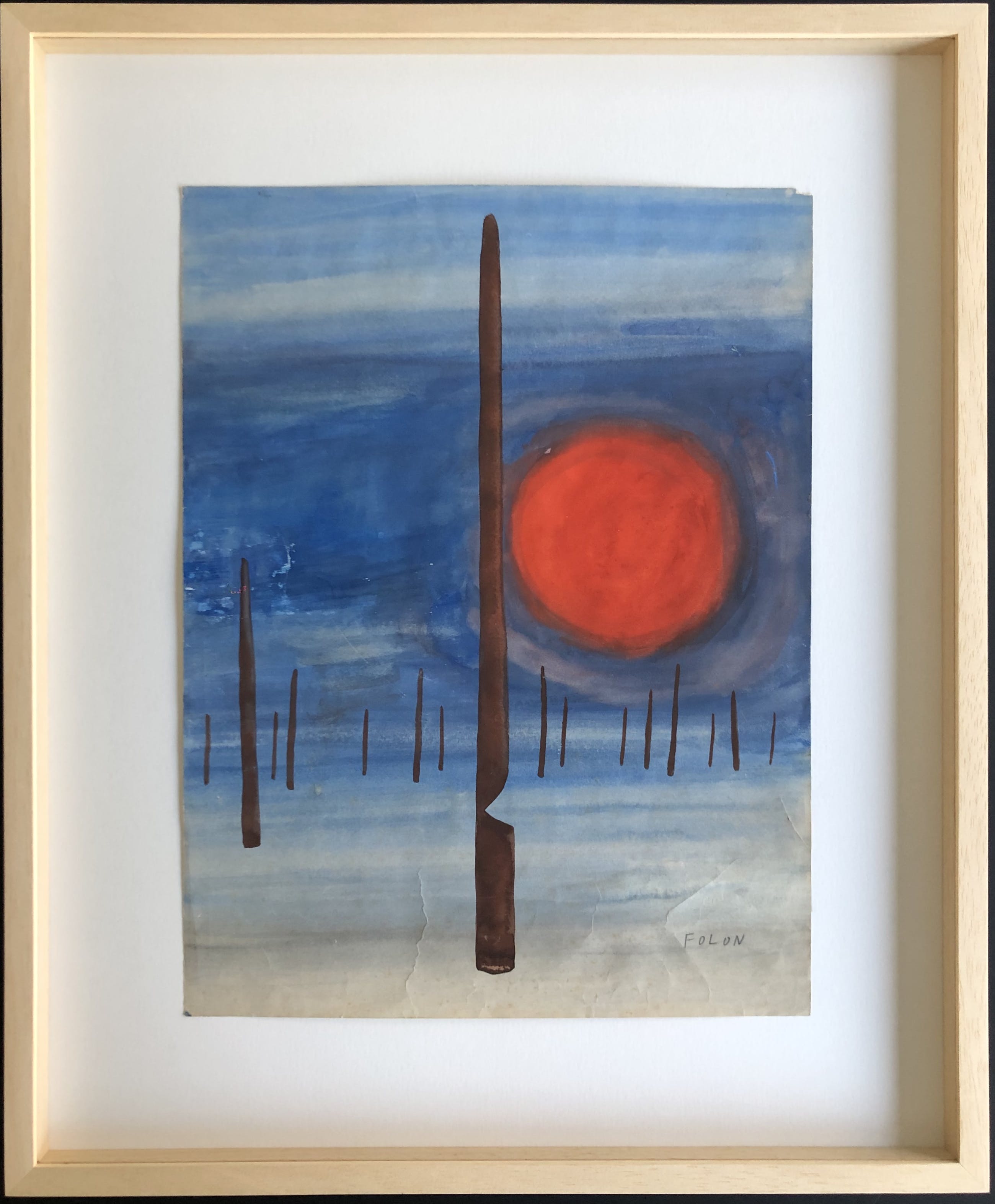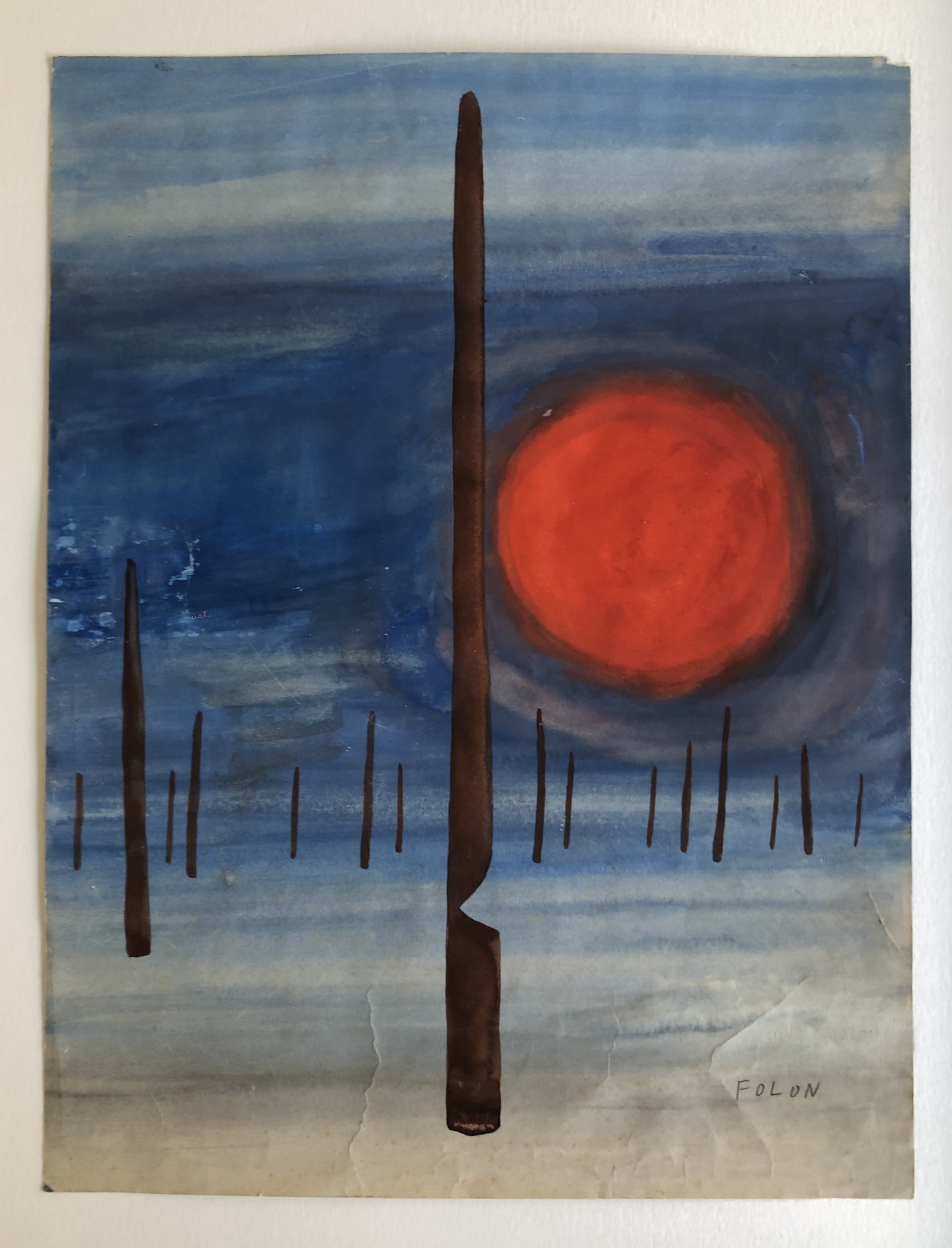 Oude originele aquarel van Jean-Michel Folon. Enkele jaren geleden privé aangekocht in heel slechte staat. Beperkte restauratie en een mooie kader (bakje) laten het werk opnieuw schitteren. Het werk heeft nooit zon gezien, de kleuren zijn nog heel intens. Verkoop wegens aankoop ander werk.