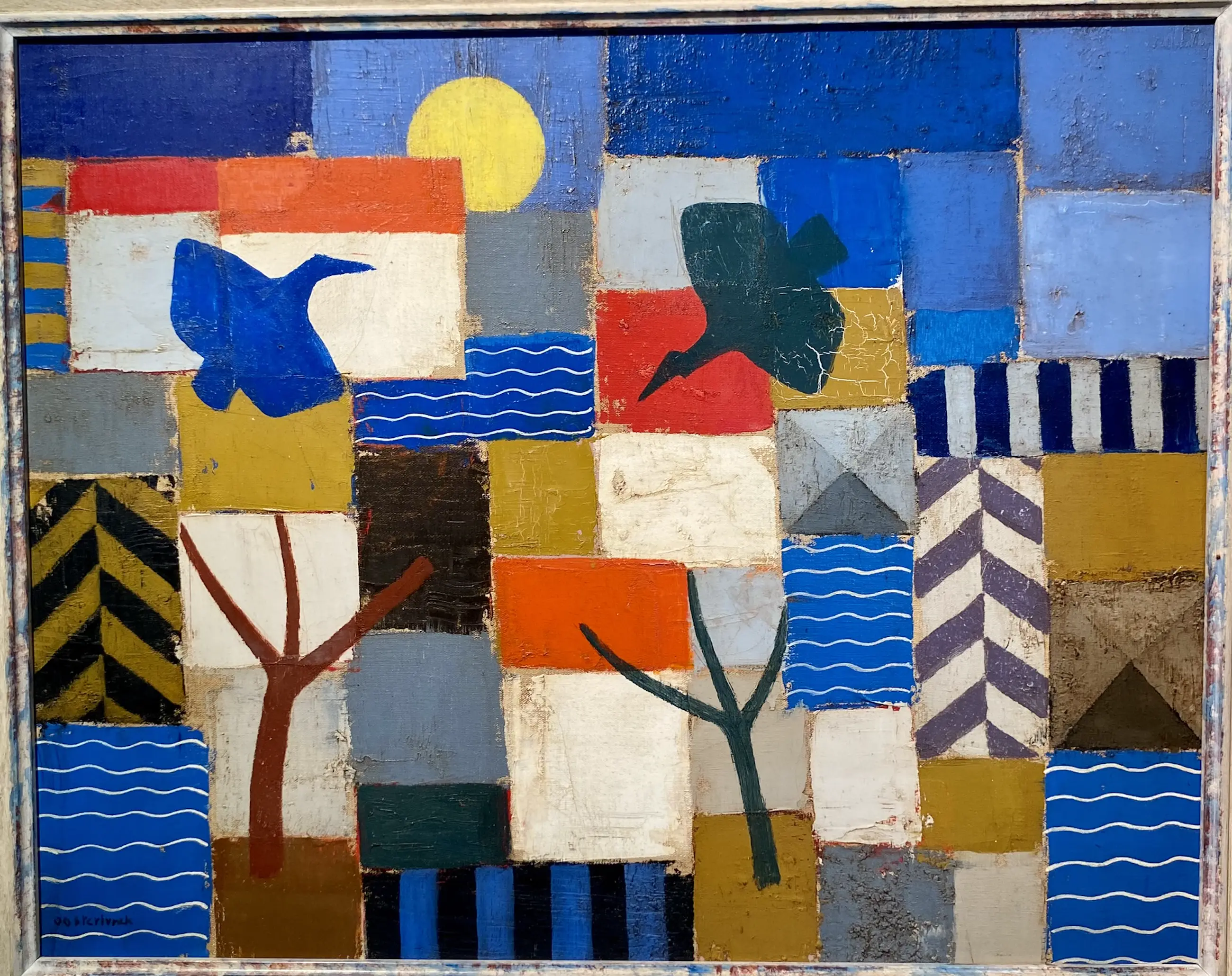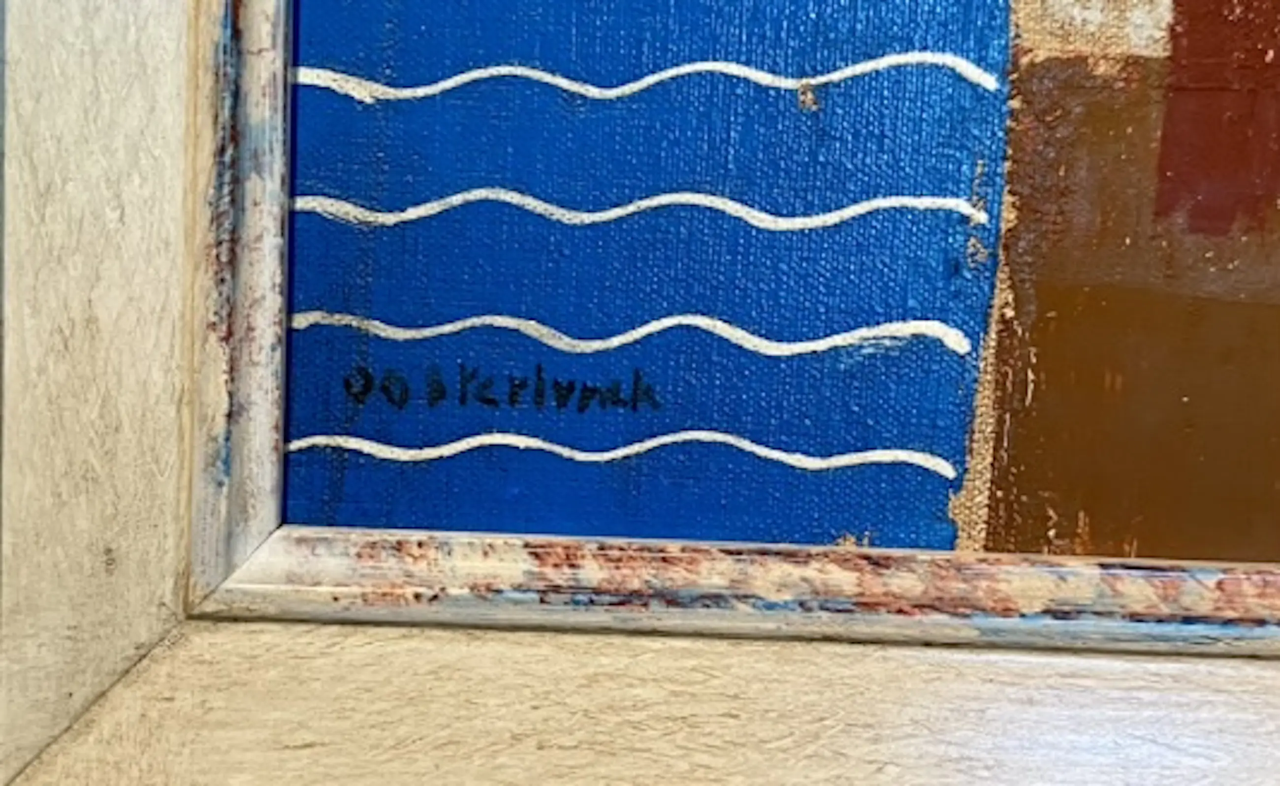 "Zon zee strand" schilderij van Belgisch kunstenaar Jean Oosterlynck. Aangekocht bij Guy Pieters Gallery op 02/08/1994. Olieverf op doek.