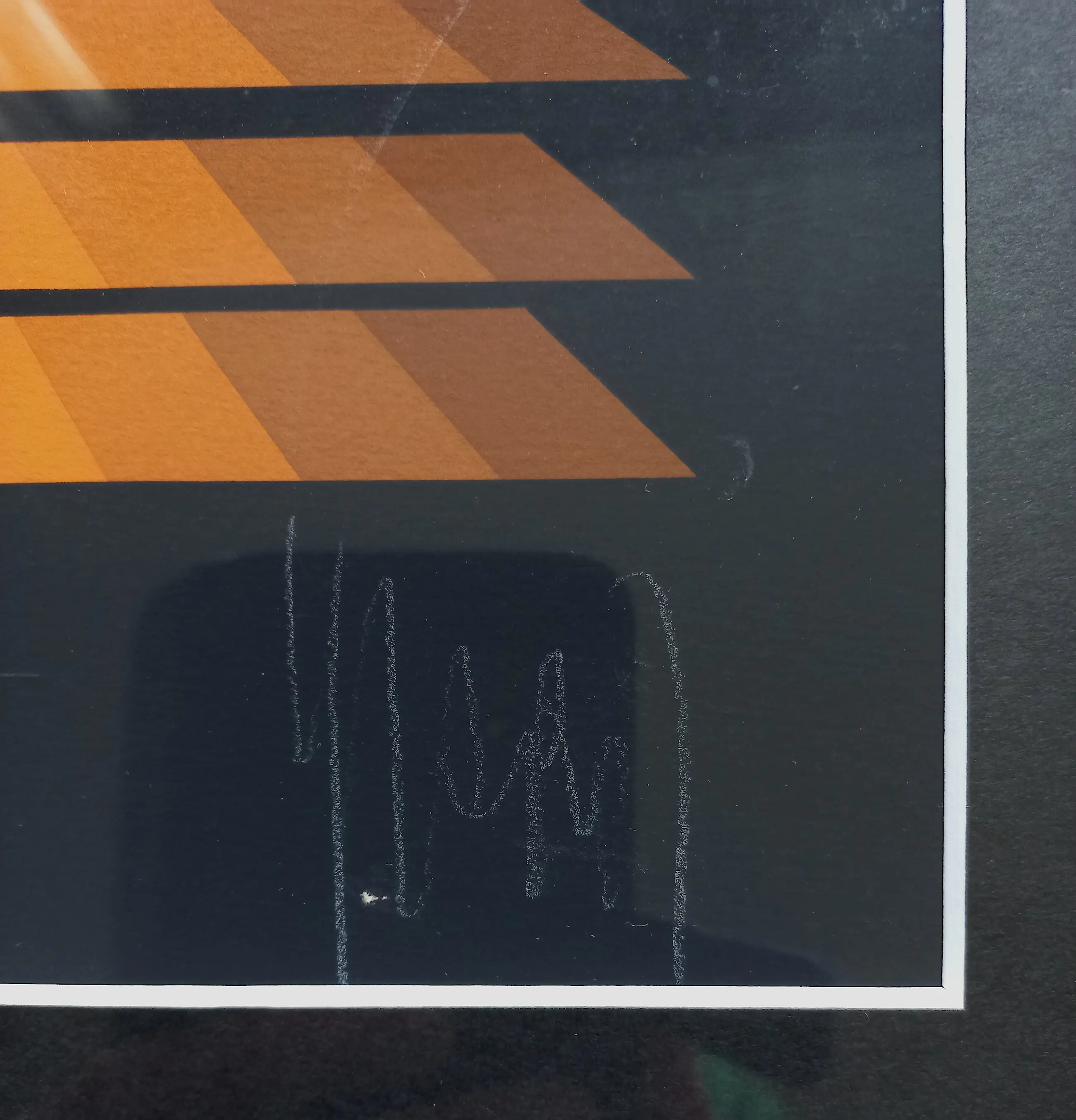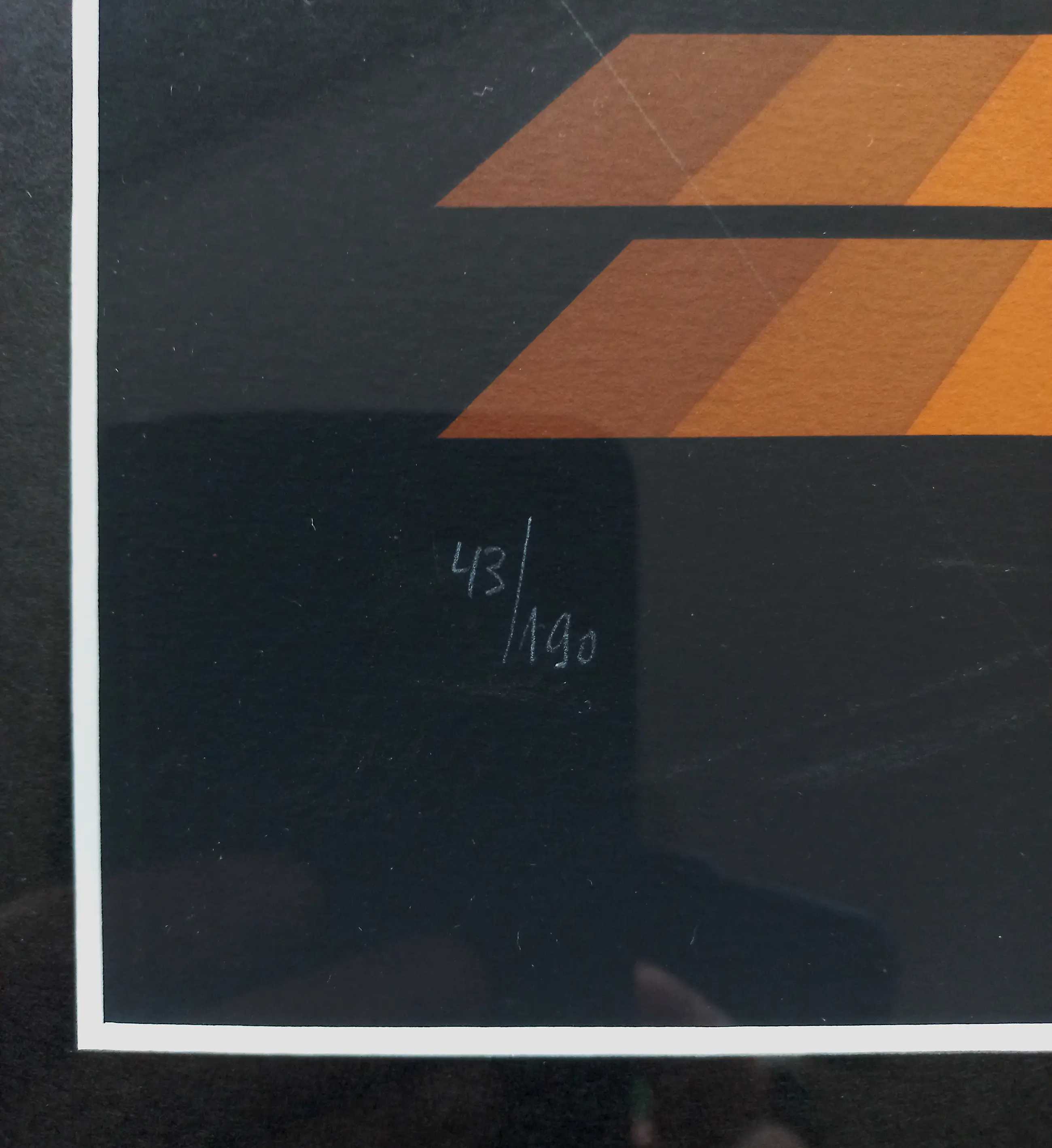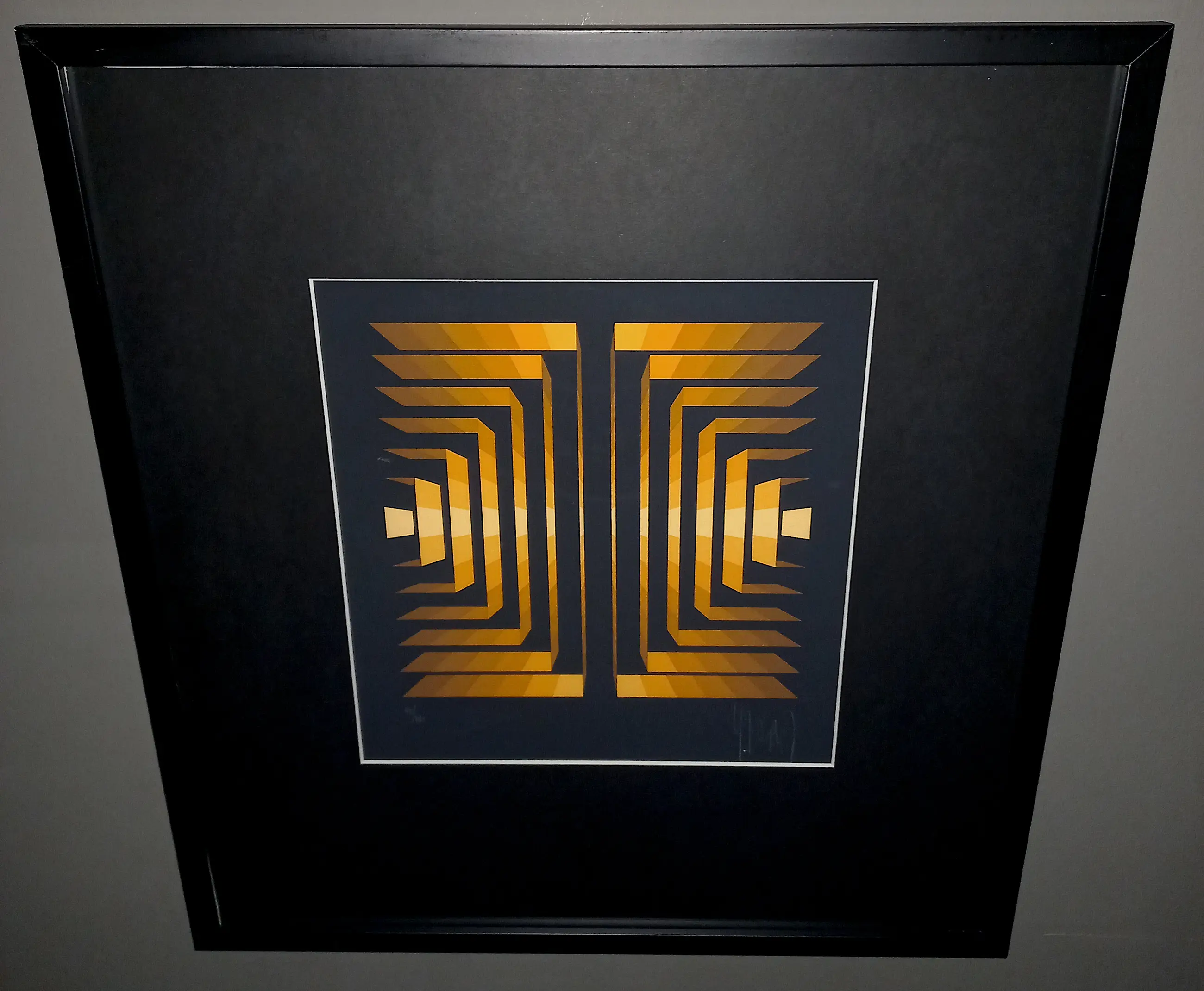 Mooie, karakteristieke compositie van Jean-Pierre Vasarely (pseudoniem: Yvaral), de zoon van Victor Vasarely. Zeefdruk op zwart papier, met wit potlood gesigneerd en genummerd (43/190). Zeer mooi ingelijst, achter glas en met smetteloos, zuurvrij passe-partout. Alles in zeer goede conditie.