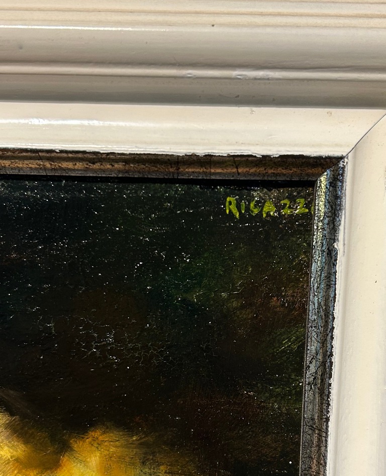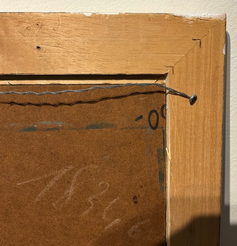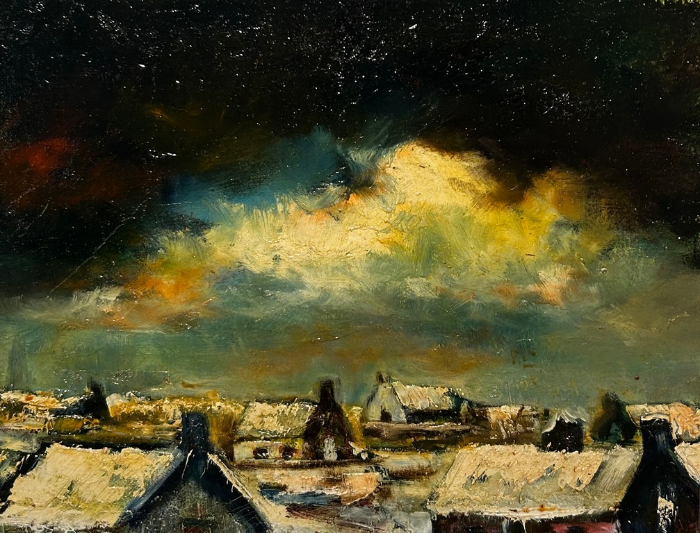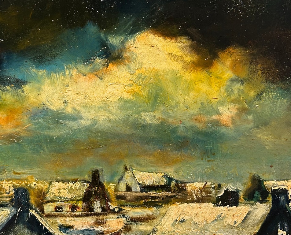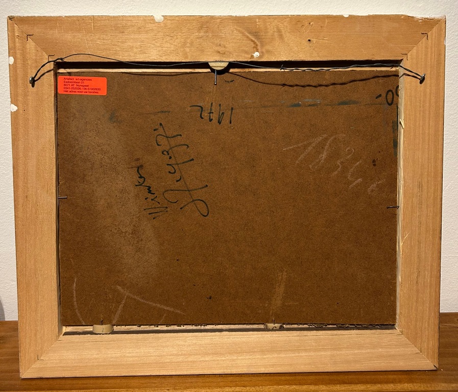 Sfeervol wintergezicht, rechtsboven gesigneerd. De lijst heeft enkele kleine beschadigingen.