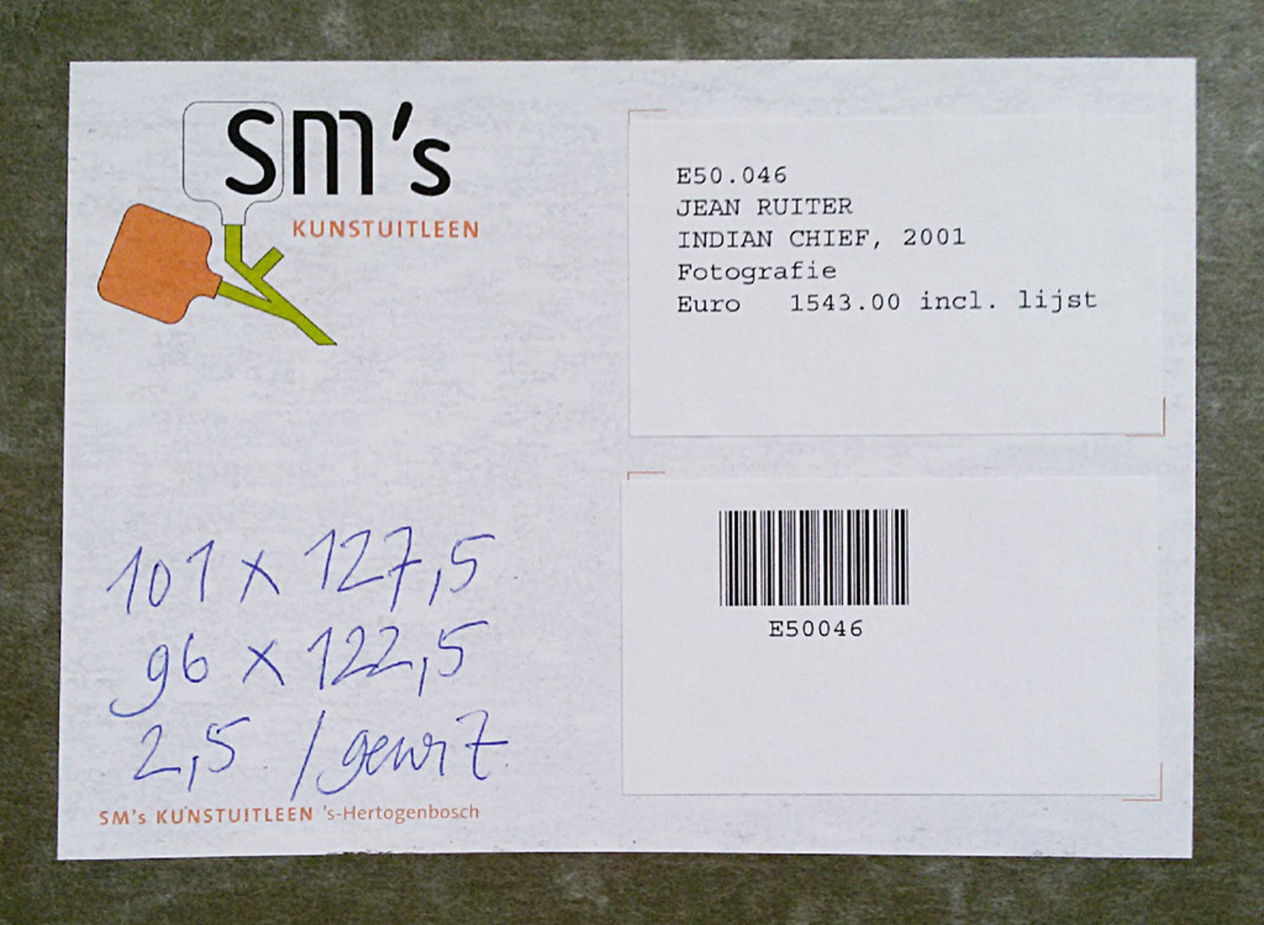 Prachtige compositie van Jean Ruiter uit de Silk Series. Foto (C-print) op glanzend papier, met potlood gesigneerd, gedateerd (‘01) en getiteld (“Indian chief, Ute Tribe”). In strakke, whitewashed houten lijst, achter glas en met smetteloos passe-partout. Alles in uitstekende conditie. Op andere plaatsen op internet wordt nog steeds 1500 tot 2000 euro gevraagd voor dit werk, zie ook de website van het Jean Ruiter Project (www.jeanruiter.com).