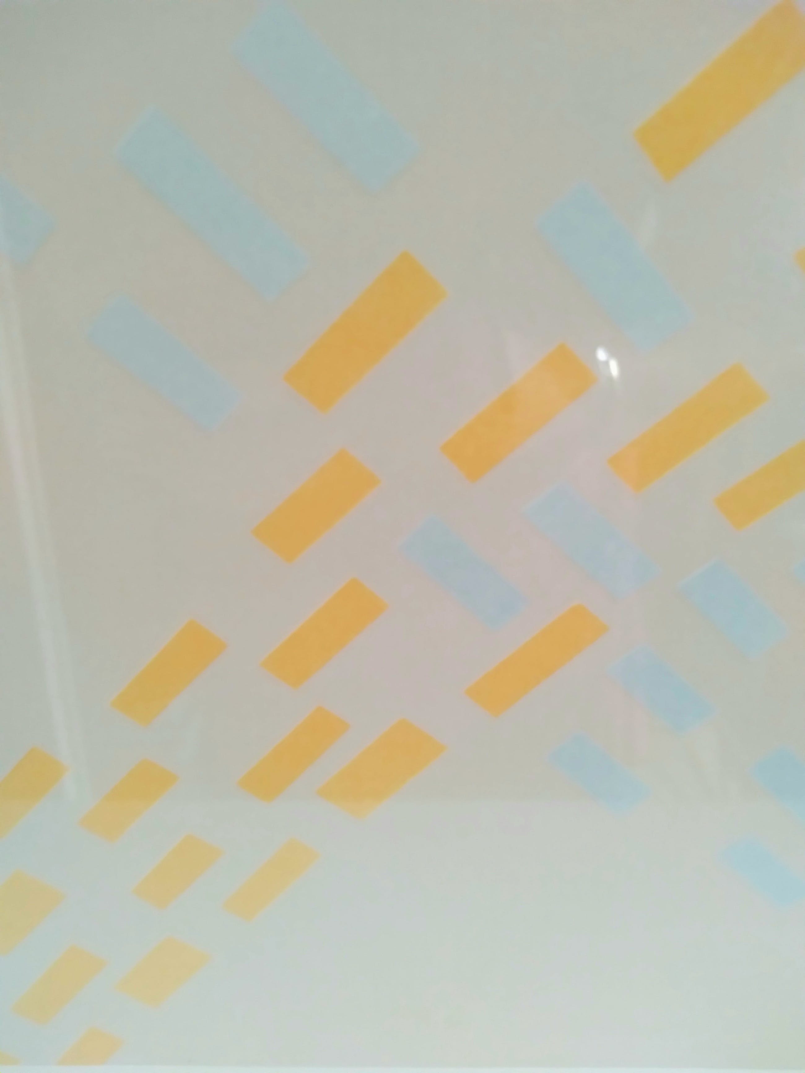 Subtiele vlakjes in zachtblauw en geel vormen een schijnbaar willekeurig patroon.