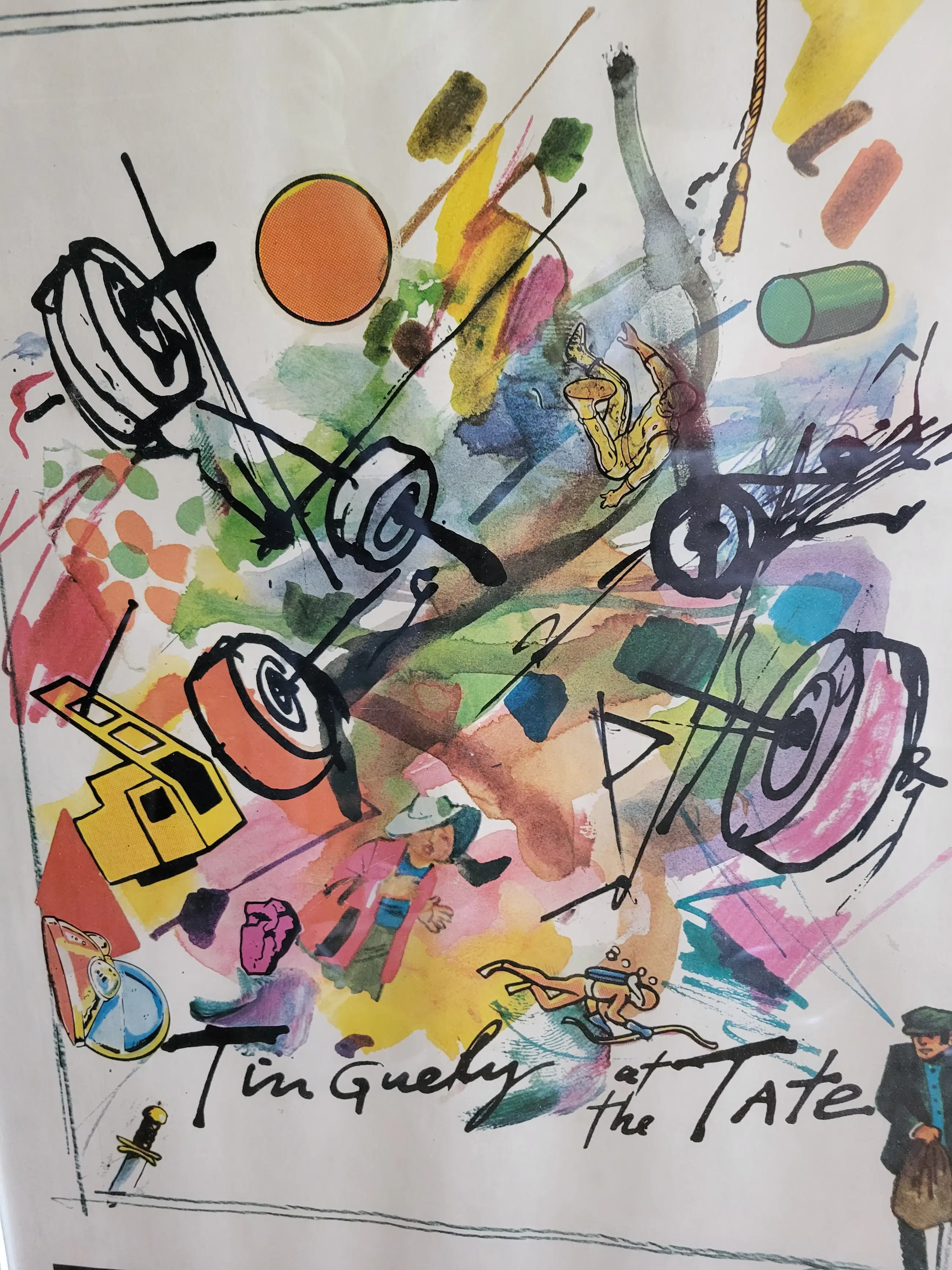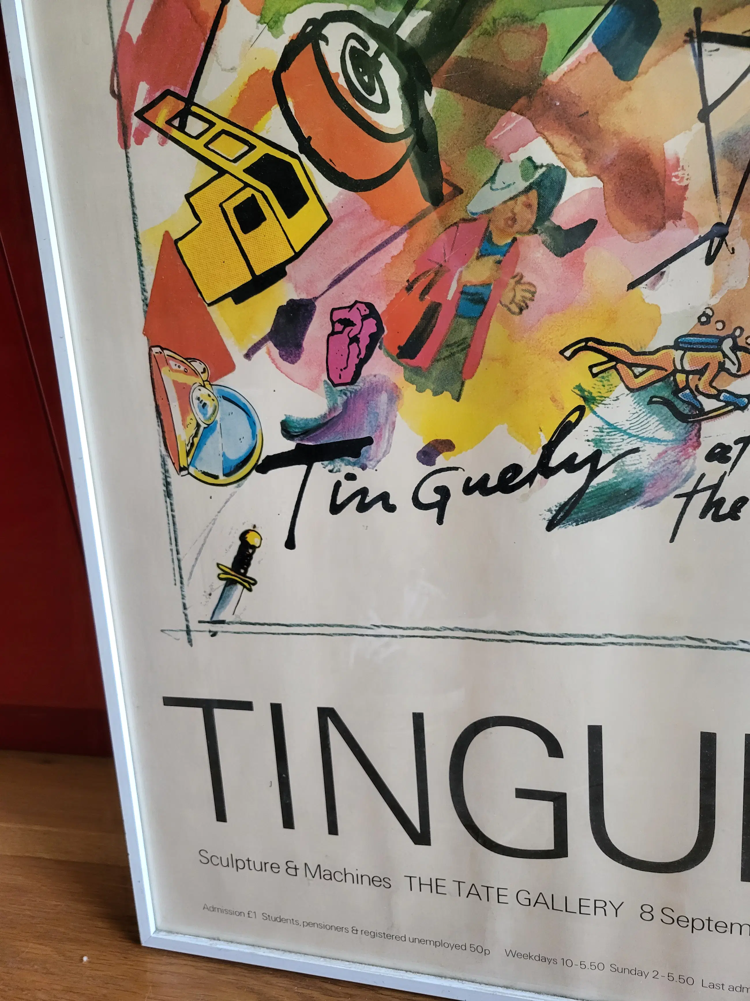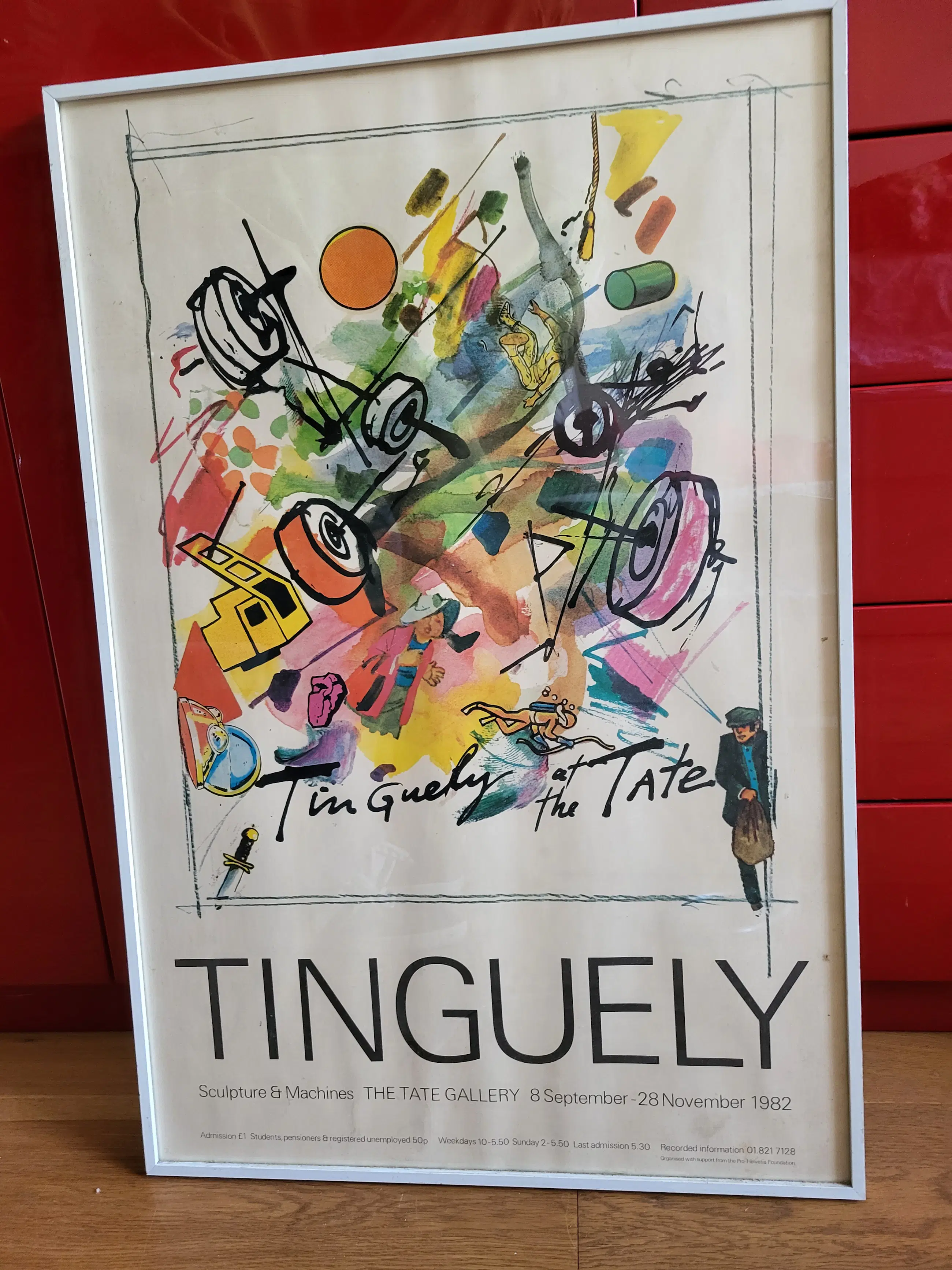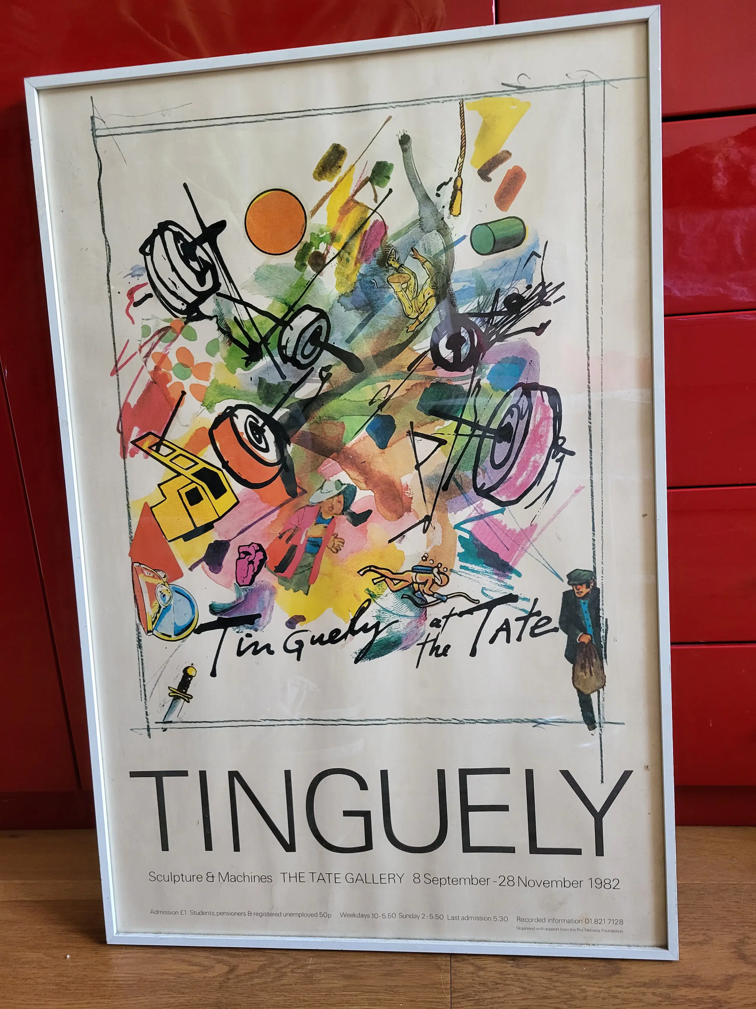 Originele zeefdruk poster uitgegeven door de Britse Tate Gallery in Londen voor de solo expo van Jean Tinguely in 1982. In mooie, stevige lijst, achter glas