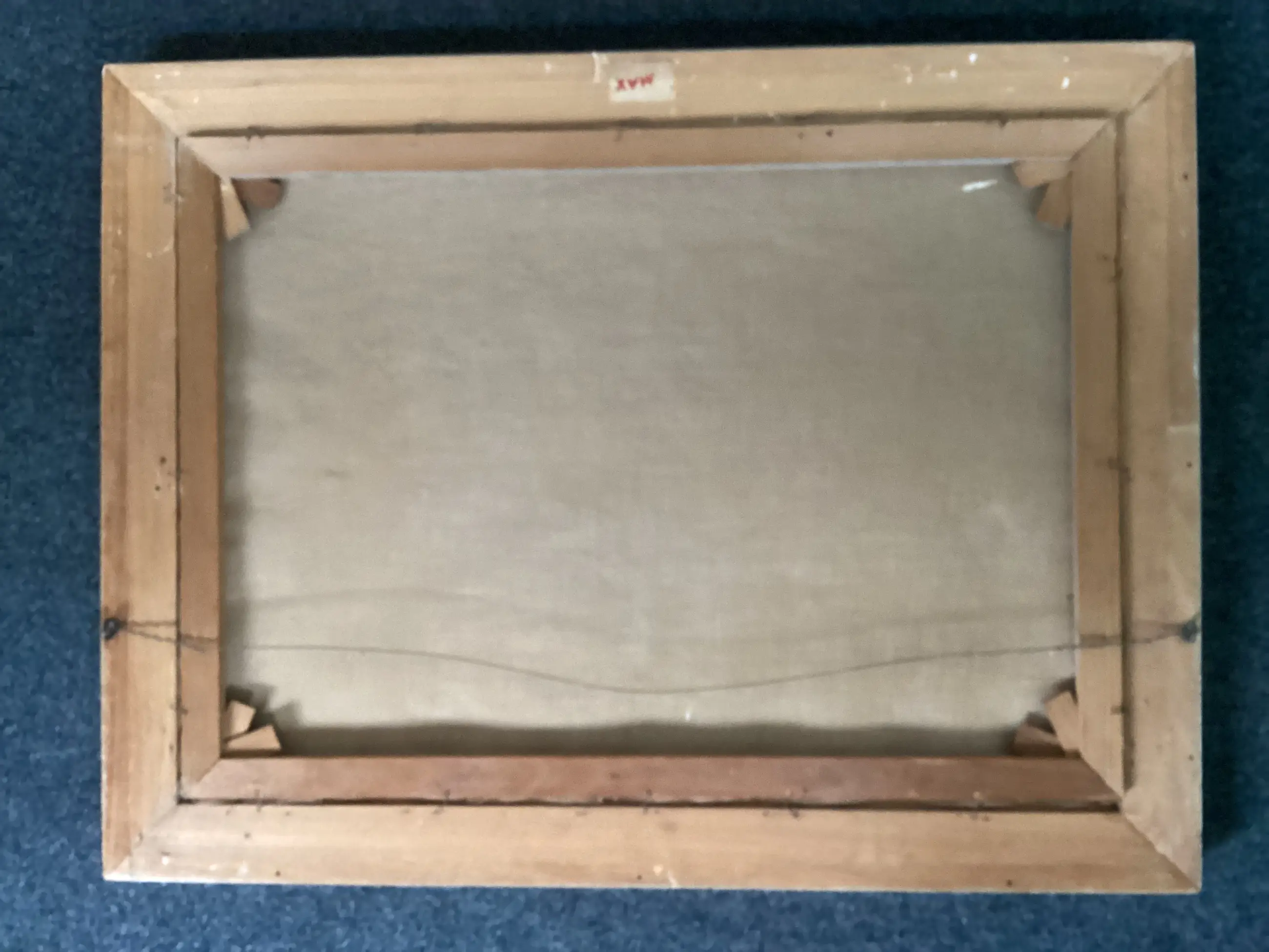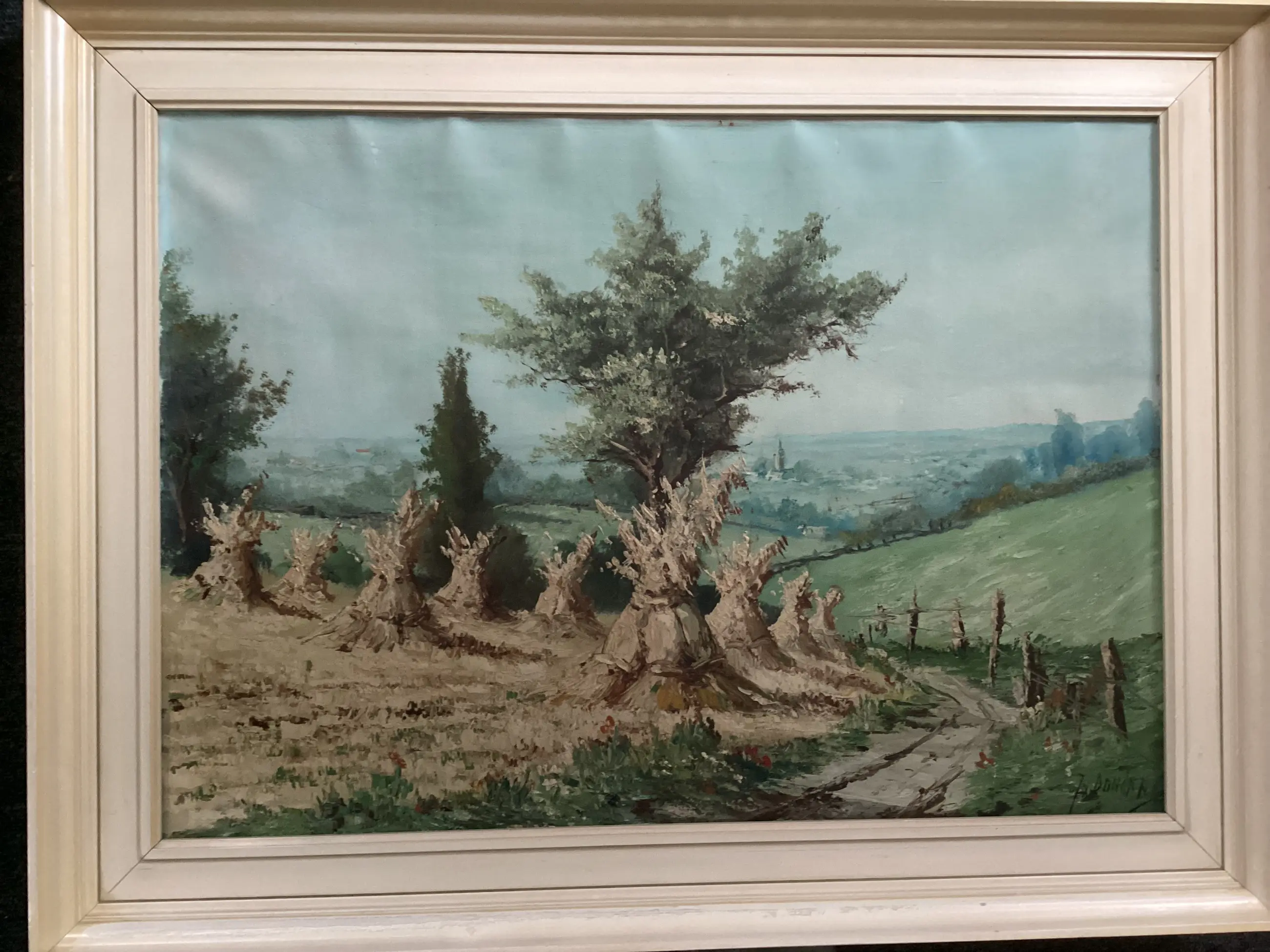 Veld met korenschoven met op de achtergrond een dorpje. Schilderij in redelijke staat, wellicht wat schoonmaken.