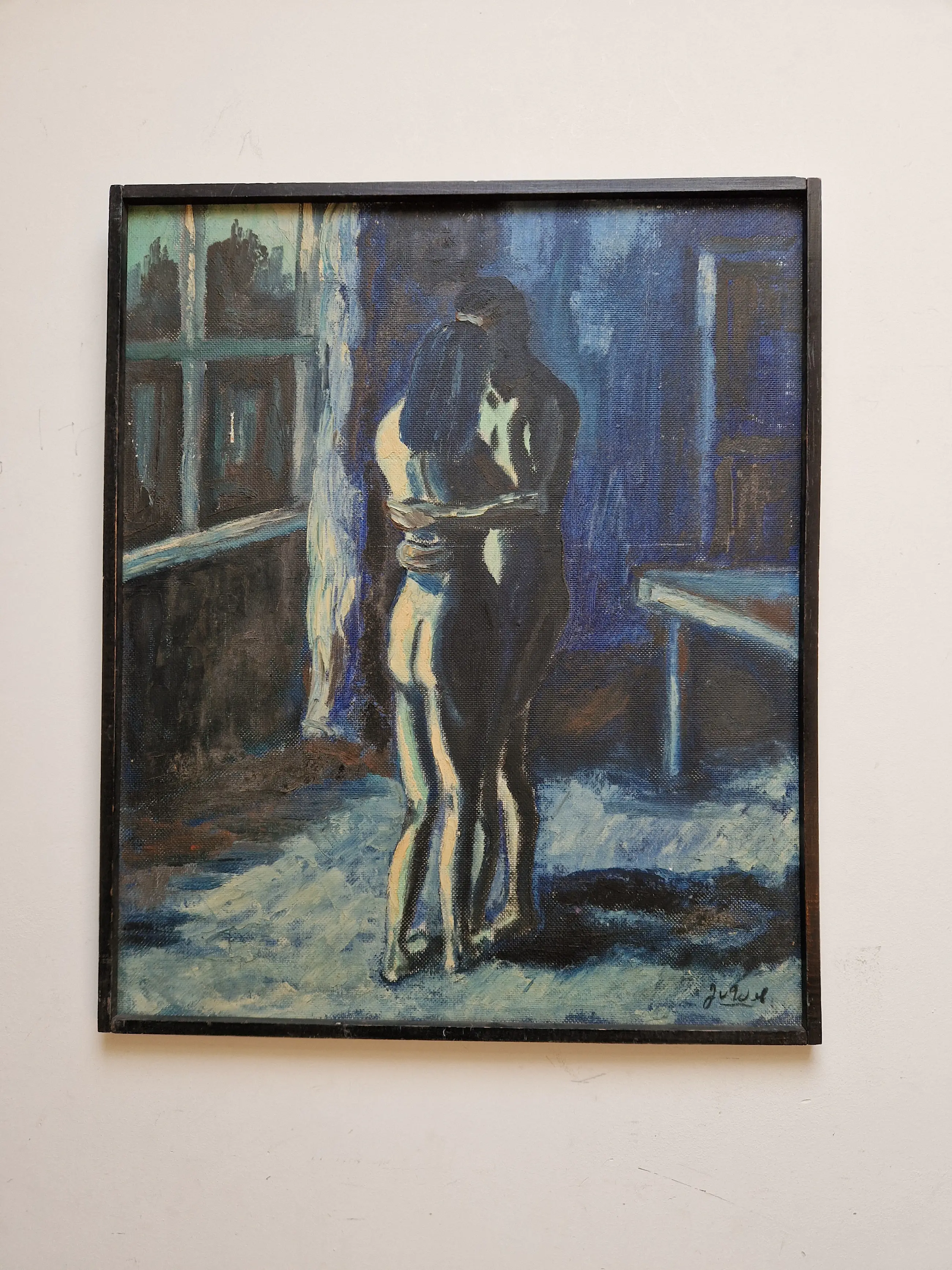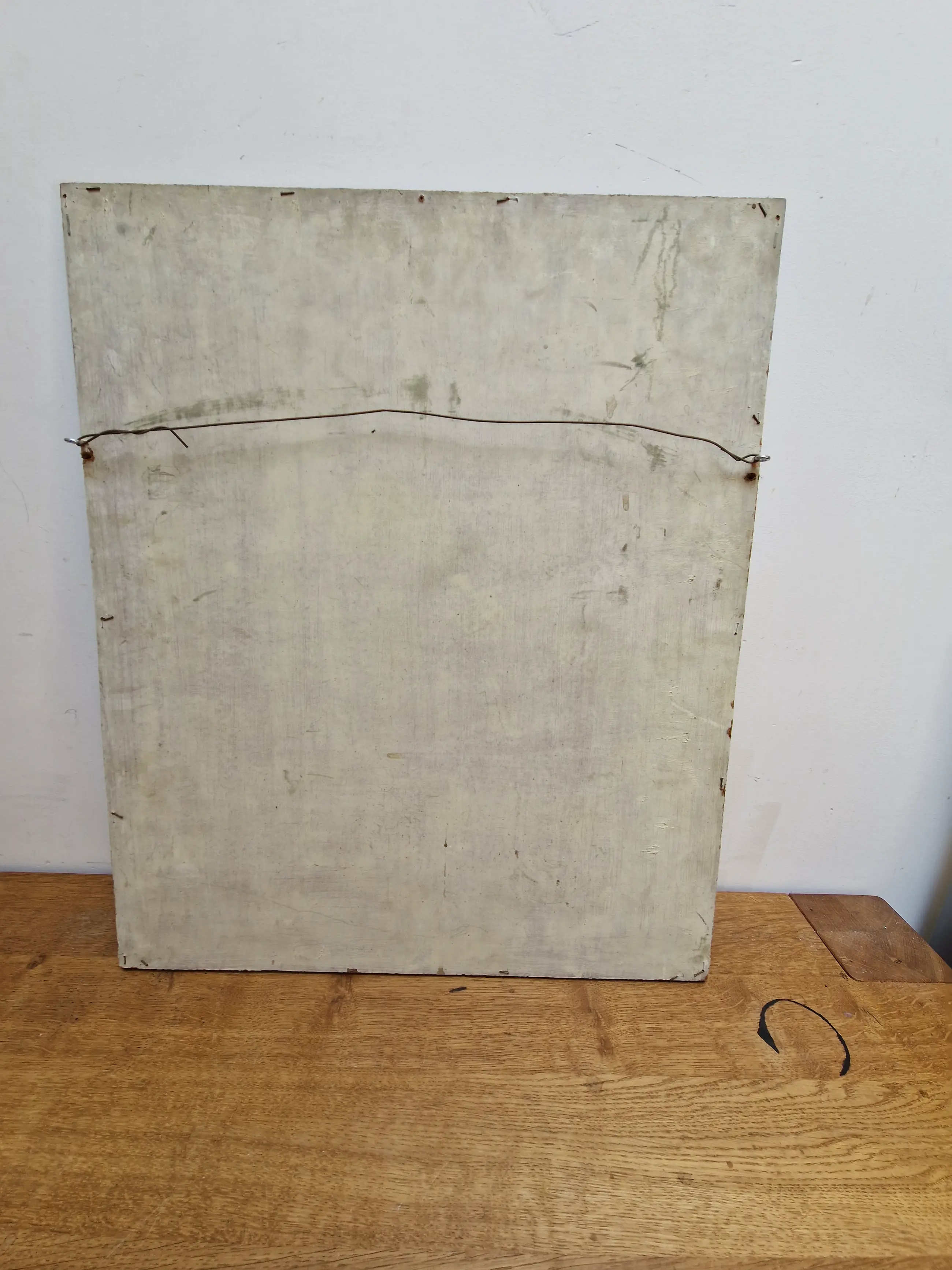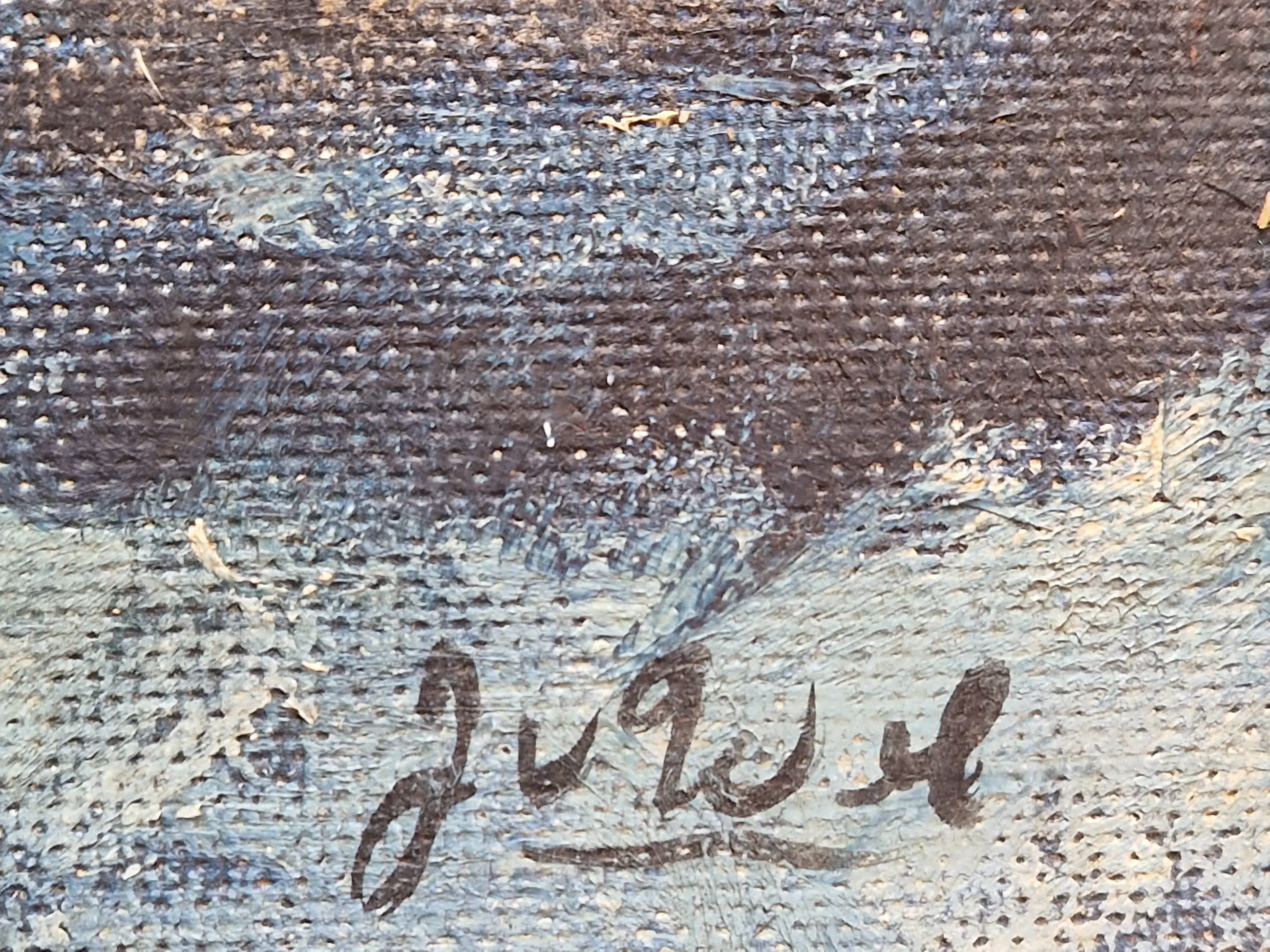 Bijzonder werk van de Vlaamse kunstenaar Jean van Wel (1906-1990). Olieverf op board in goede staat. De lijst is heel eenvoudig en bestaat uit latjes die op het werk zelf bevestigd zijn, vermoedelijk door de kunstenaar zelf. Gesigneerd rechtsonder.
