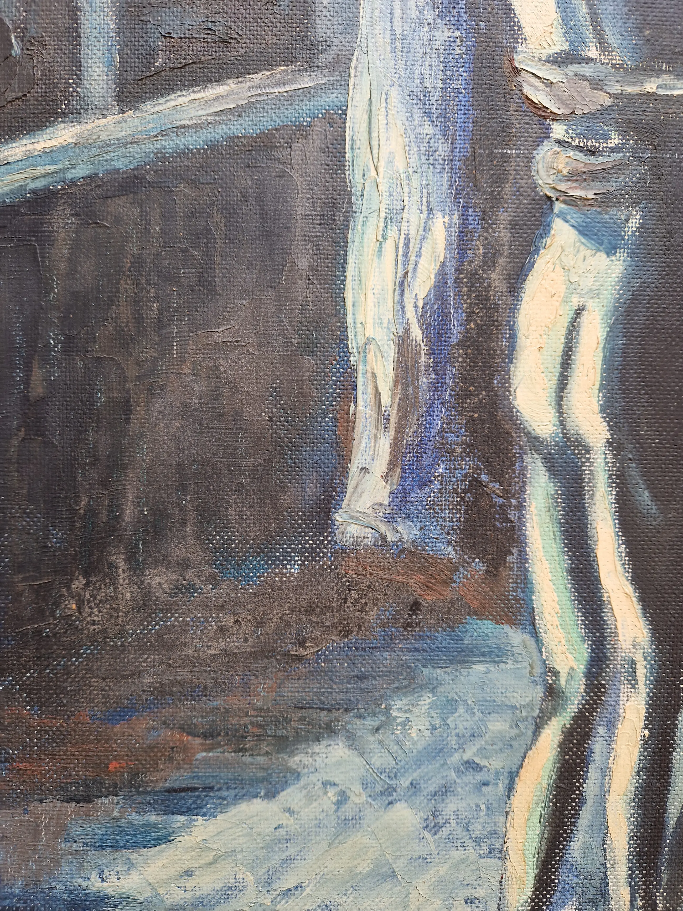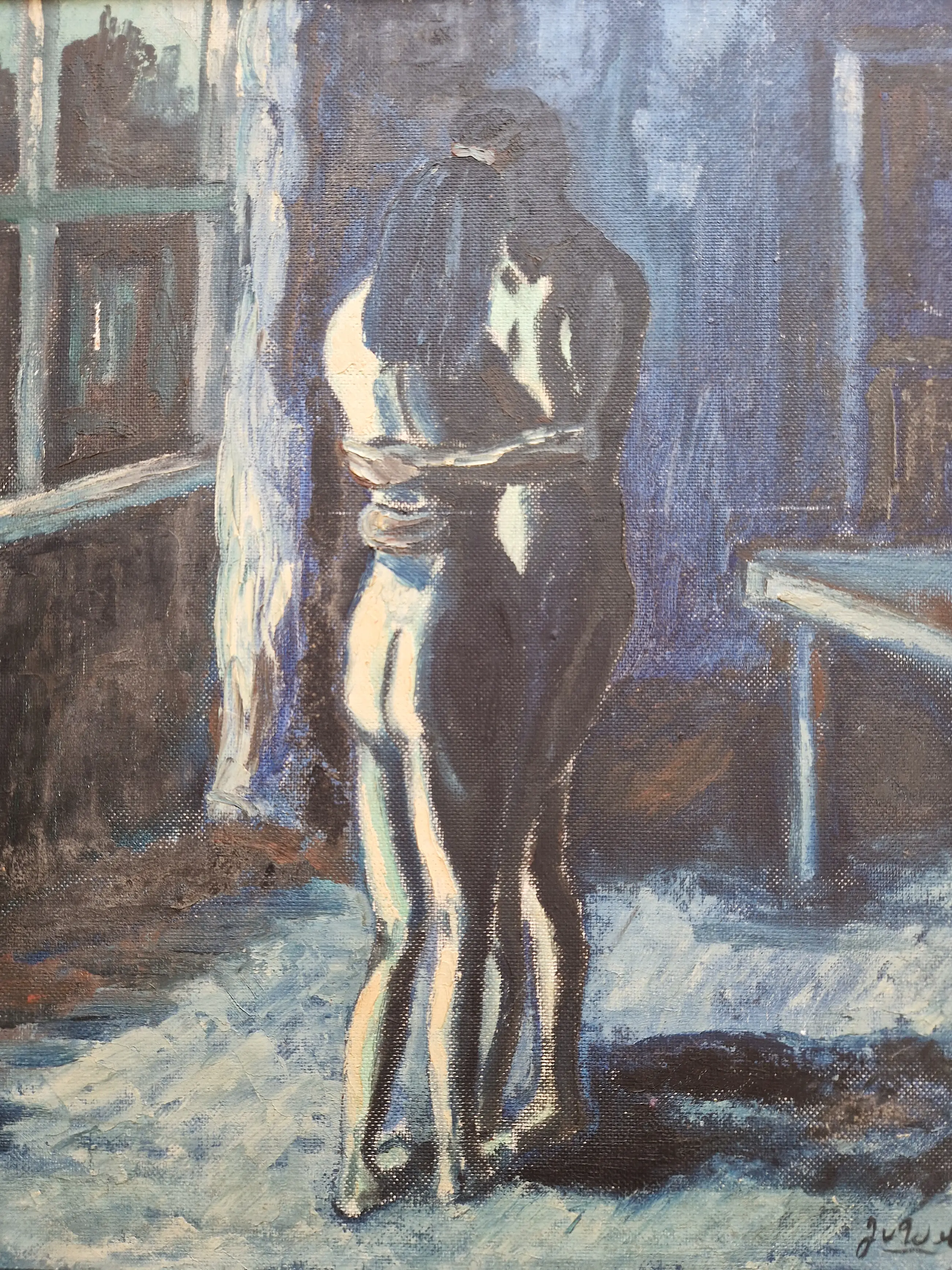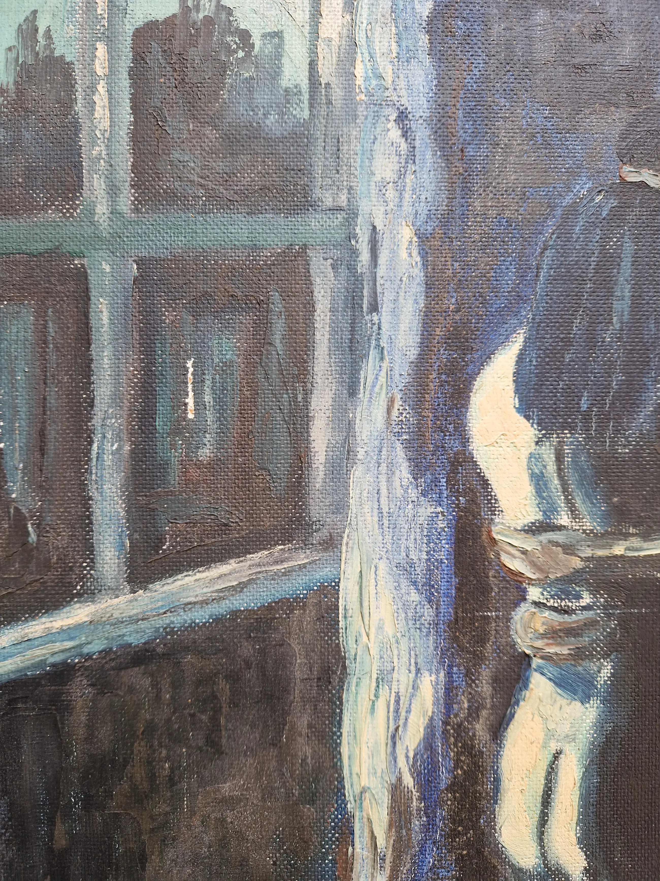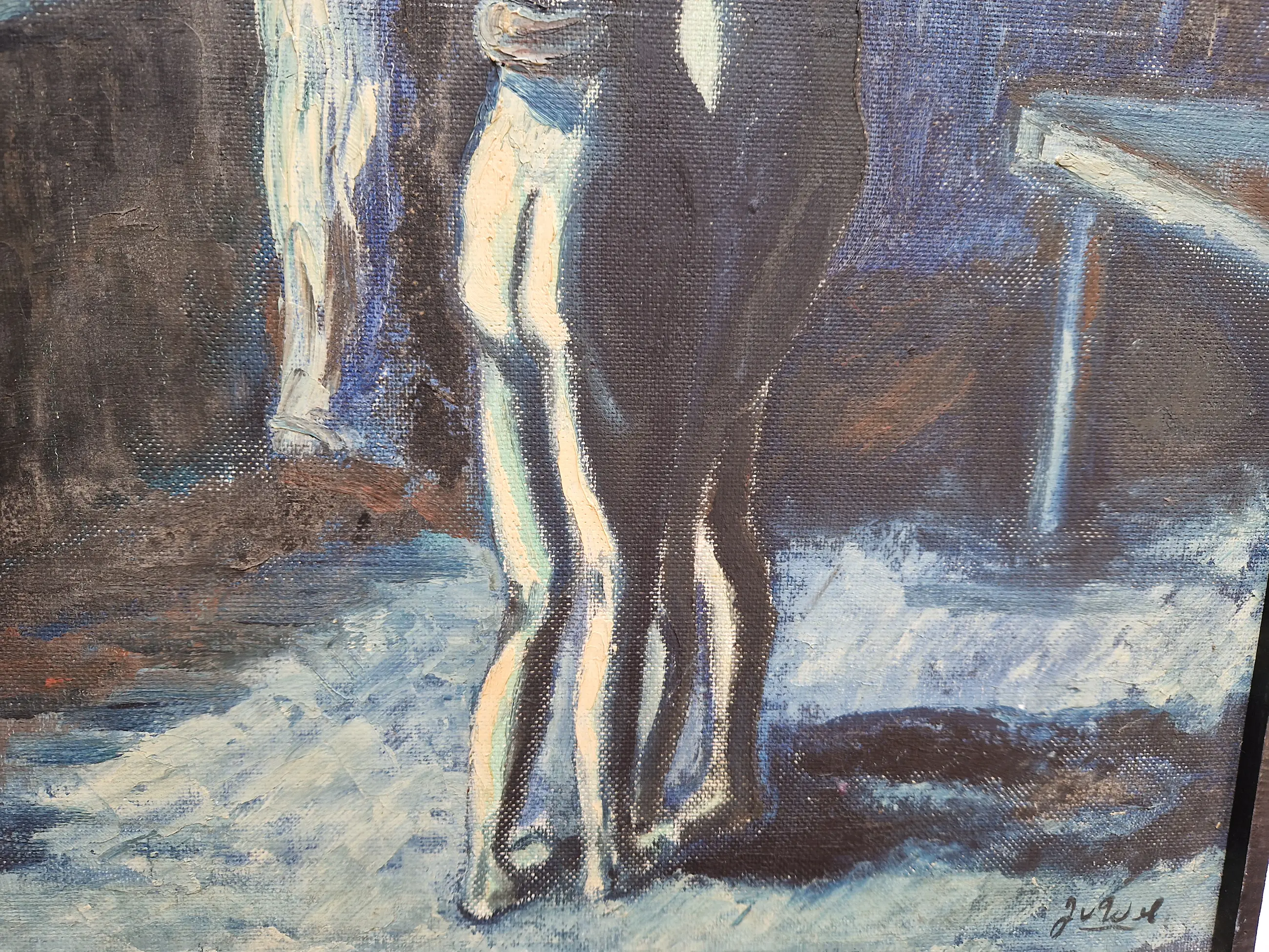 Bijzonder werk van de Vlaamse kunstenaar Jean van Wel (1906-1990). Olieverf op board in goede staat. De lijst is heel eenvoudig en bestaat uit latjes die op het werk zelf bevestigd zijn, vermoedelijk door de kunstenaar zelf. Gesigneerd rechtsonder.