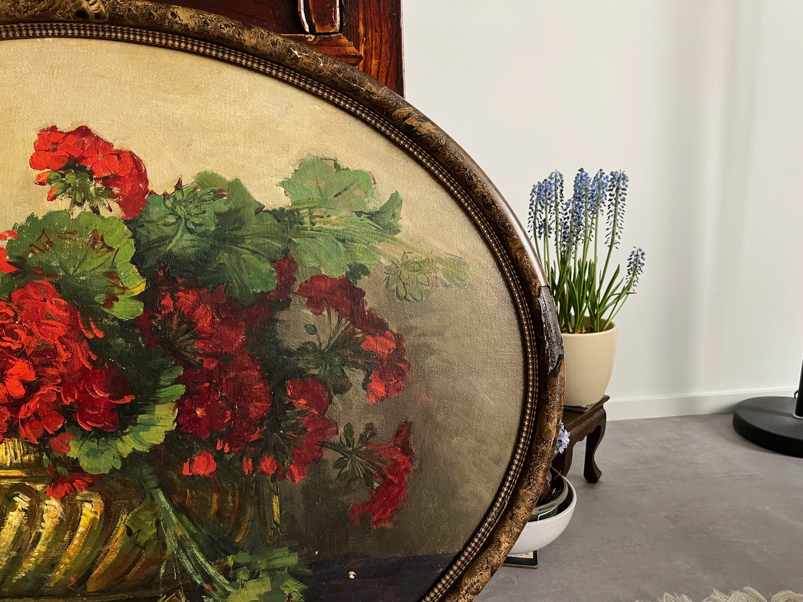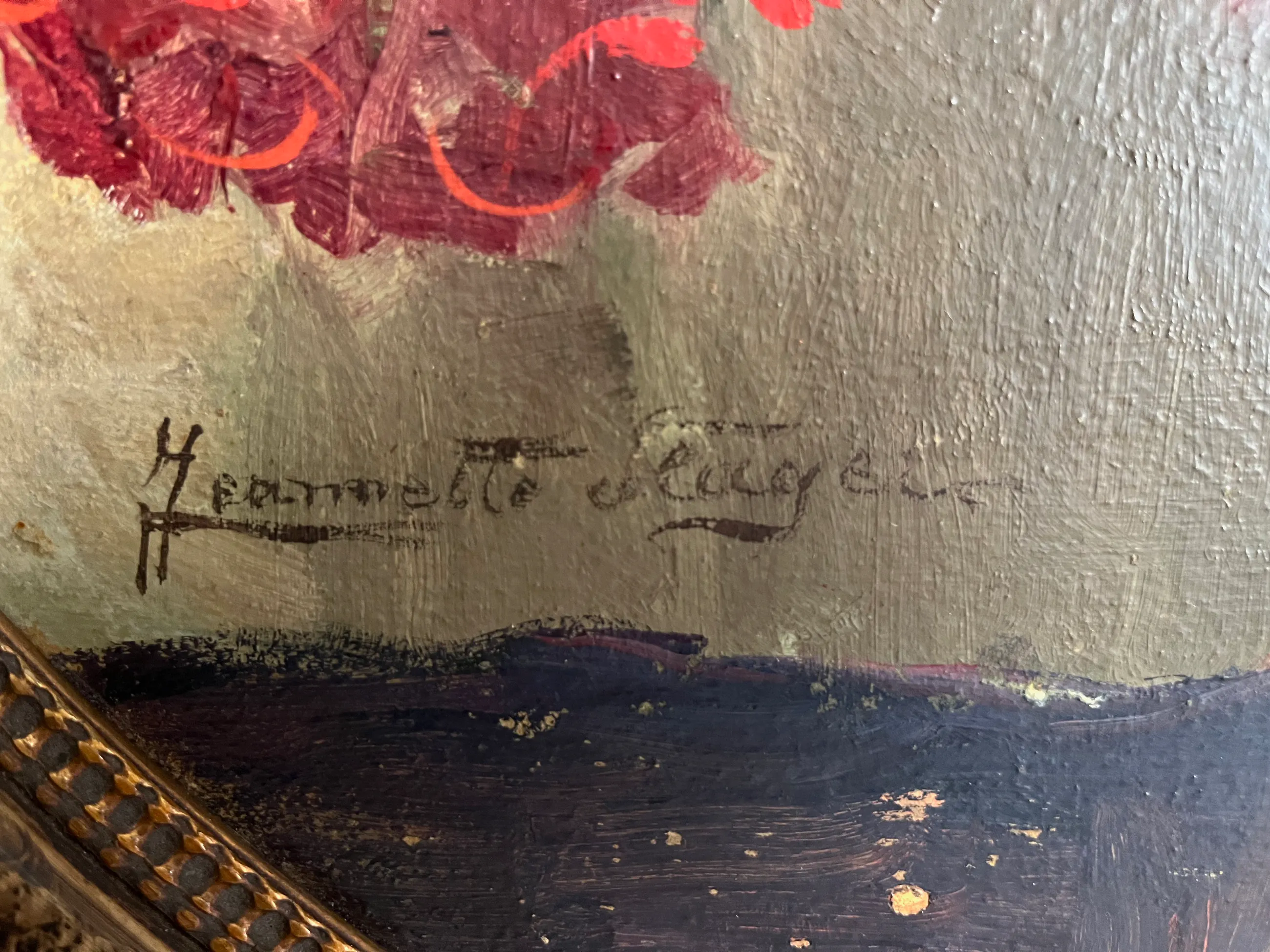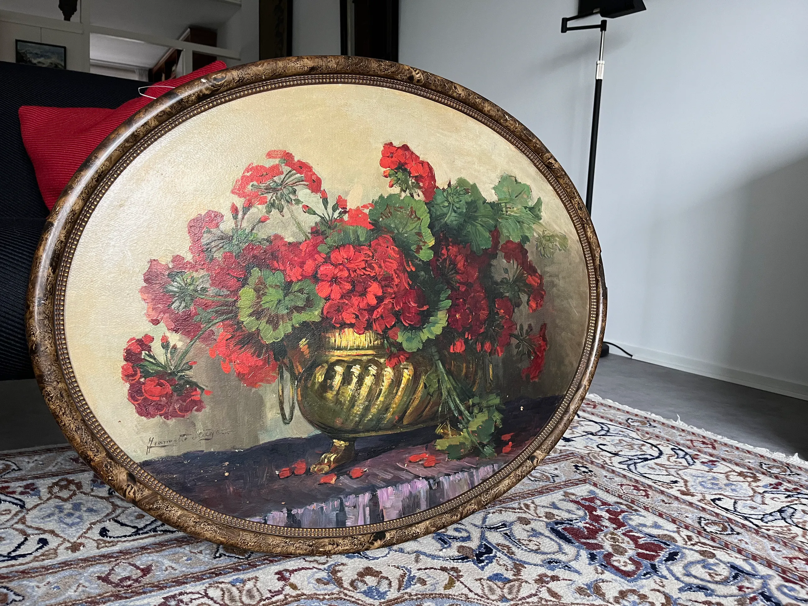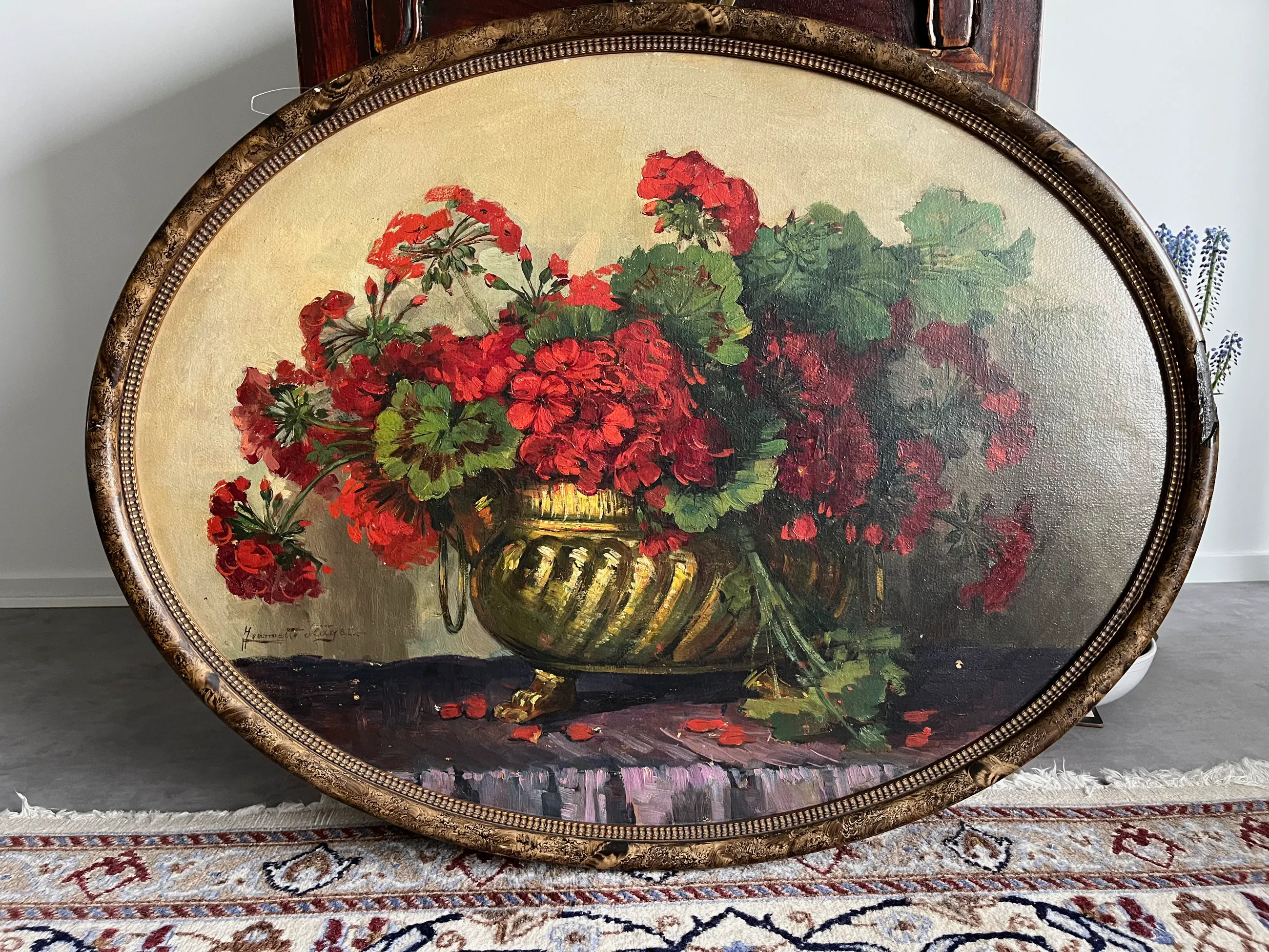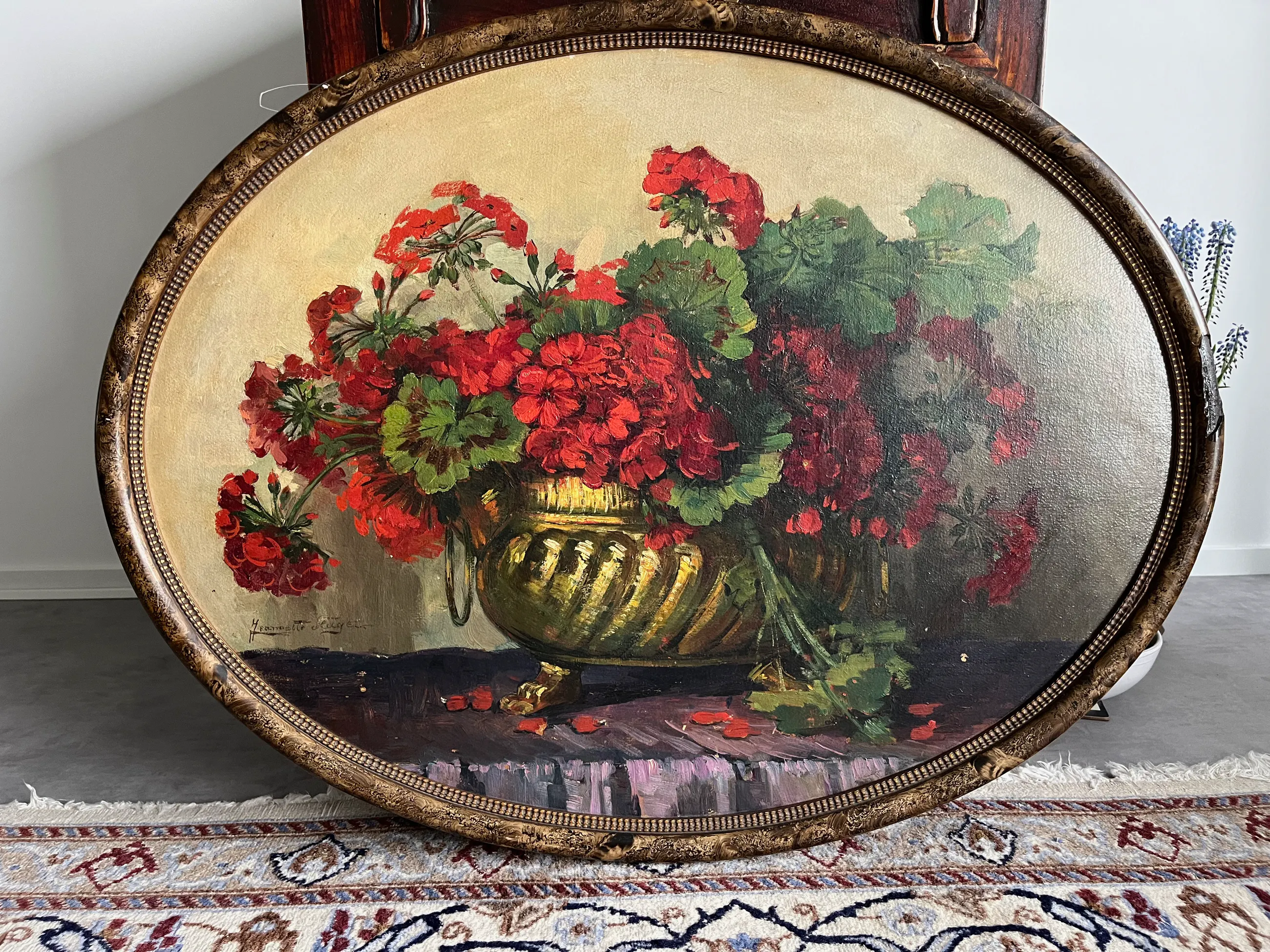 Ovaal olieverfschilderij van Jeanette Slager (1881-1945). Geraniums in Koperen Pot. De lijst meet 85 bij 66 cm. De afbeelding is 77 bij 59 cm.