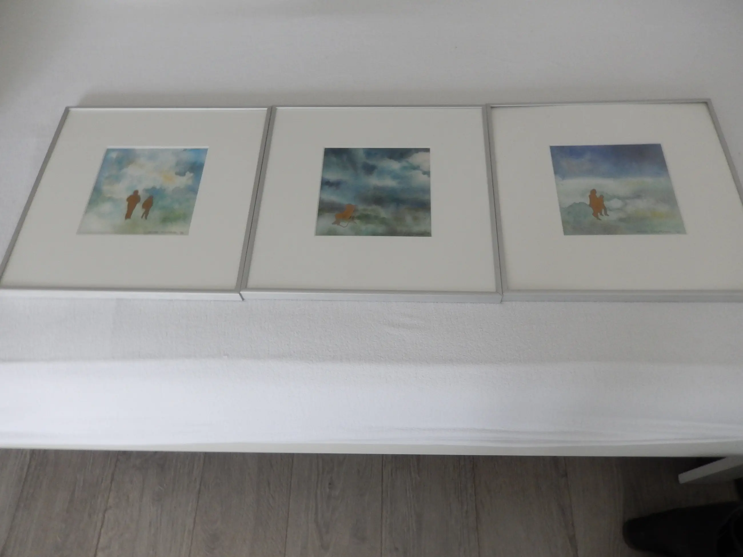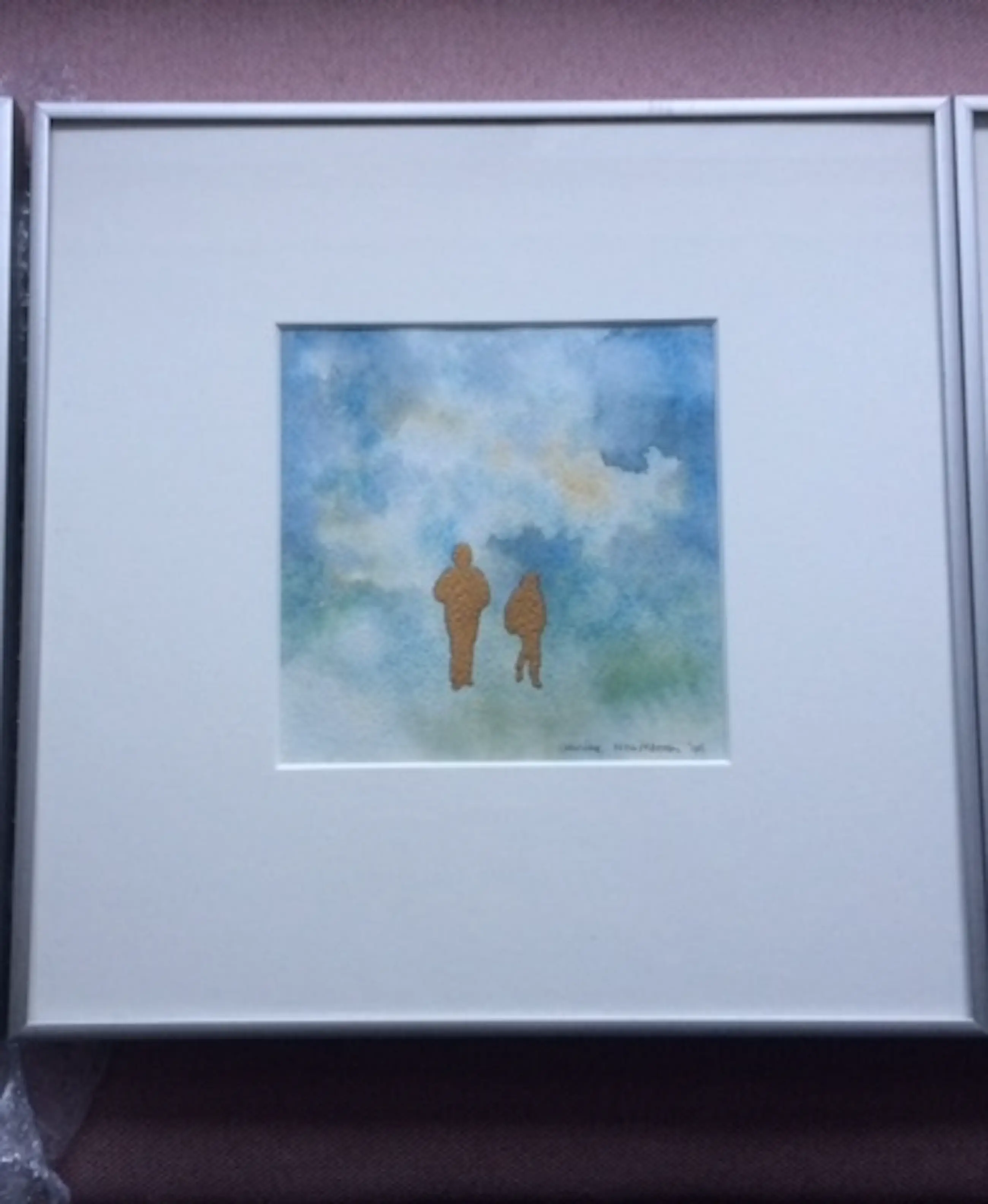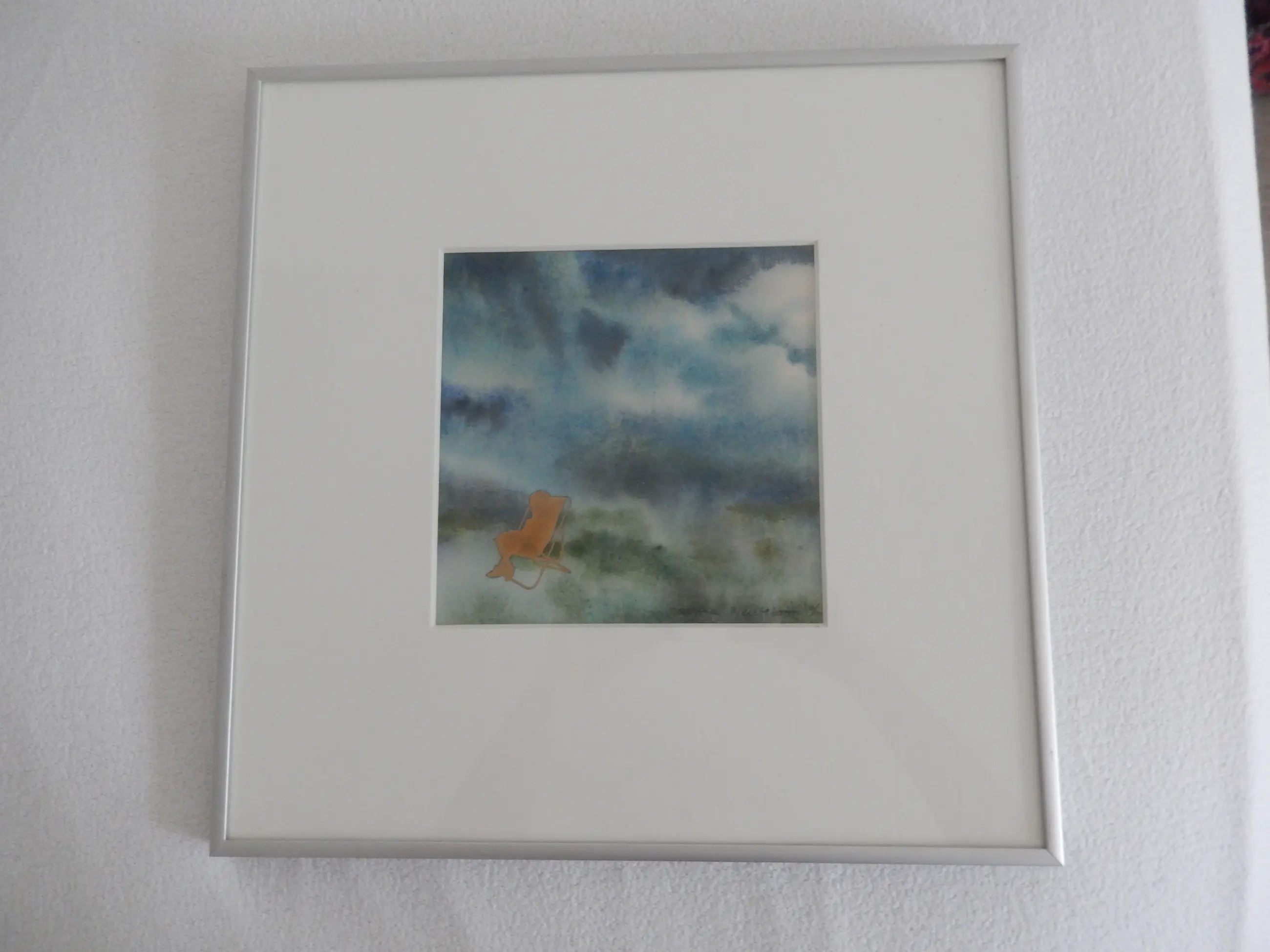 Charmante set van drie aquarellen in blauw en groen tinten met abstracte figuurtjes. De aquartellen zijn ingelijst met een passe-partout van 17,5 x 17,5 cm.