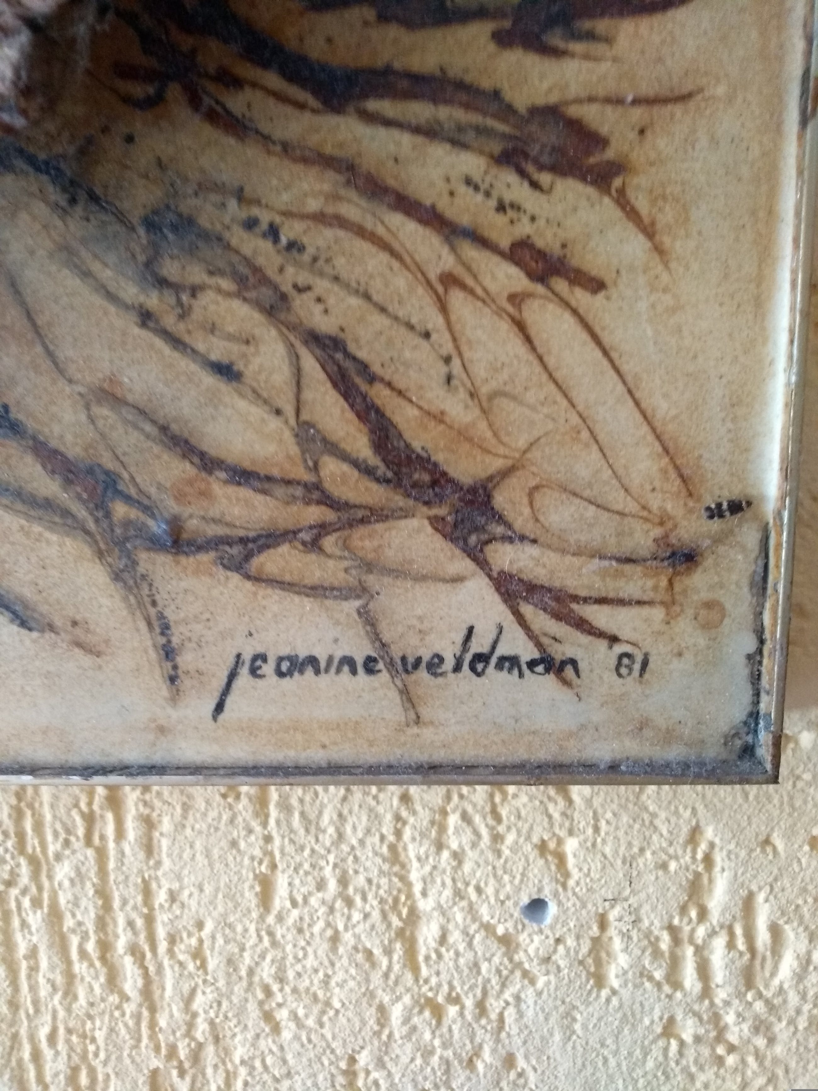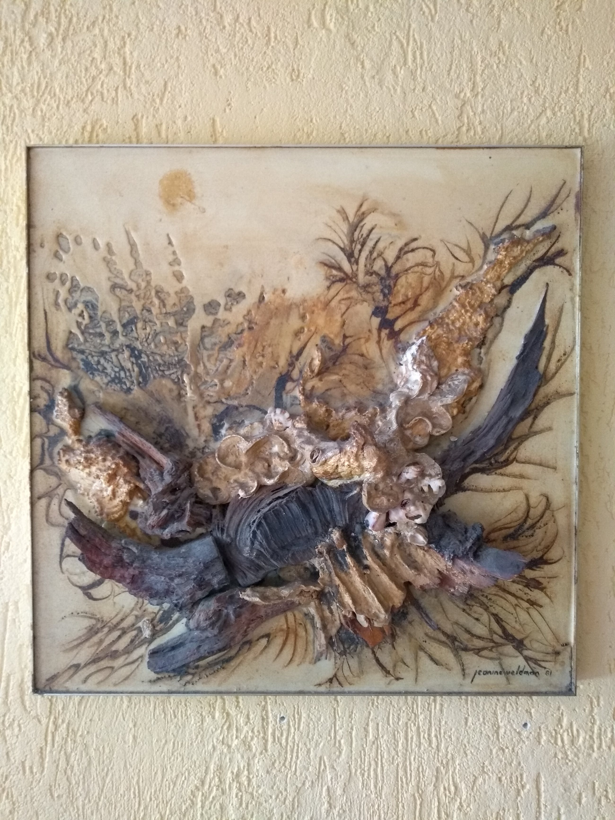 Het is een abstract werk met hout, stenen en schelpen.Er zit diepte in en die is maximaal ongeveer 7 cm hoog.
