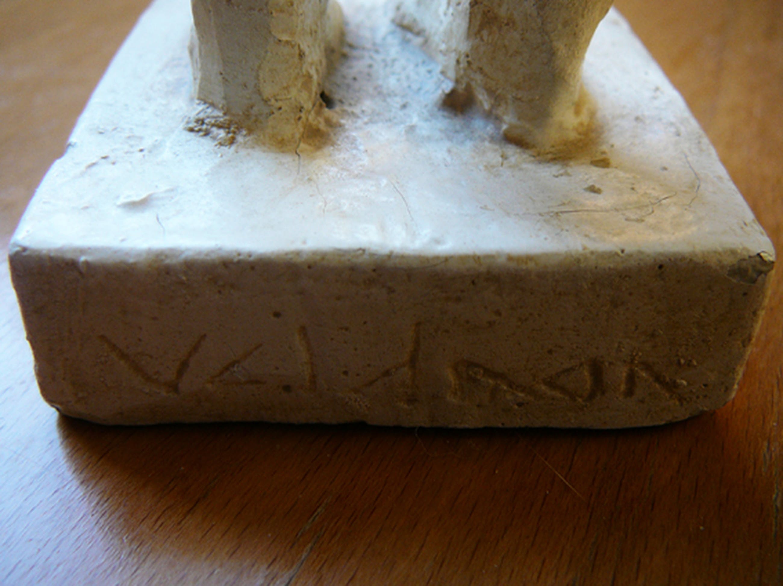 Ontroerend beeldje van een jong meisje In de voet gesigneerd 'Veldman' Formaat: 5 x 5 x 23 cm hoog Techniek: gebakken klei, licht-beige gepatineerd Conditie: perfect