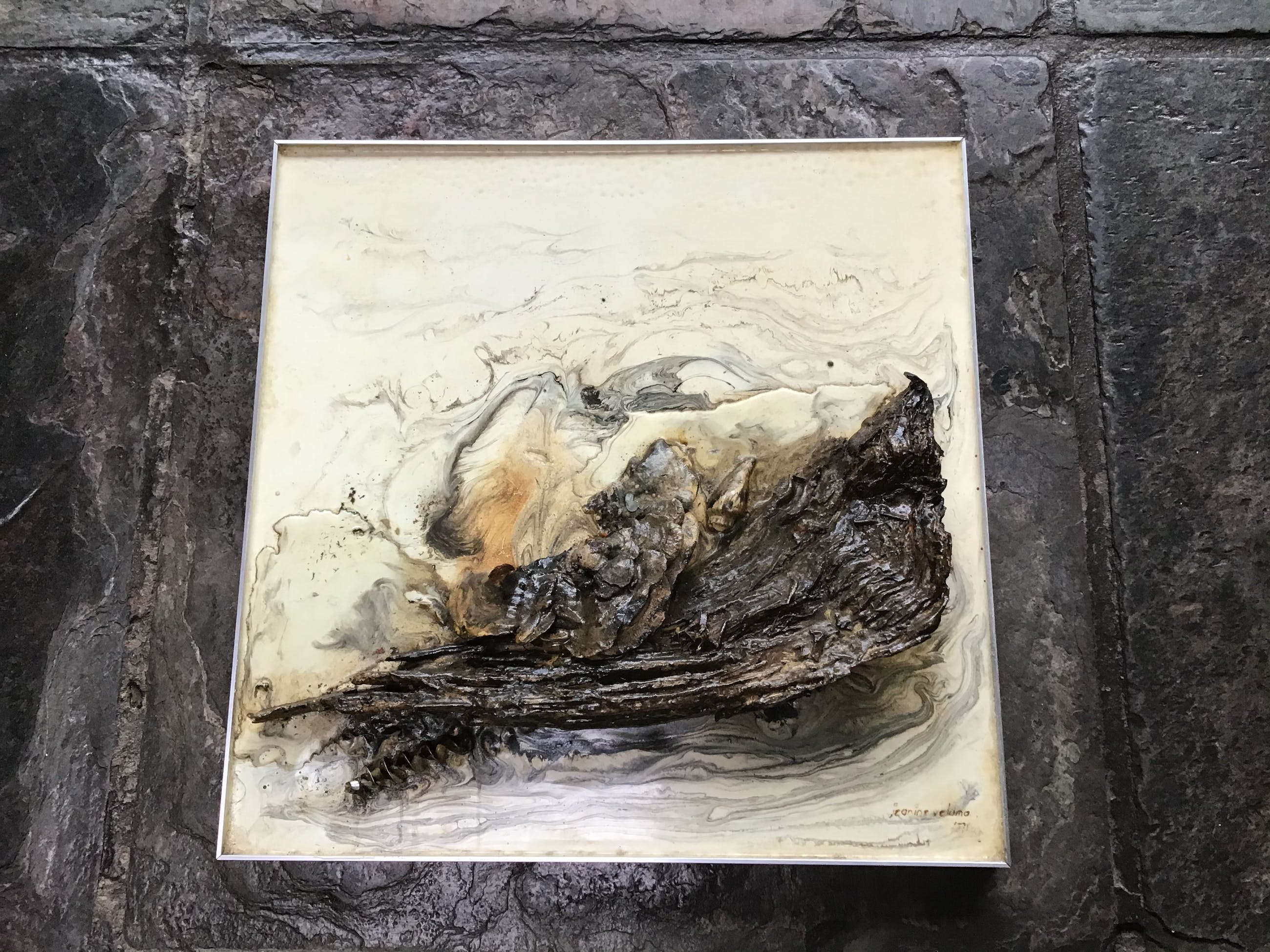 Reliëf met verschillende materialen. Naadloos ingelijst in een aluminium frame. Lijst en reliëf is ondeelbaar. Mooi strak effect. Jeanine Veldman. Jaartal onleesbaar.
