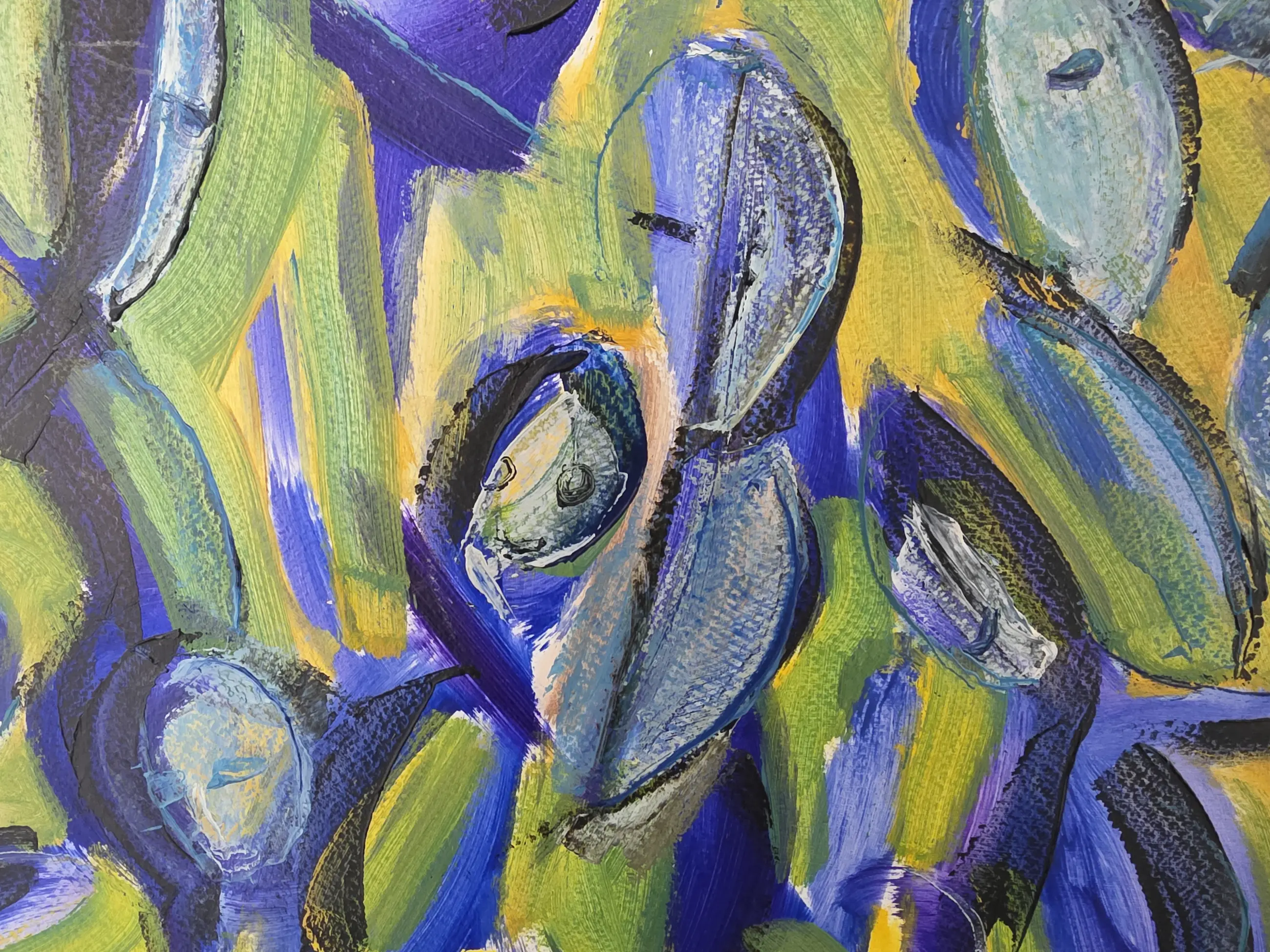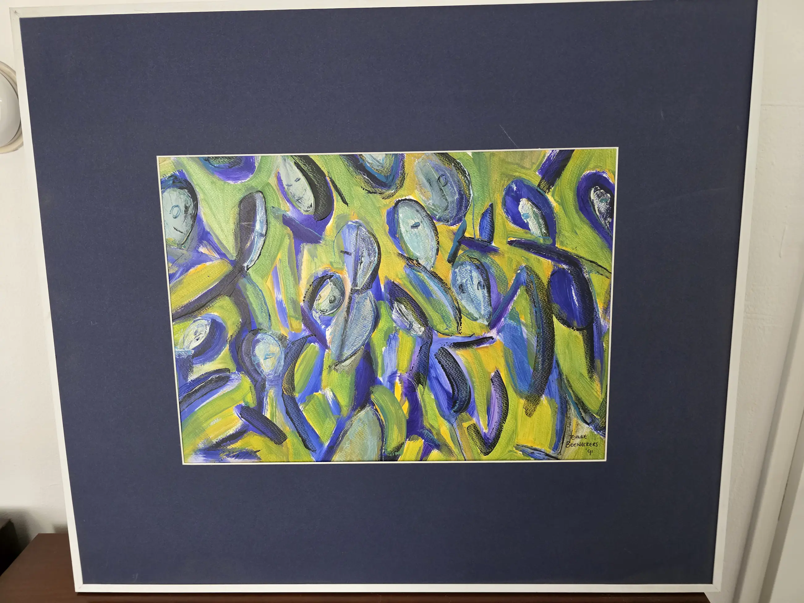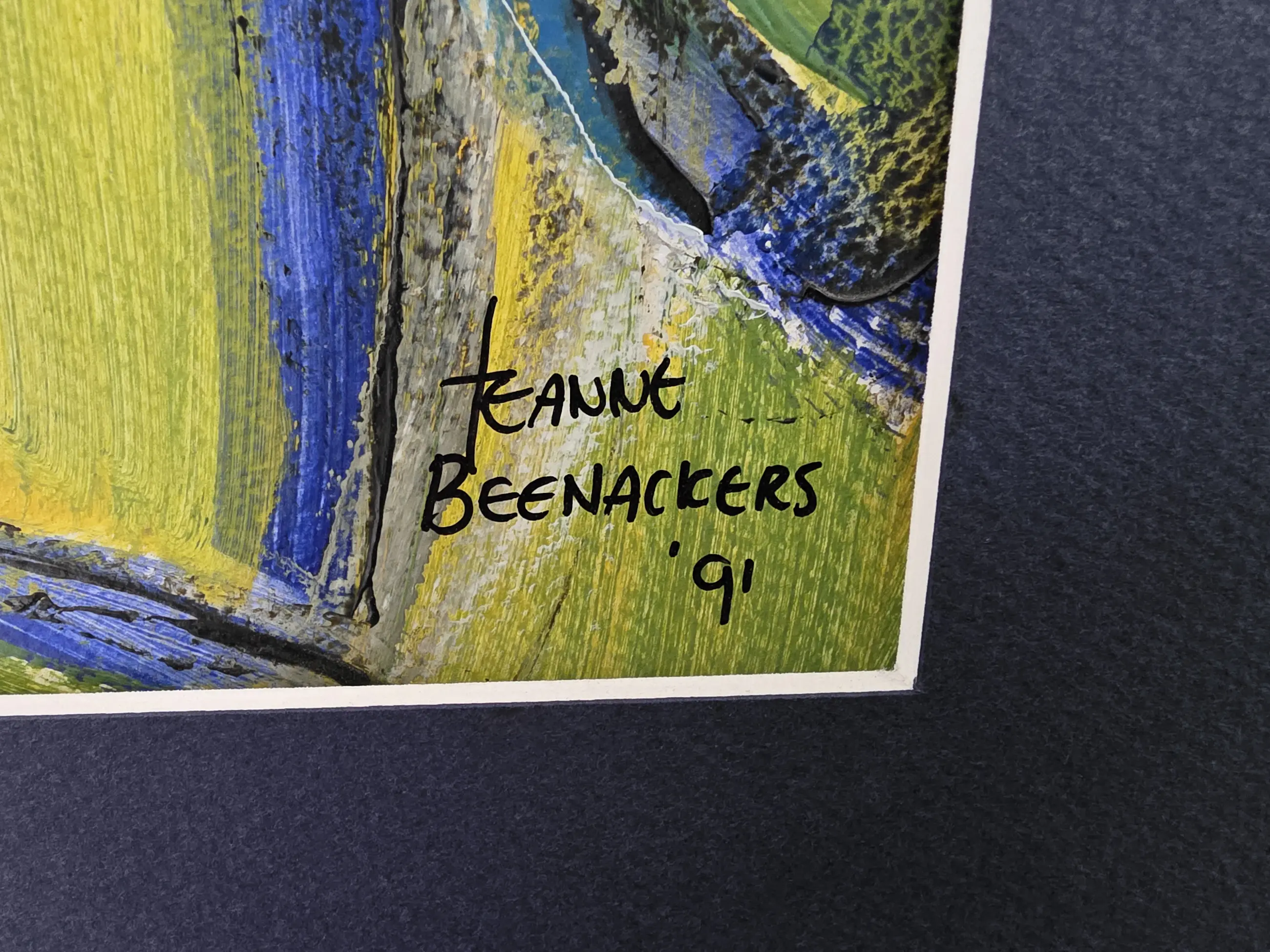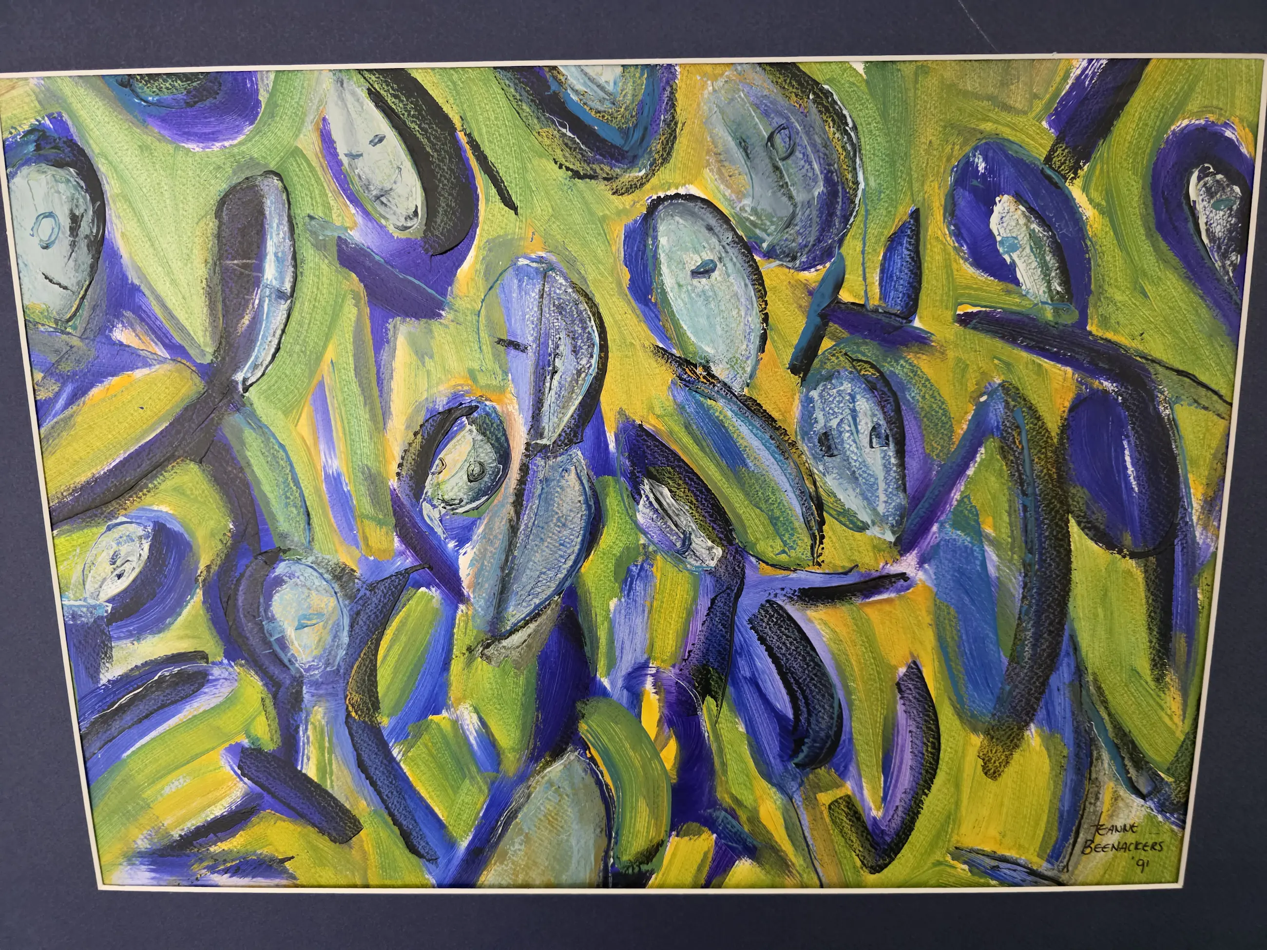 Prachtig acryl schilderij van Jeanne Beenackers, daterend uit 1991. Het kunstwerk toont een levendige compositie van abstracte figuren in heldere kleuren, voornamelijk groen, geel en blauw.