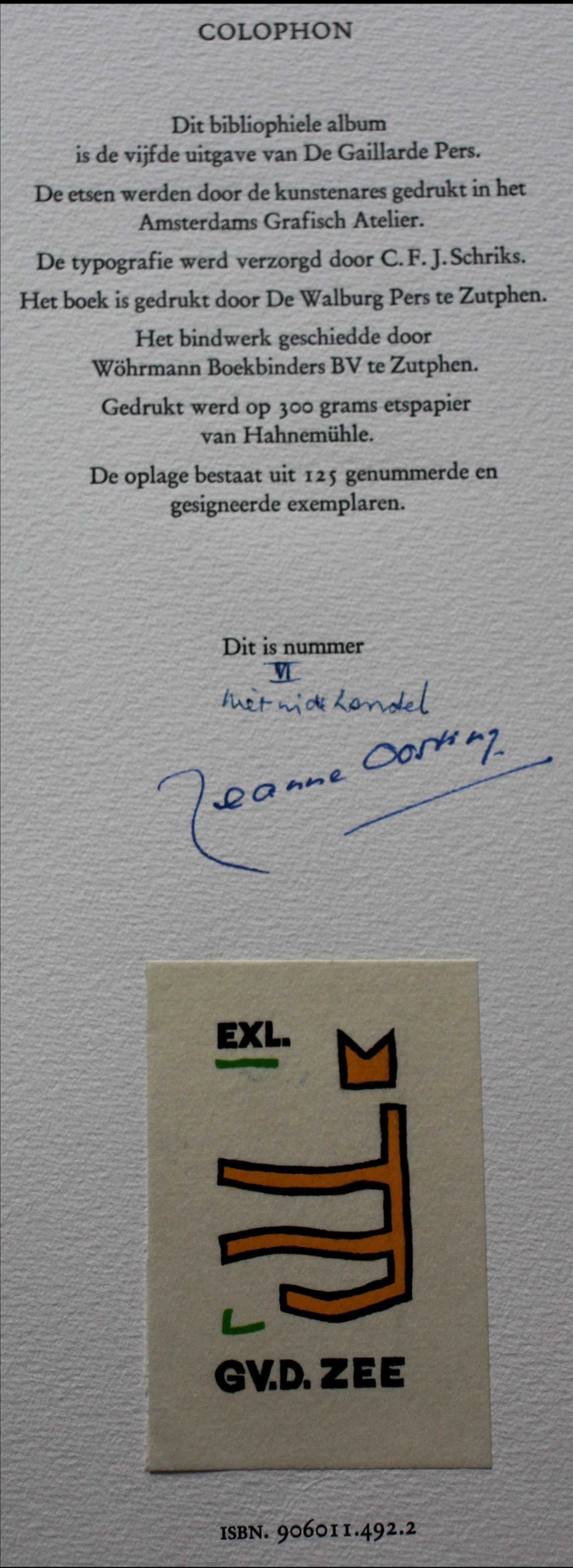 Album met12 etsen van Jeanne Bieruma Oosting. Titel: Une selection des fleurs du mal. Dit bibliophiele album is de vijfde uitgave van De Gaillarde Pers. Jaar: 1976. Oplage: 6/125. Afmetingen album: H41 x b28cm. De colophon is onderaan gesigneerd door de kunstenares. De authenticiteit van het, aangeboden, werk wordt volledig gegarandeerd. Een certificaat van echtheid kan, op verzoek, worden gemaild.
