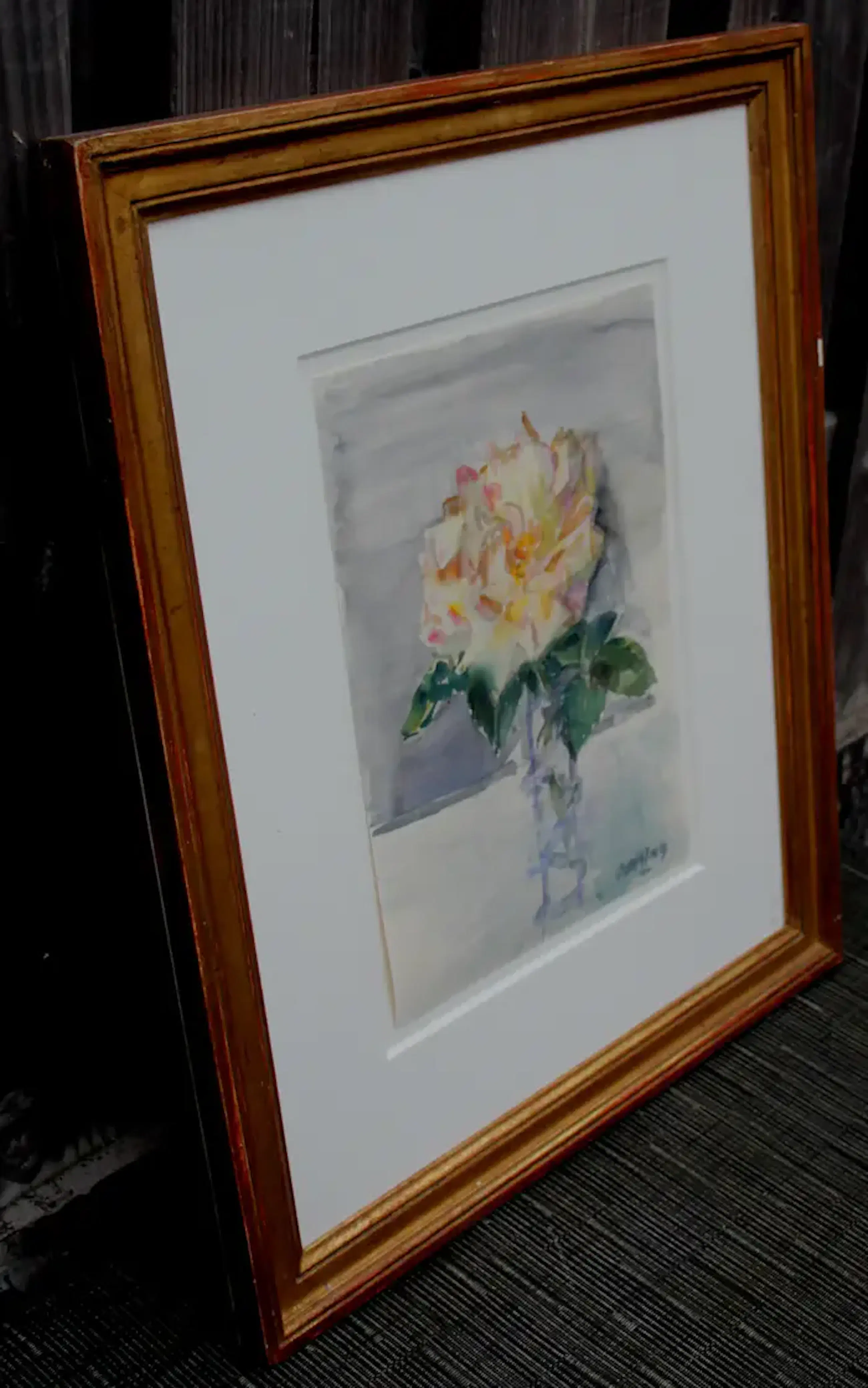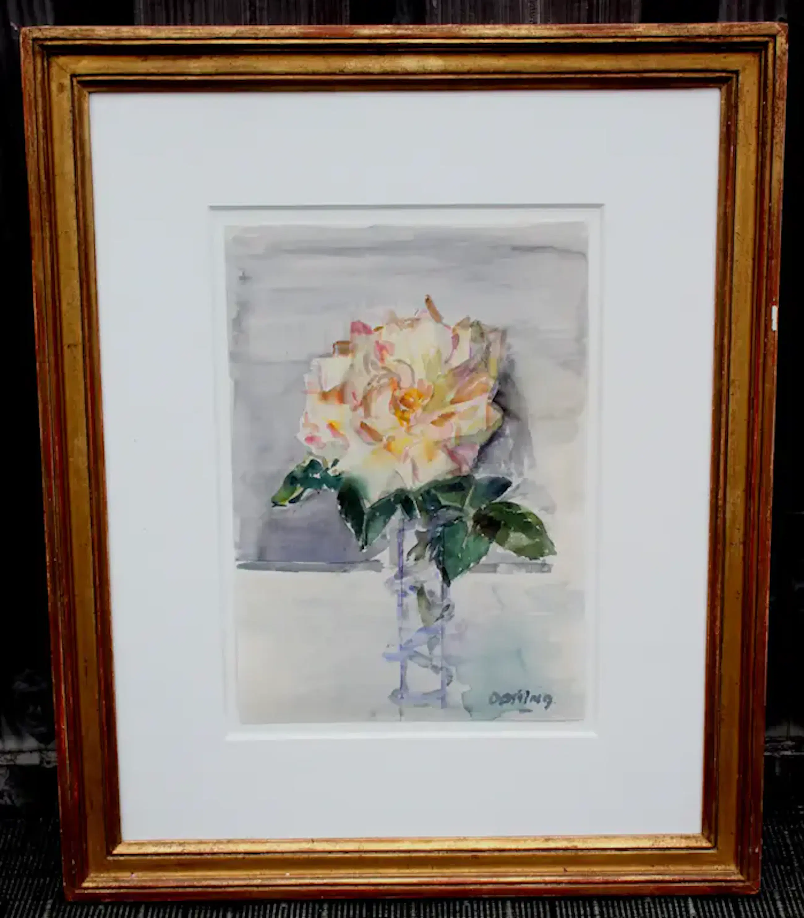 Aquarel van Jeanne Bieruma Oosting. Voorstelling van een stilleven met roos. Afmetingen incl lijst: H58 x b48cm. Afmetingen voorstelling: H33 x b23.5cm. Het werk is rechts onderaan, gesigneerd door de kunstenares. De authenticiteit van het, aangeboden, werk wordt volledig gegarandeerd. Een certificaat van echtheid kan, op aanvraag, worden gemaild.