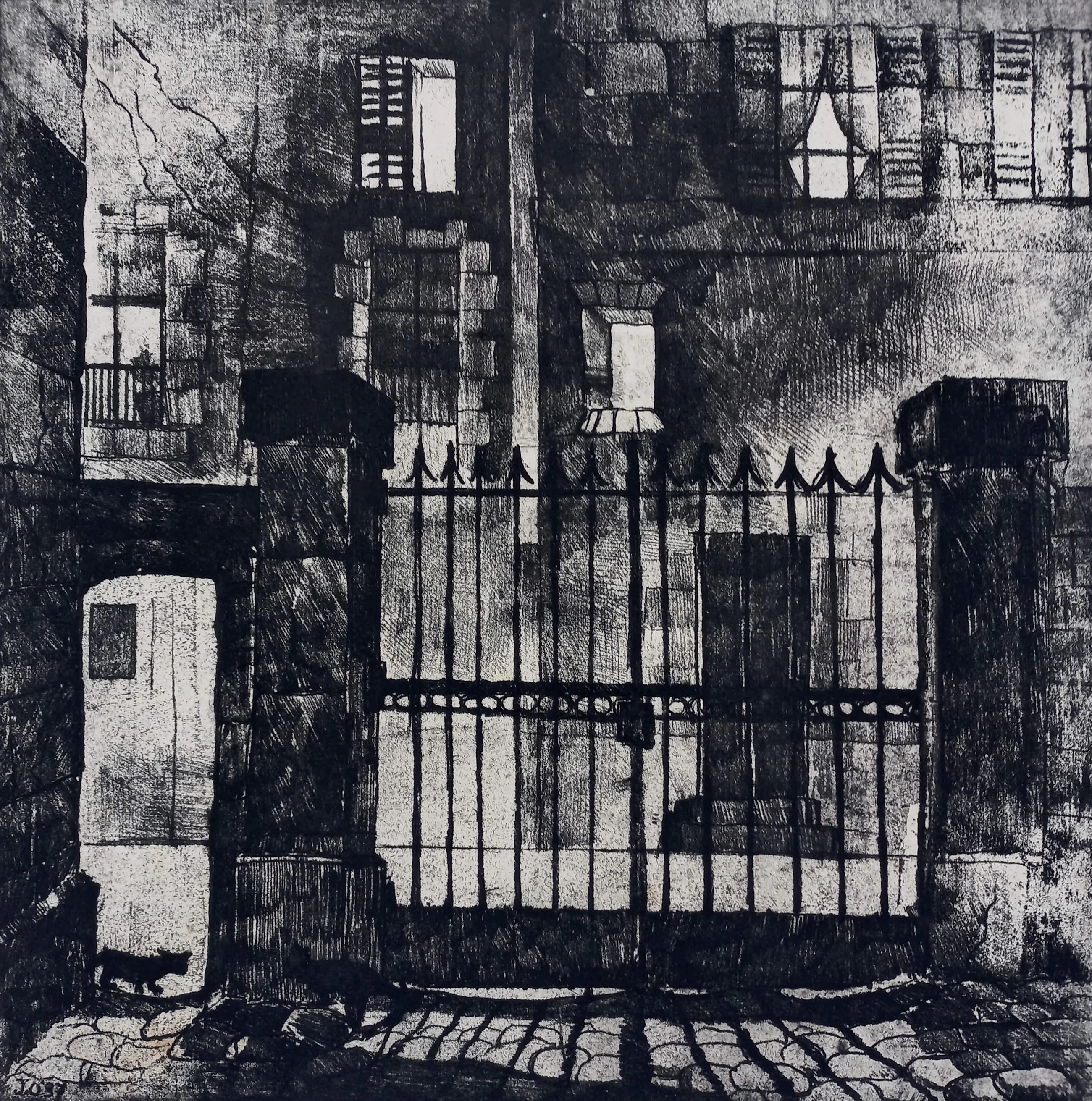 Prachtige ets uit de portfolio Les fenetres, le soir (1937); Oosting’s gewilde Parijse periode. Vernis mou ets op Arches papier, met potlood gesigneerd en getiteld, in de plaat gemonogrammeerd en gedateerd. In zeer goede conditie.